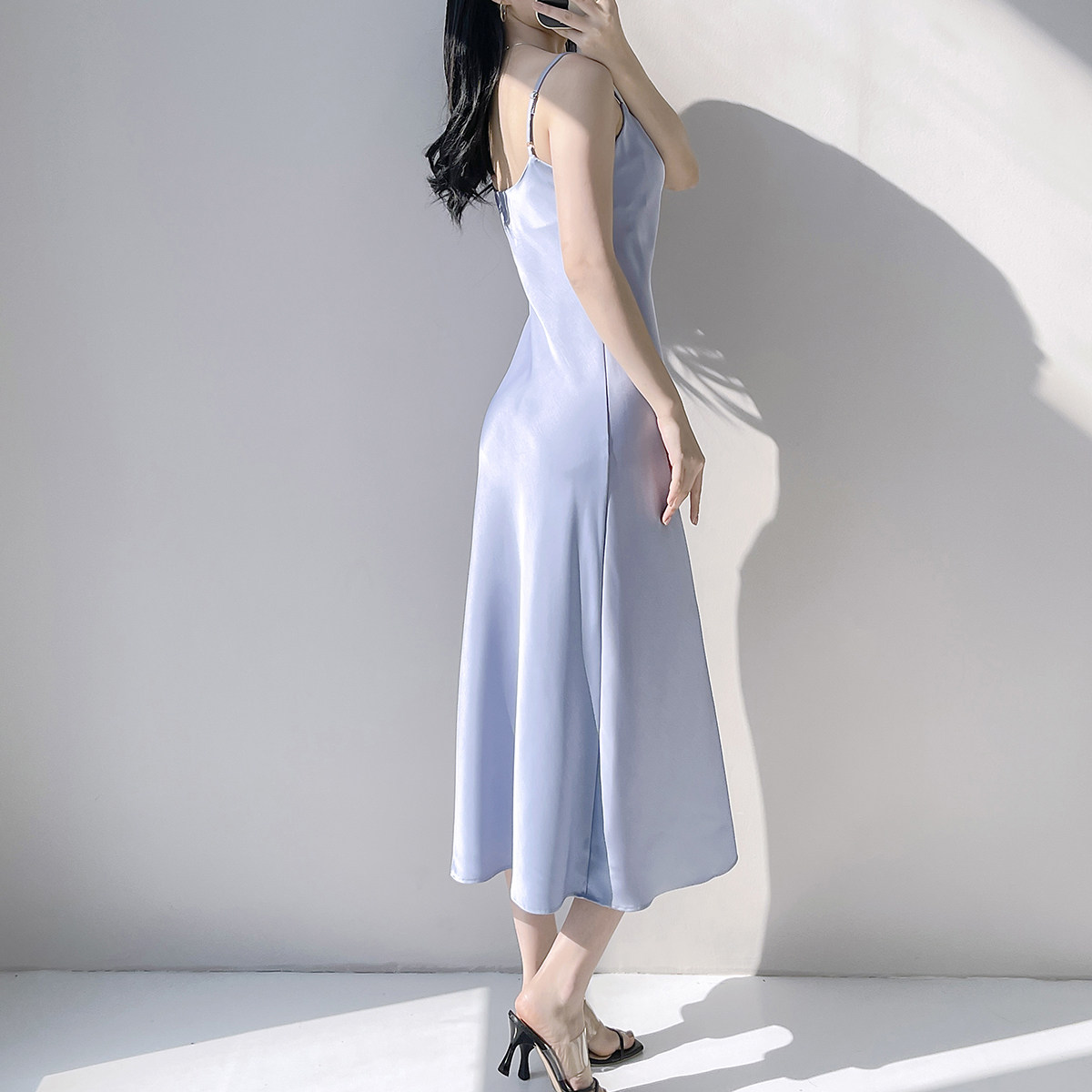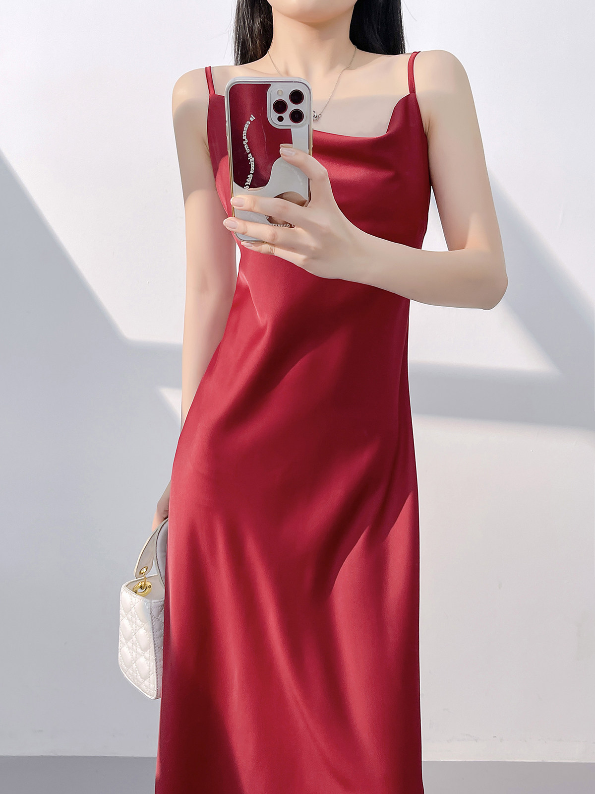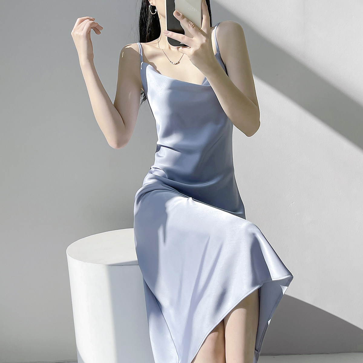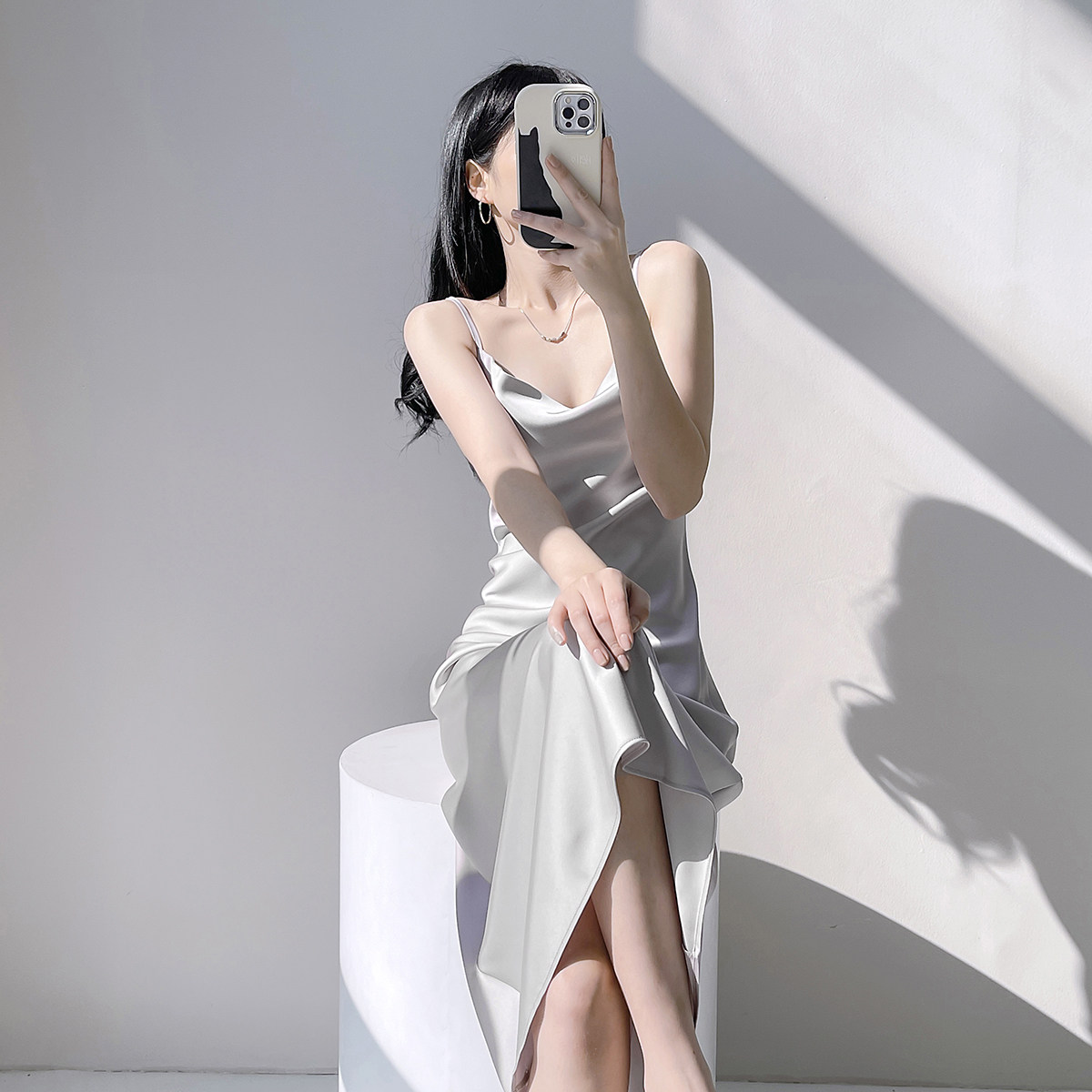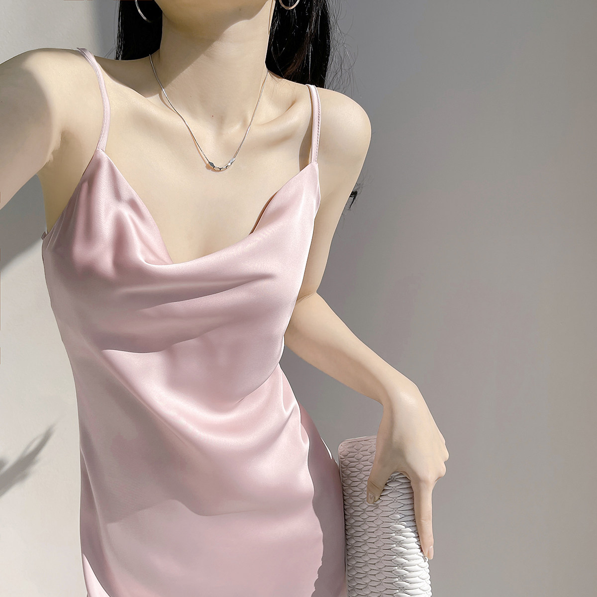 Lady's satin dress, acetic acid-flavored collar, high-end niche, sexy suspender dress, suit with long skirt