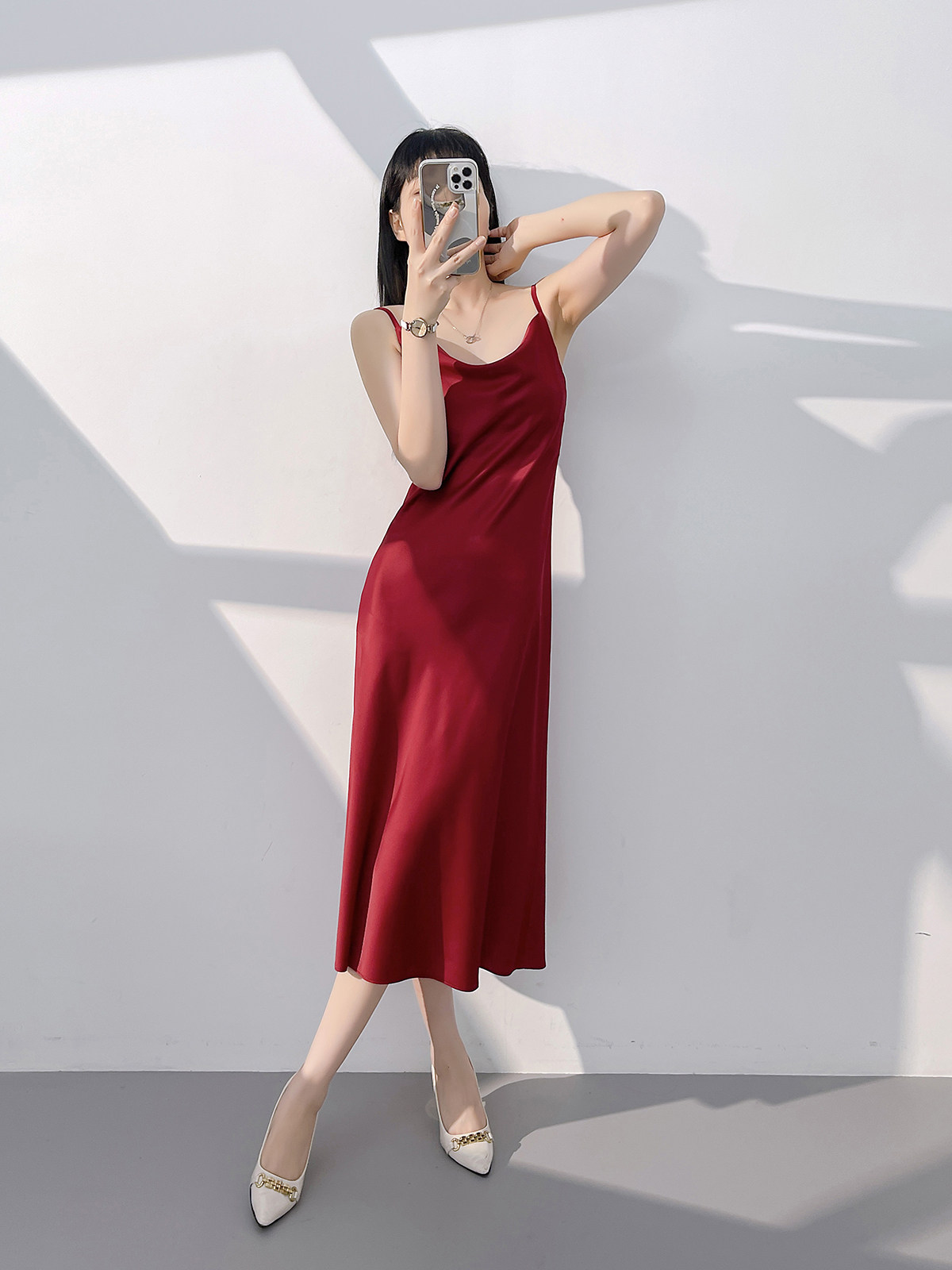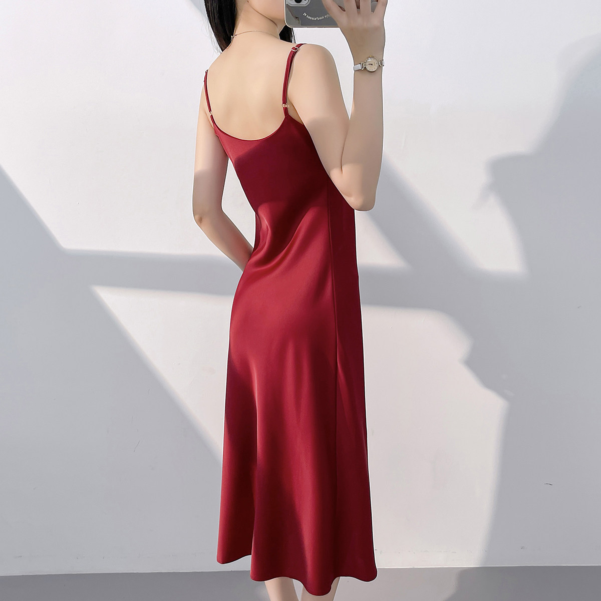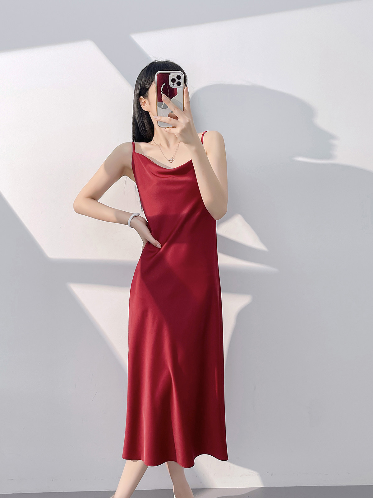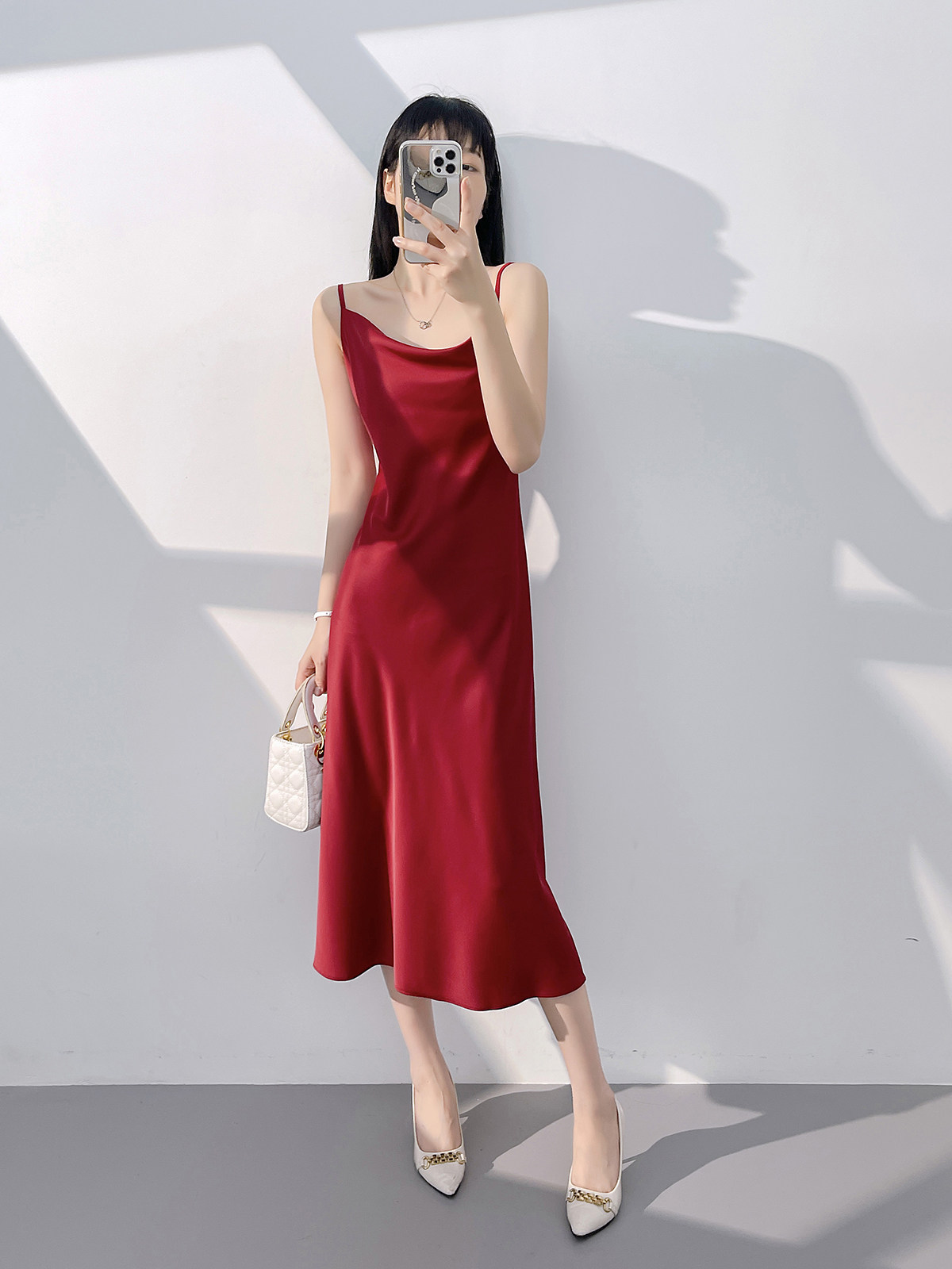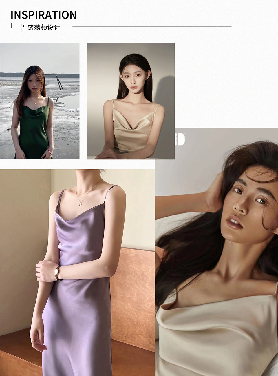 Lady's satin dress, acetic acid-flavored collar, high-end niche, sexy suspender dress, suit with long skirt