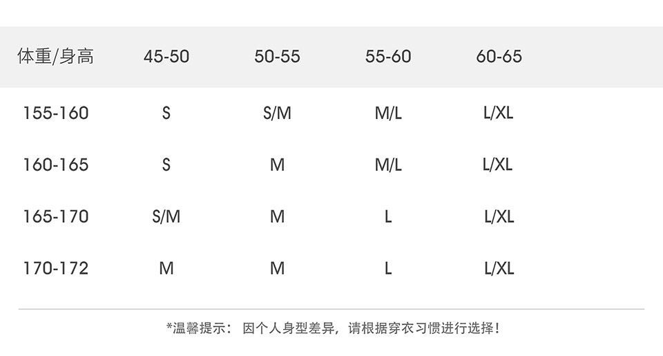 China (cm) 160-165/84-86 165-170 / 88-90 167-172 / 92-96 168-173 / 98-102 170-176 / 106-110