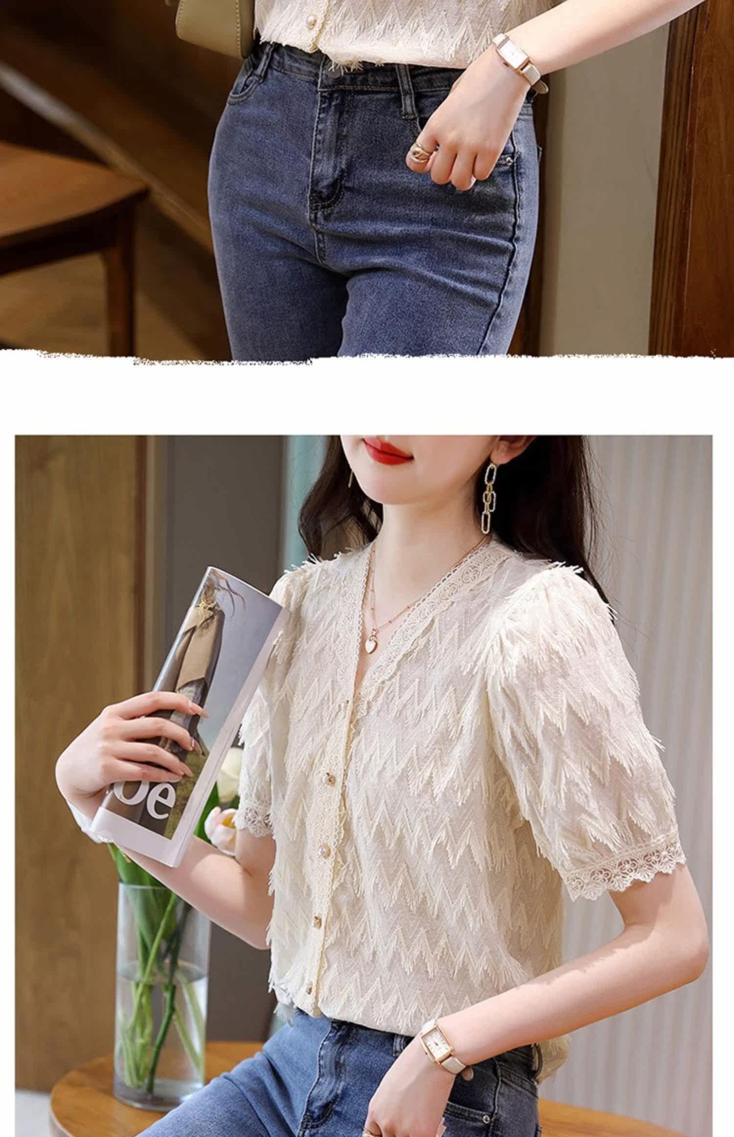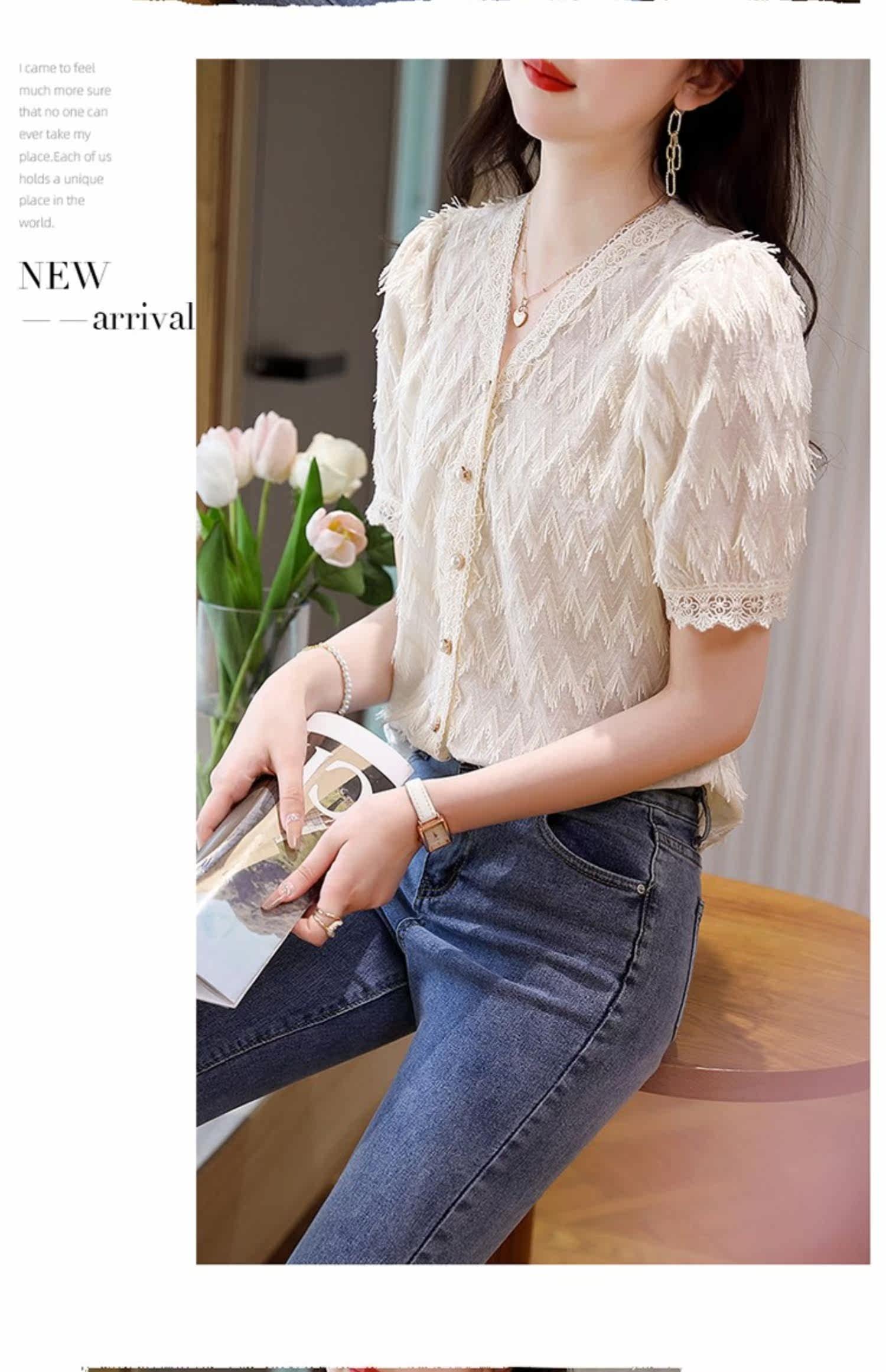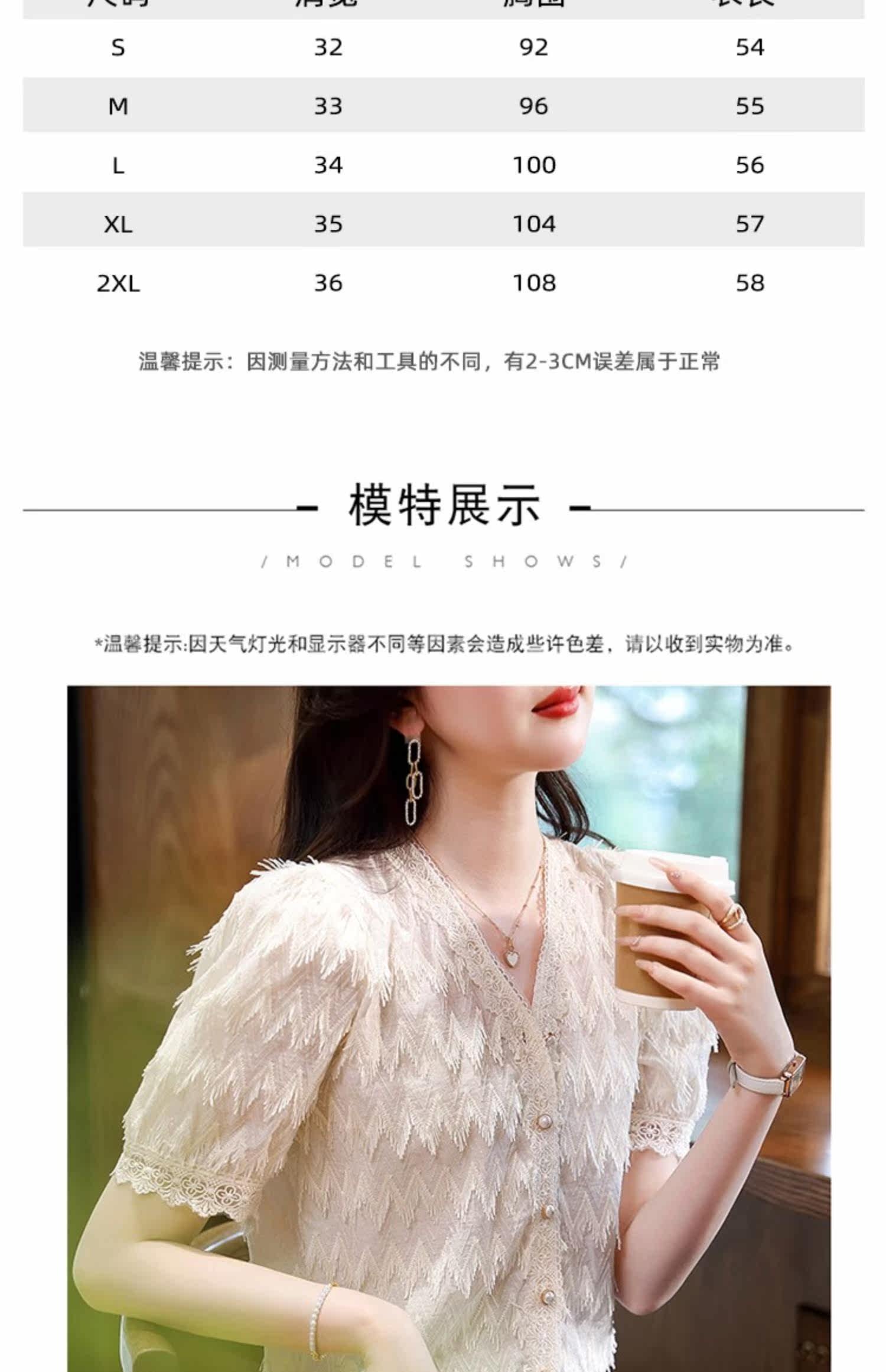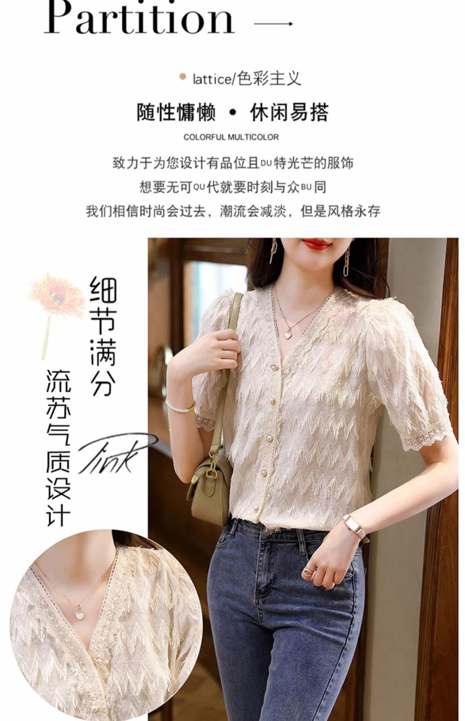 Ice Silk Chiffon Shirt for Women, New Summer Fashion V-Neck Lace Blouse, Short-Sleeved Top, Thin Large Size Shirt