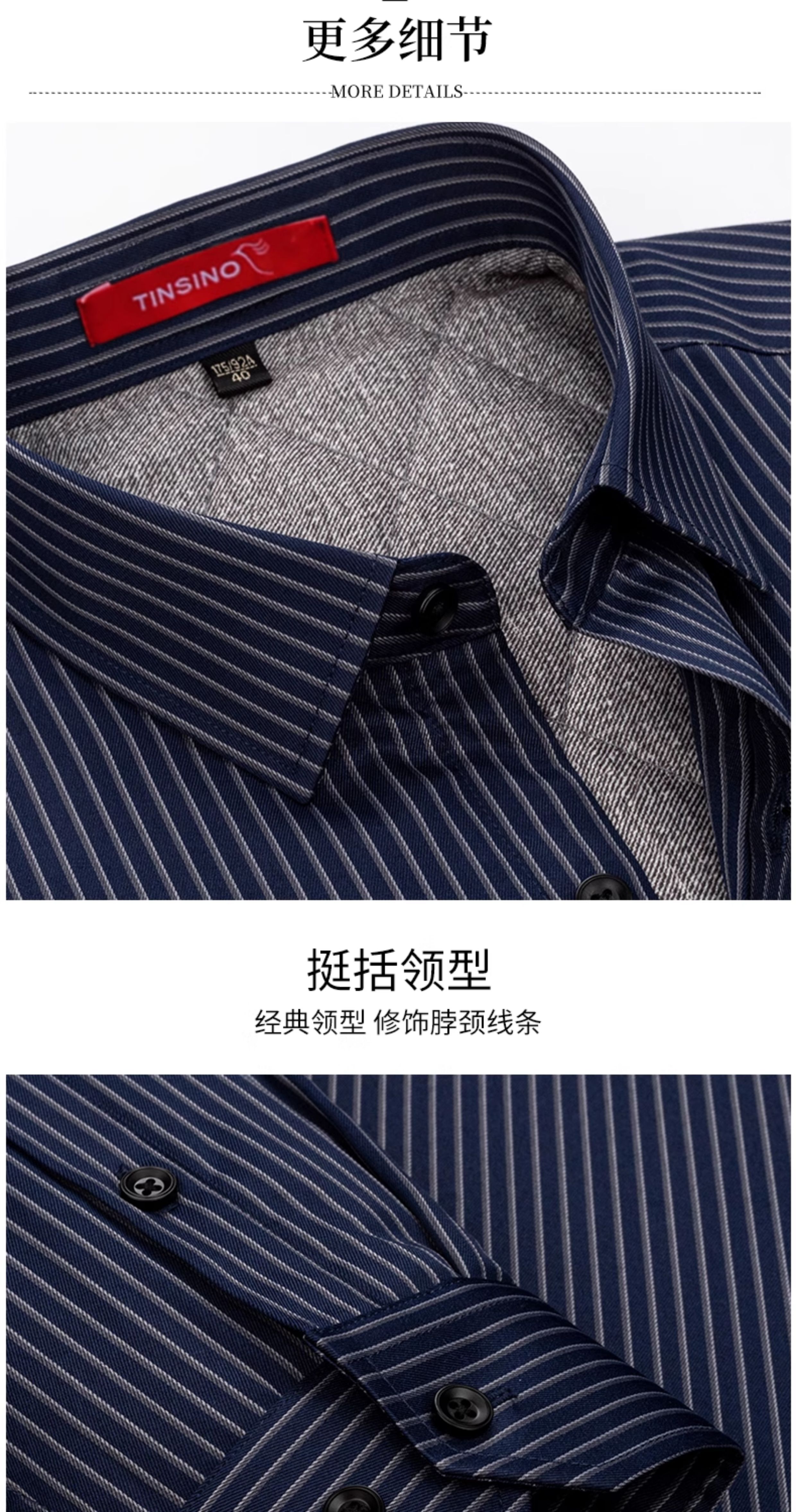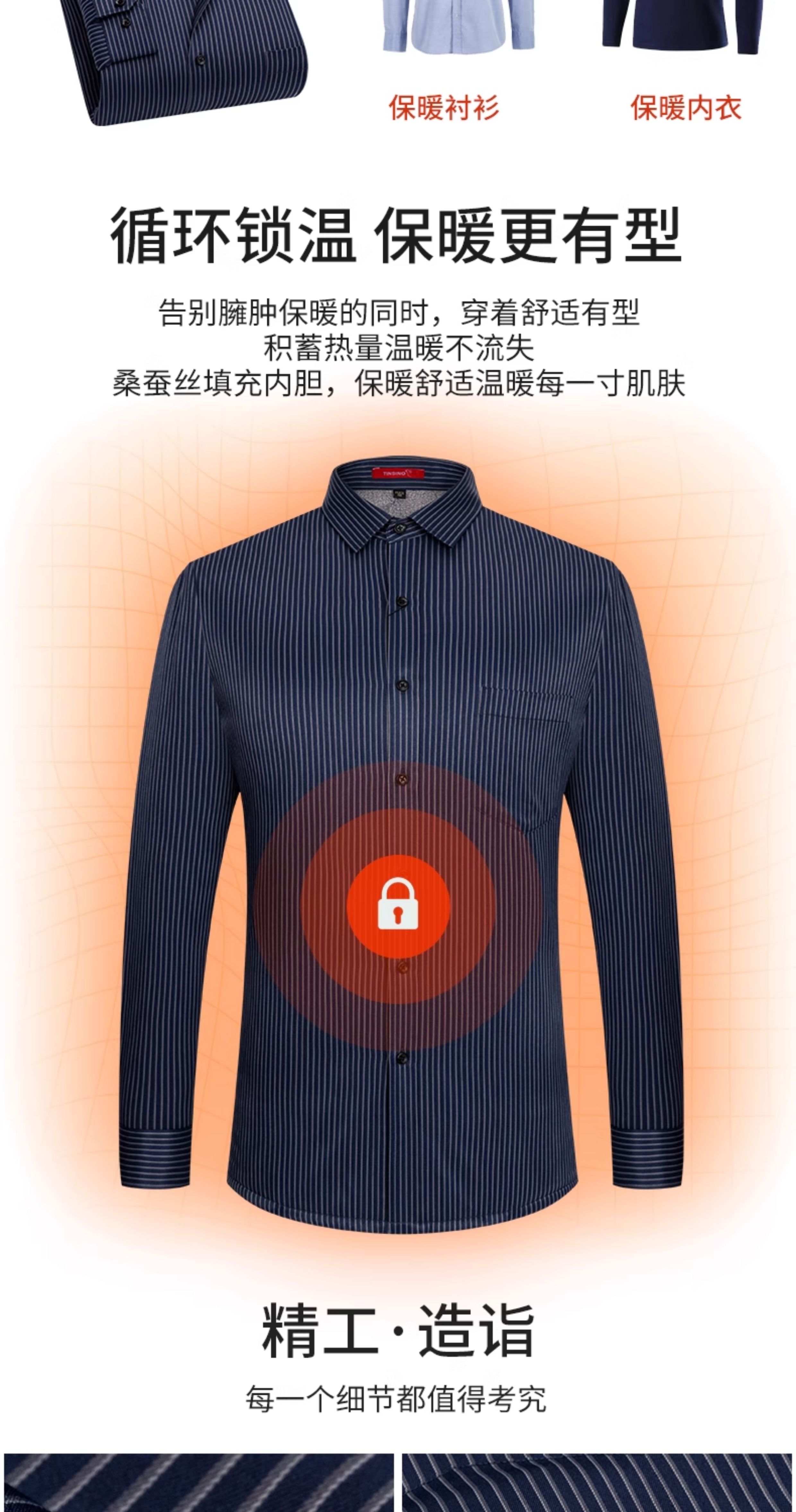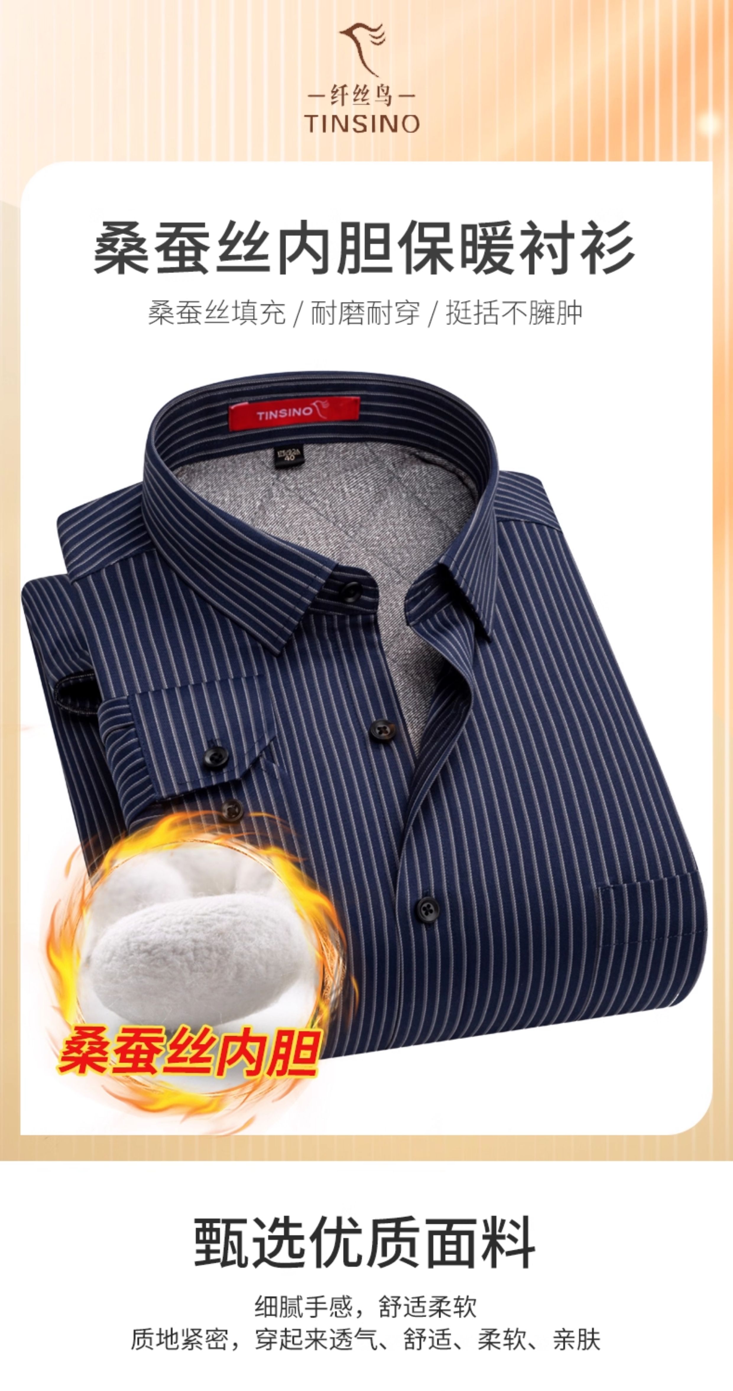 Men's Thermal Shirt with Silk Lining, Thickened for Winter, Plus Size, Middle-Aged Dad Style, Striped Quilted Mulberry Silk Shirt