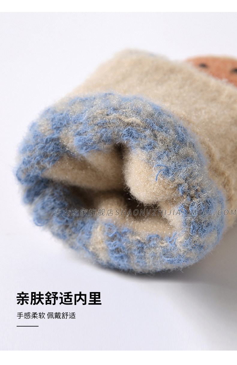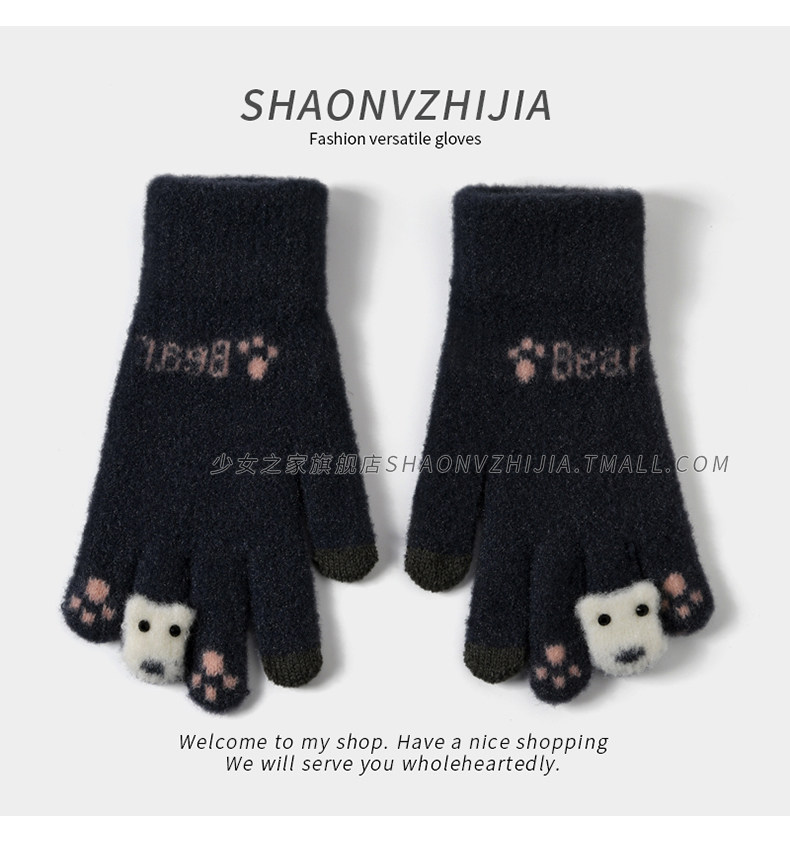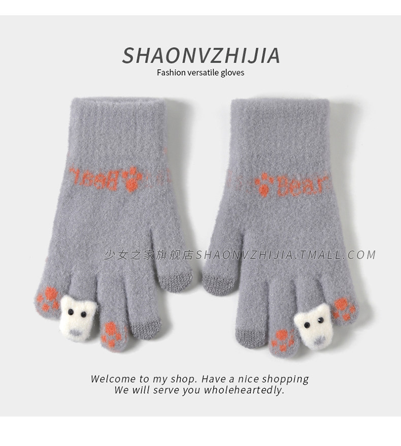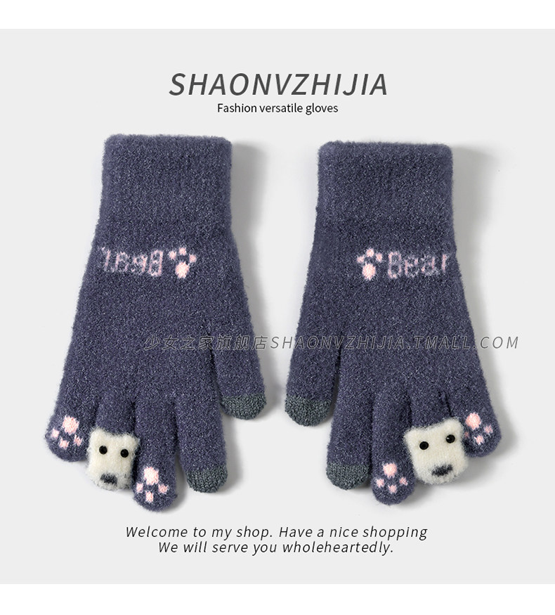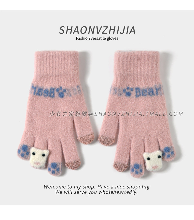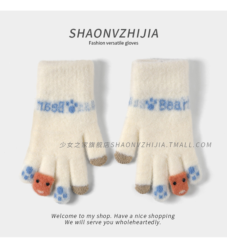 New cute knitted woolen gloves for women in winter with velvet and thickening for students to keep warm for five-finger riding and can touch the screen to prevent cold