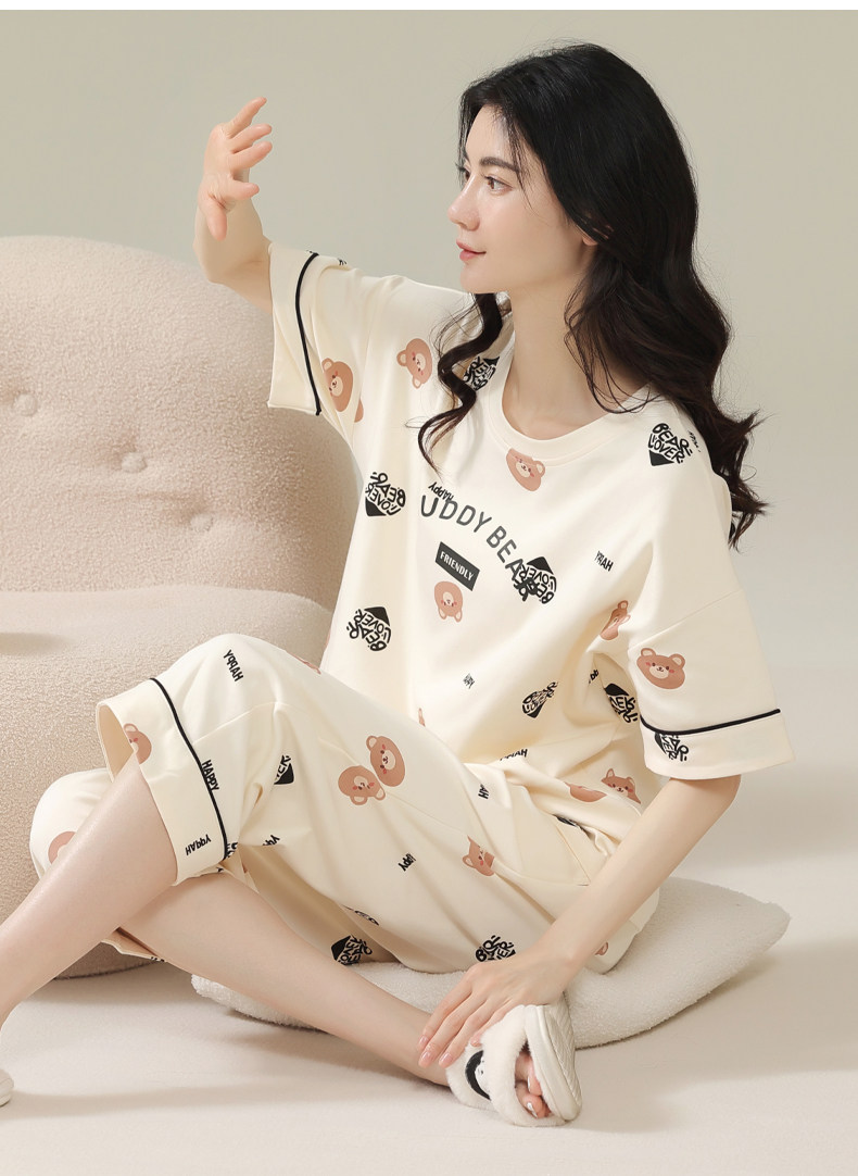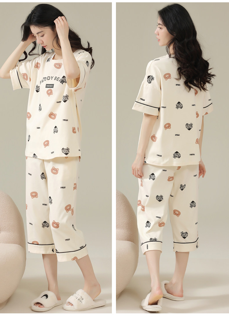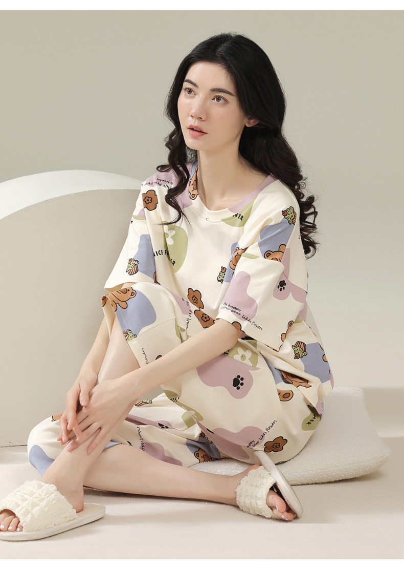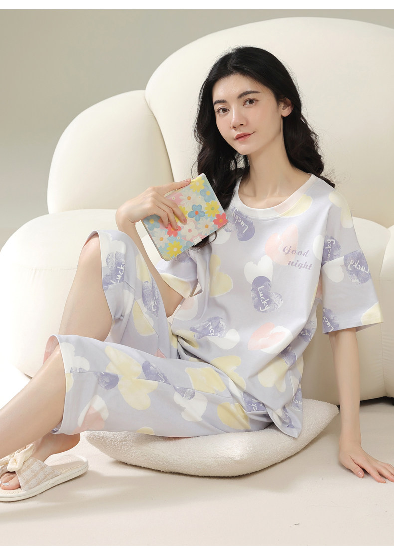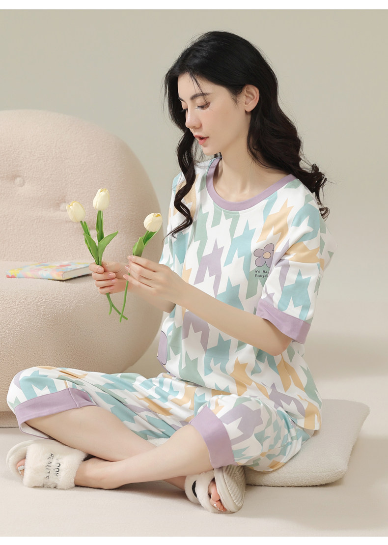 Pure cotton pajamas for women, summer short-sleeved cropped pants, high-end thin casual round neck, new high-end home wear set