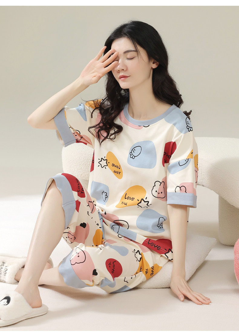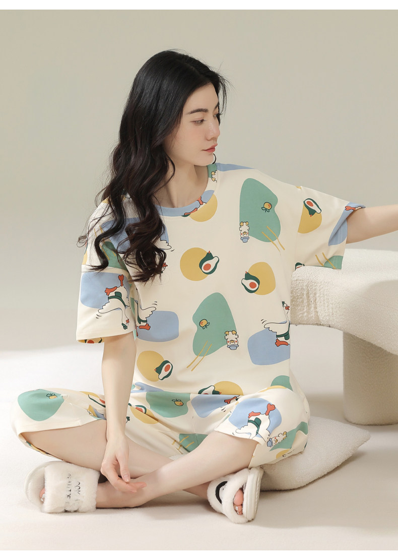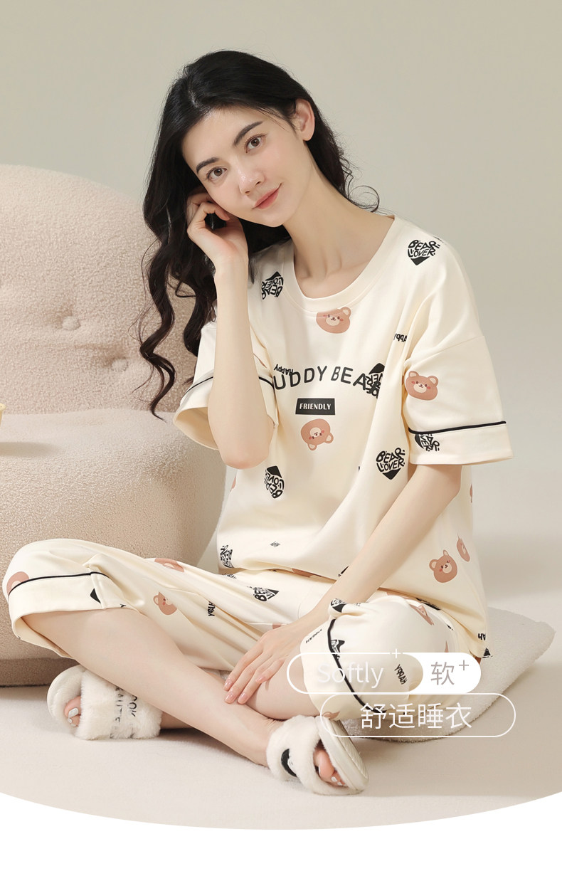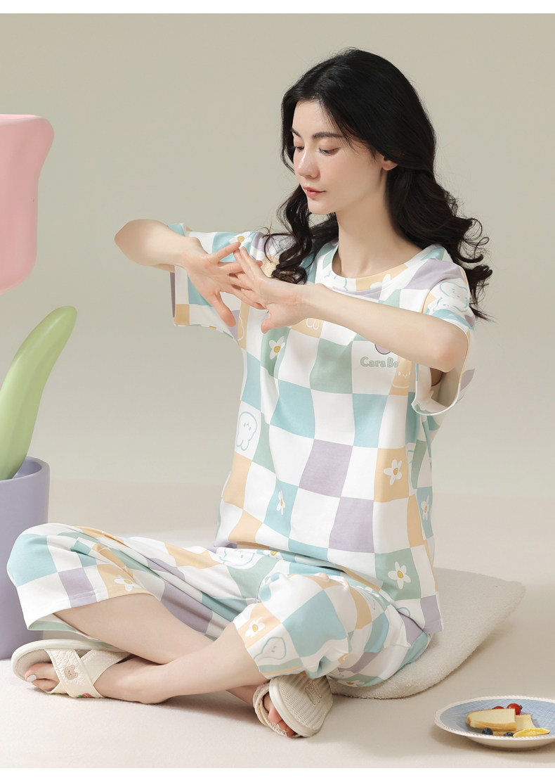 Pure cotton pajamas for women, summer short-sleeved cropped pants, high-end thin casual round neck, new high-end home wear set