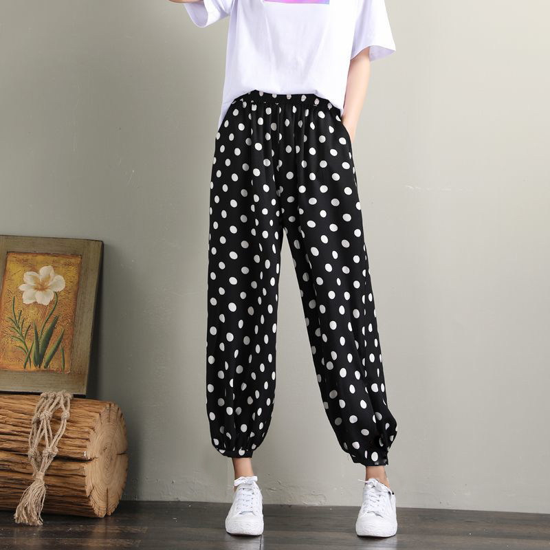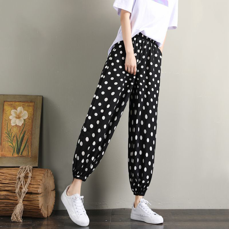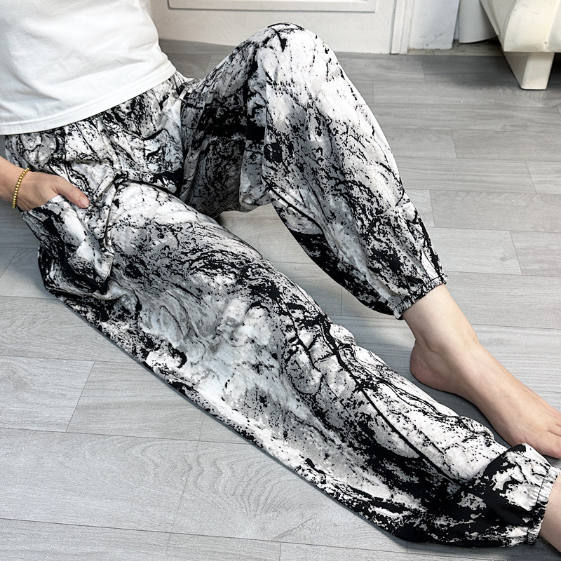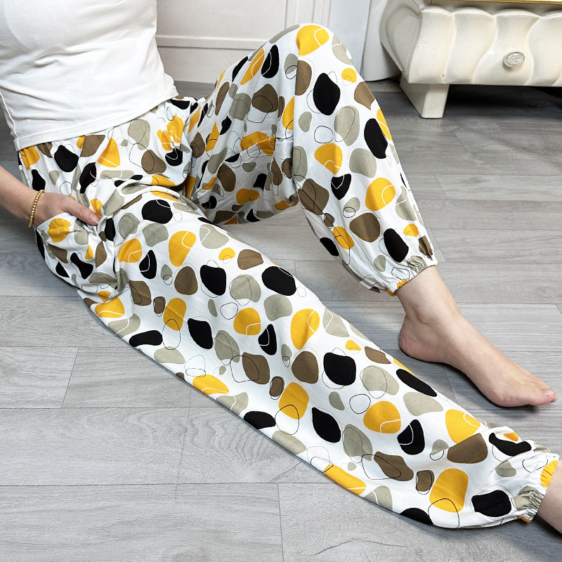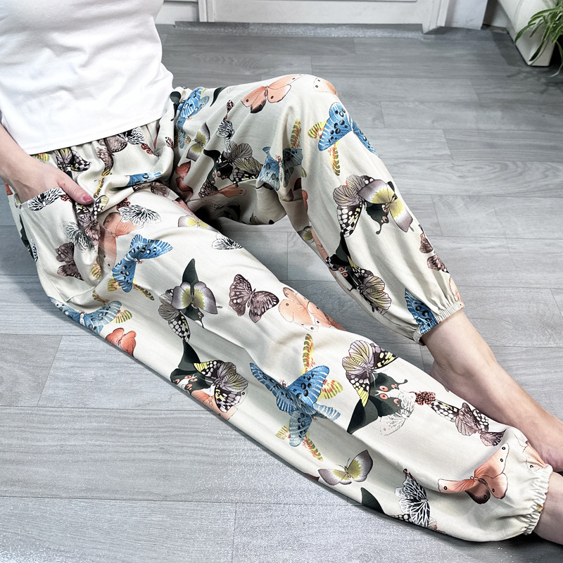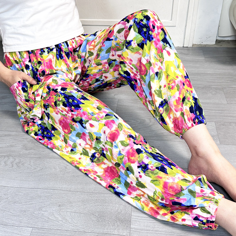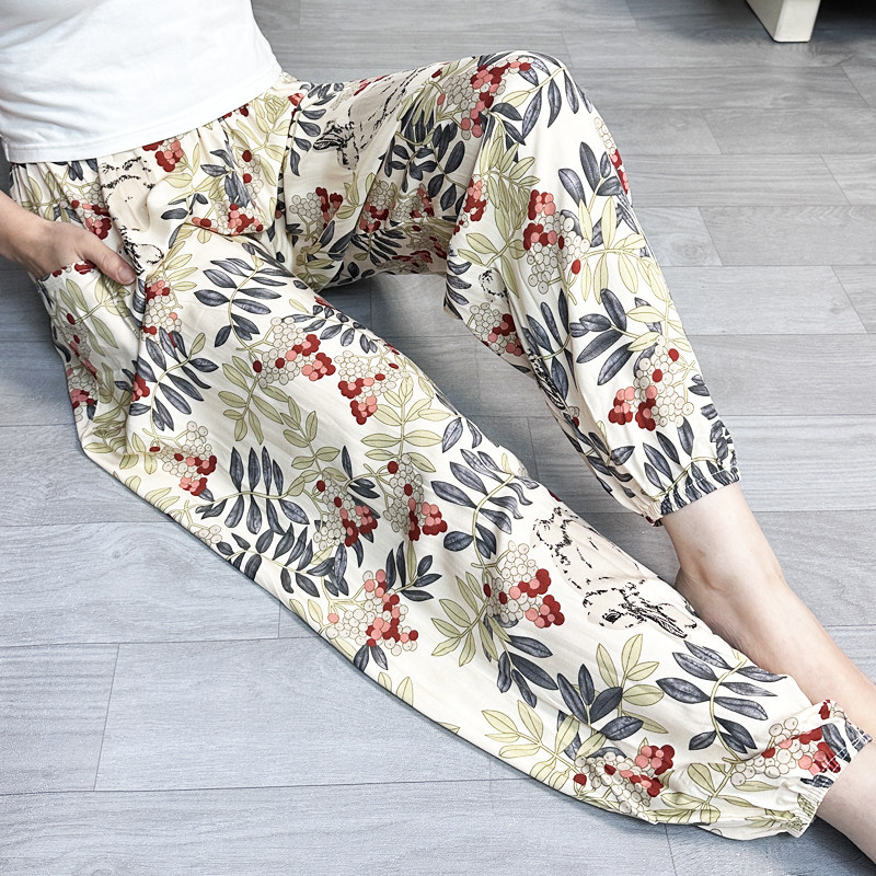 Летние пижамные брюки из хлопка и шелка для женщин, пляжные брюки-фонарики из вискозы больших размеров с защитой от комаров, домашние длинные брюки с манжетами для весны и осени.