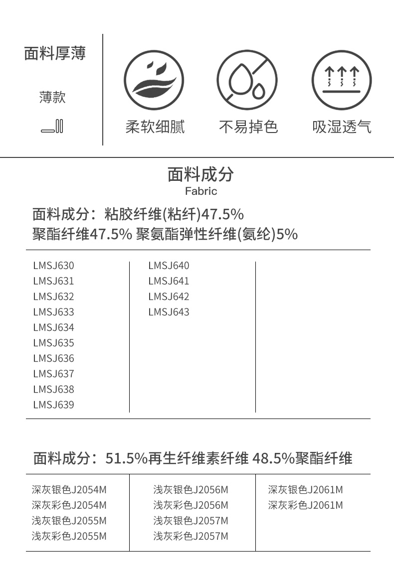 面料材质成分 粘胶纤维(粘纤)47.5% 聚酯纤维47.5% 聚氨酯弹性纤维(氨纶)5%