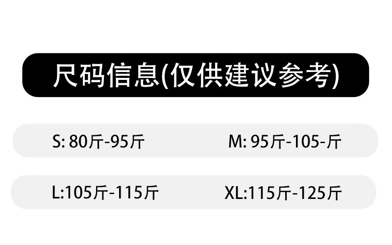 Size S 40kg-47.5kg,M 47.5kg -105-Jin,L 52.5kg-57.5kg,XL 57.5kg-62.5kg,XXL 62.5kg-67.5kg