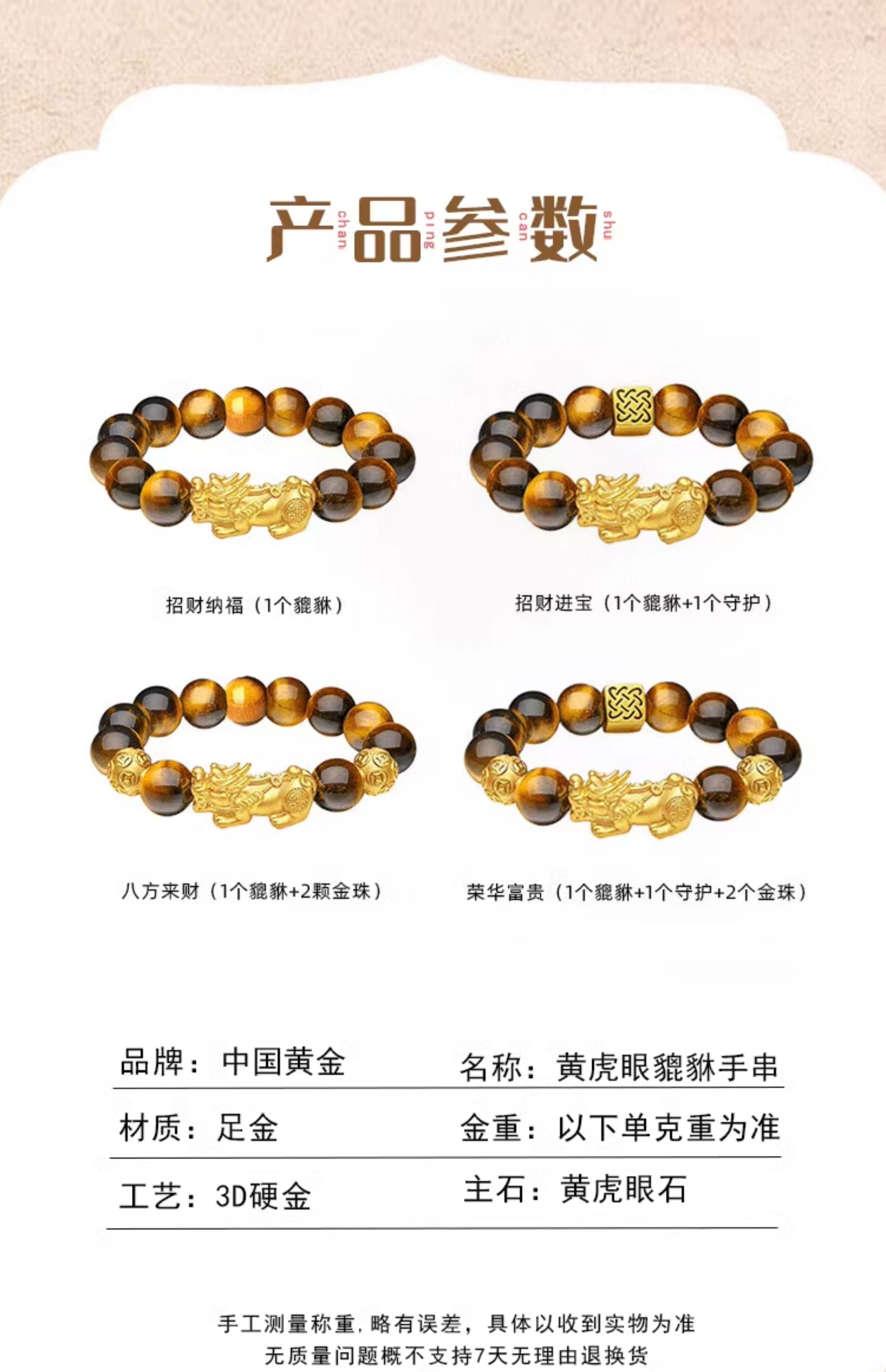 Specifications 10mm Yellow Tiger's Eye [Attract Wealth & Blessings] Approx. 2.5g (1 Pixiu) - Thickened Version,12mm Yellow Tiger's Eye [Attract Wealth & Blessings] Approx. 3.4g (1 Pixiu) - Thickened Version,14mm Yellow Tiger's Eye [Attract Wealth & Blessings] Approx. 4.1g (1 Pixiu) - Thickened Version,10mm Yellow Tiger's Eye [Attract Wealth & Treasure] Approx. 3.2g (1 Pixiu + 1 Guardian) - Thickened Version,12mm Yellow Tiger's Eye [Attract Wealth & Treasure] Approx. 4.8g (1 Pixiu + 1 Guardian) - Thickened Version,14mm Yellow Tiger's Eye [Attract Wealth & Treasure] Approx. 5.4g (1 Pixiu + 1 Guardian) - Thickened Version,10mm Yellow Tiger's Eye "Wealth from All Directions" Bracelet, Approximately 4.2g (1 Pixiu + 2 Gold Beads), Thickened Version,12mm Yellow Tiger's Eye "Fortune from All Directions" Bracelet, Approximately 6g (1 Pixiu + 2 Gold Beads), Thickened Version,14mm Yellow Tiger's Eye "Wealth from All Directions" Bracelet, Approximately 7.1g (1 Pixiu + 2 Gold Beads), Thickened Version,10mm Yellow Tiger's Eye [Prosperity & Wealth] Approx. 4.9g (1 Pixiu + 1 Guardian + 2 Gold Beads) - Thickened Version,12mm Yellow Tiger's Eye "Prosperity & Wealth" Bracelet, Approximately 7.2g (1 Pixiu + 1 Guardian + 2 Gold Beads), Thickened Version,14mm Yellow Tiger's Eye [Prosperity & Wealth] Approx. 8.5g (1 Pixiu + 1 Guardian + 2 Gold Beads) - Thickened Version,8mm Yellow Tiger's Eye [Prosperity & Wealth] Approx. 1.2g (1 Pixiu + 2 Gold Beads + 1 Guardian),6mm Yellow Tiger's Eye [Prosperity & Wealth] Approx. 0.86g (1 Pixiu + 1 Guardian + 2 Gold Beads)
