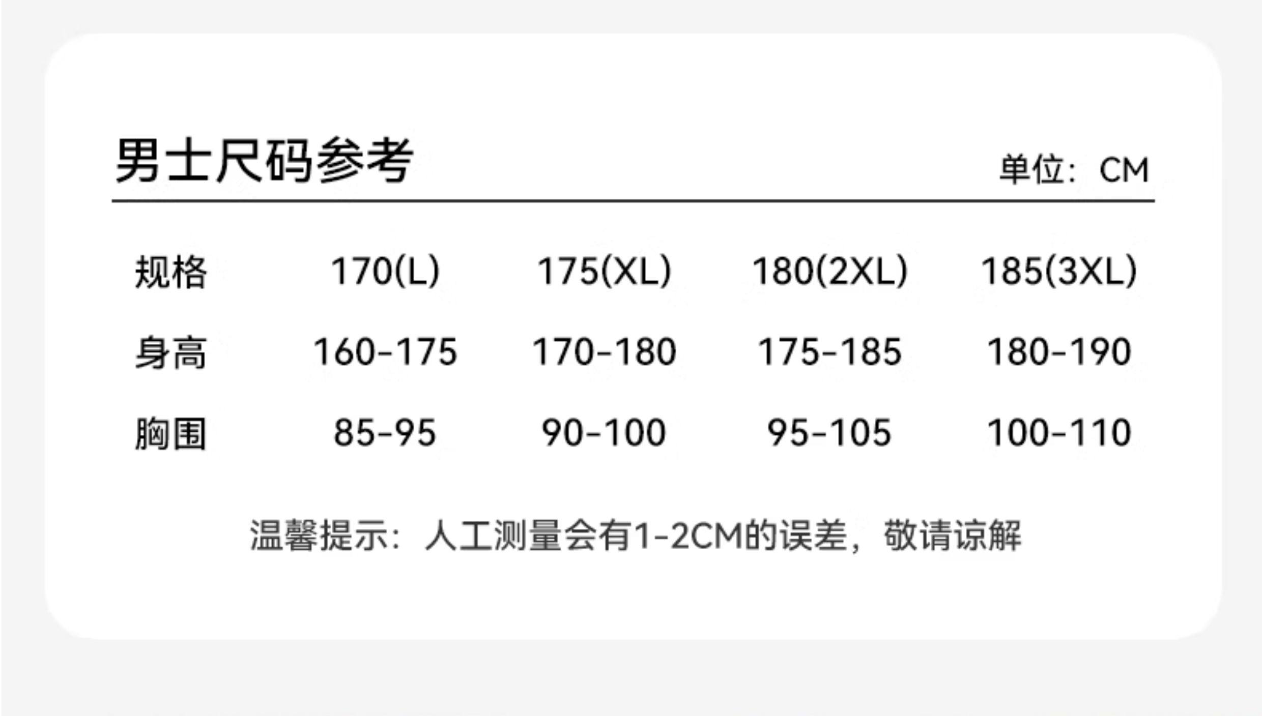 China (cm) 160-165/84-86 165-170 / 88-90 167-172 / 92-96 168-173 / 98-102 170-176 / 106-110