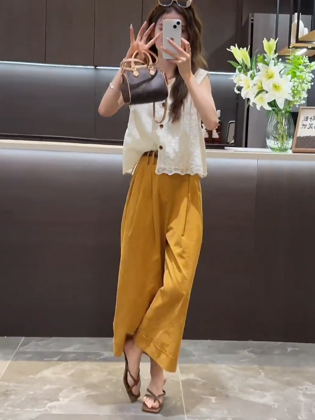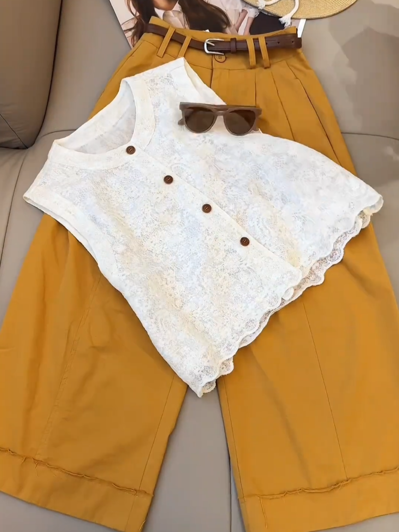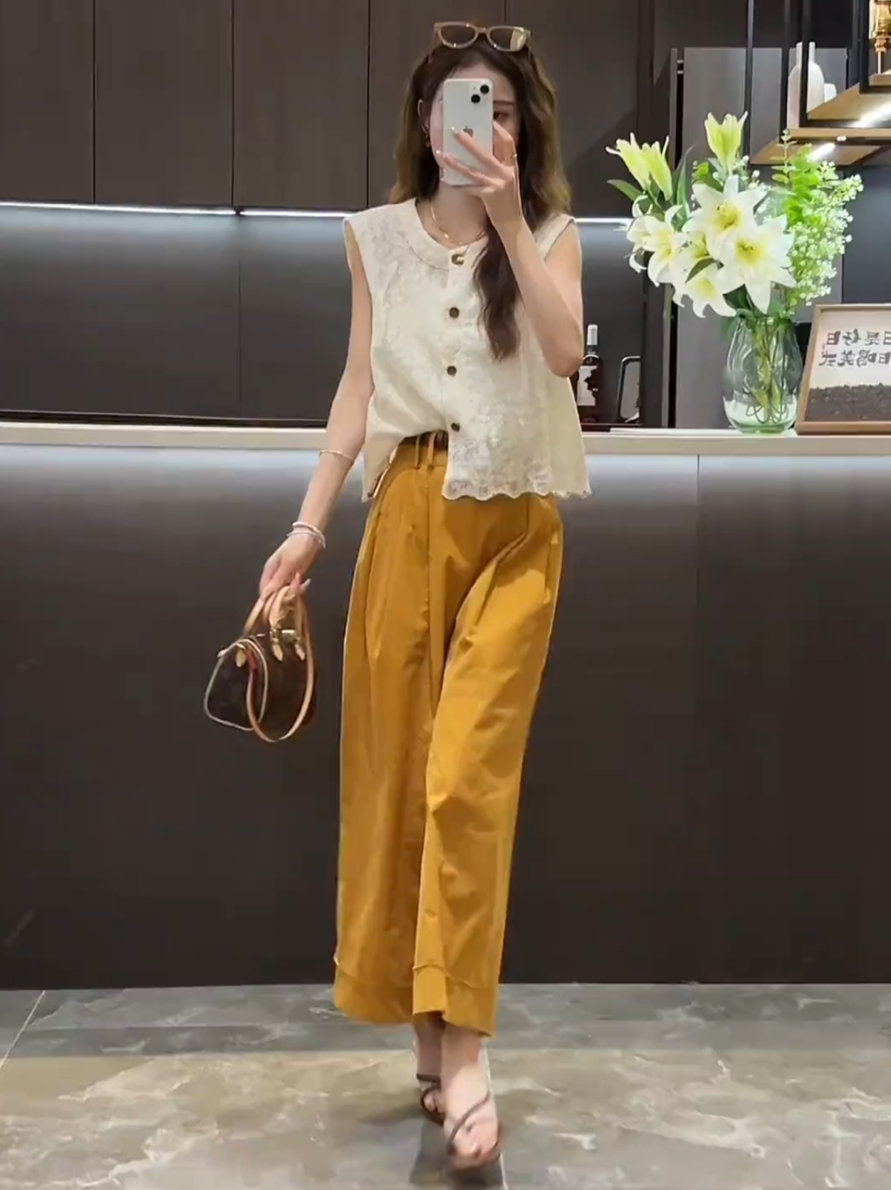 今年流行的夏装套装镂空无袖上衣阔腿裤小个子显高时尚减龄两件套
