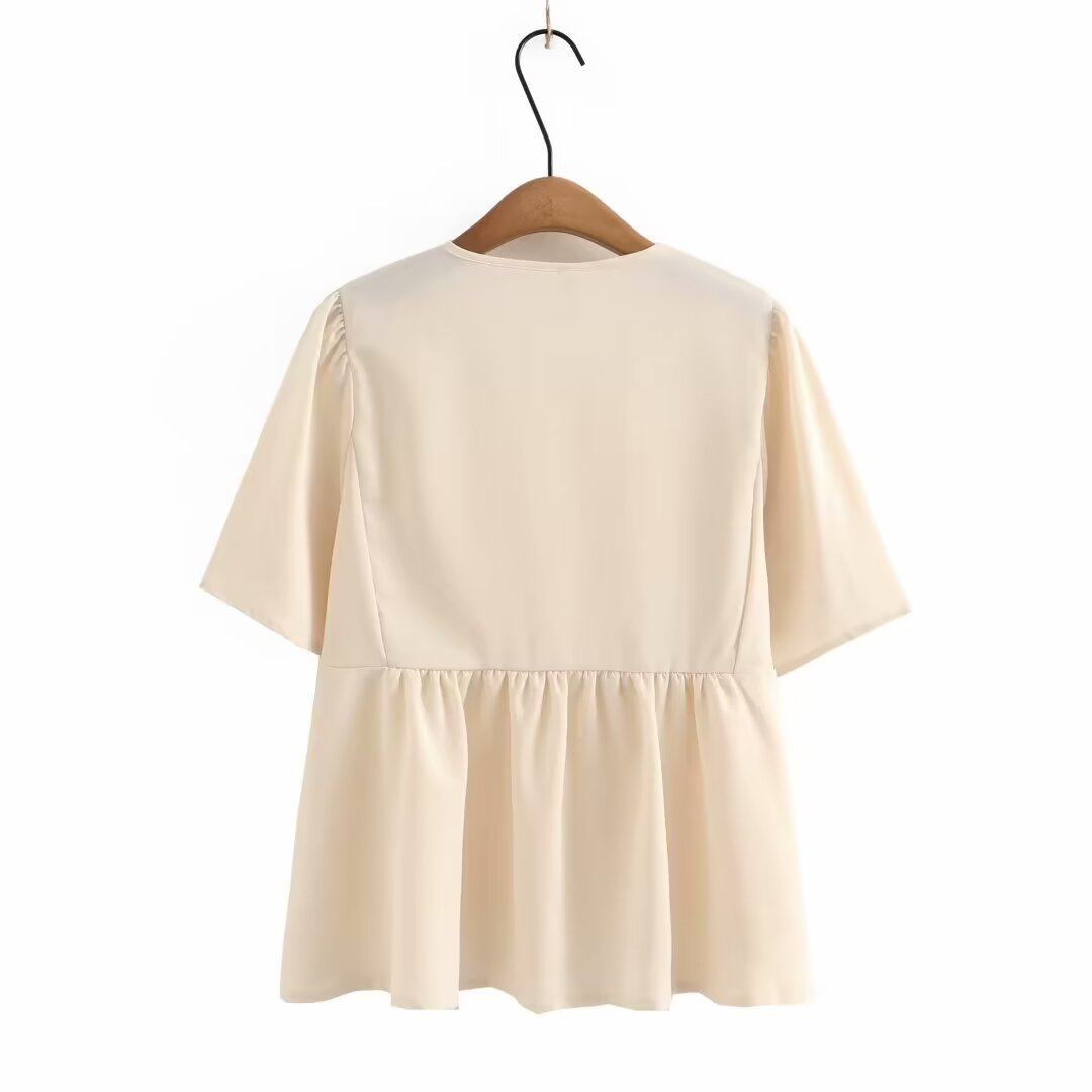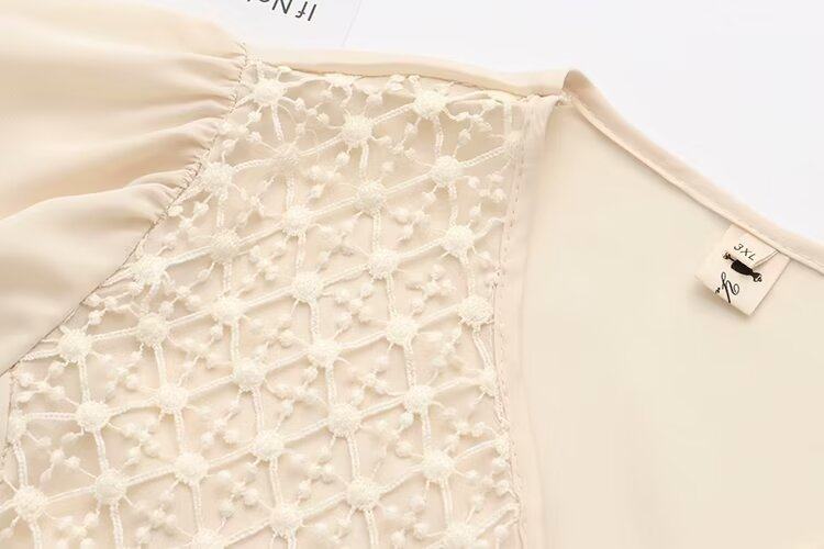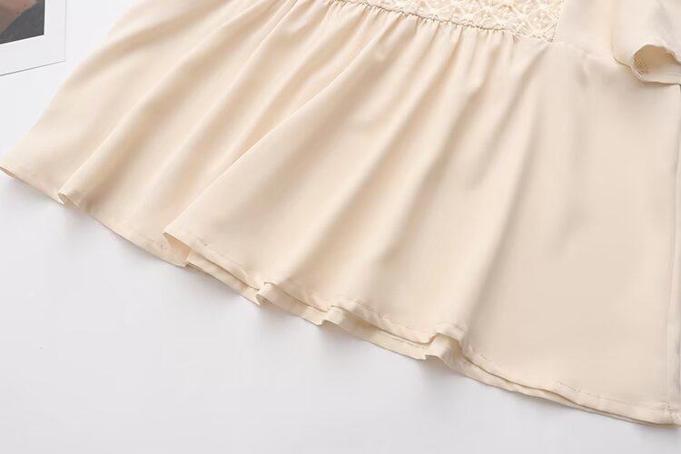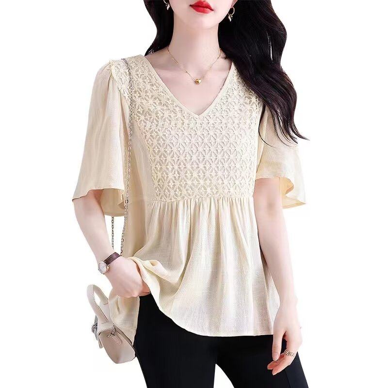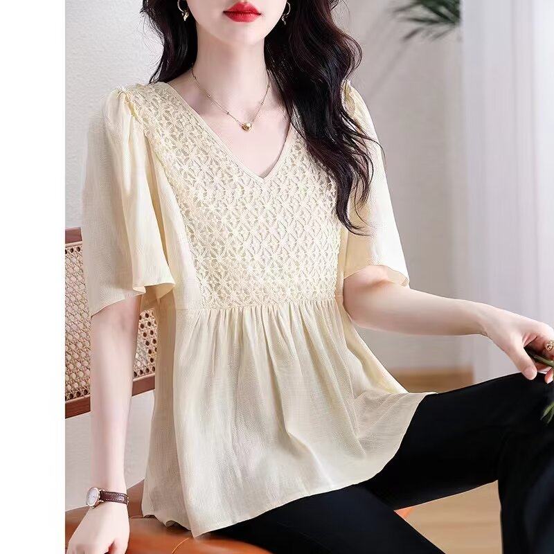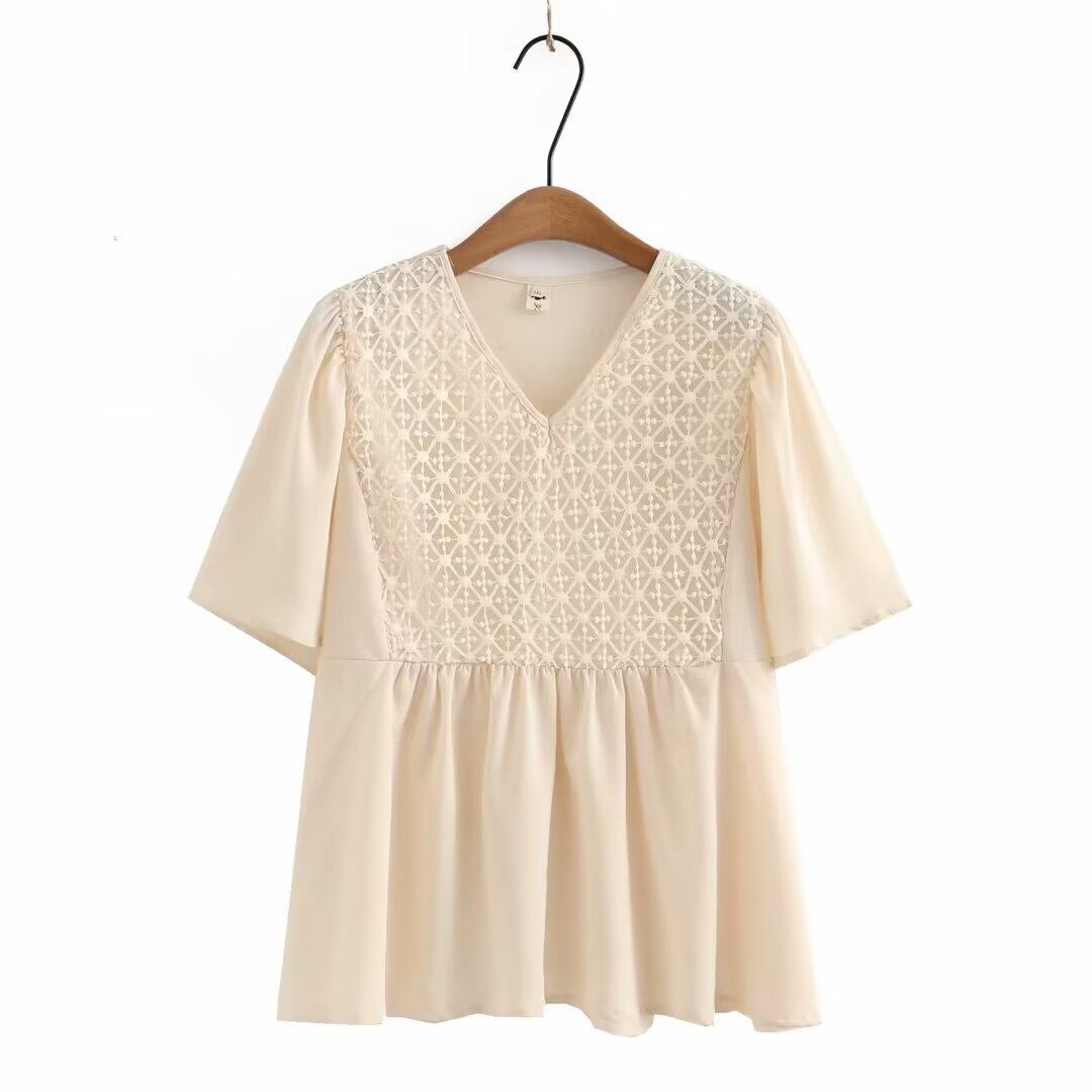 清仓特价女装夏季时尚淑女减龄显瘦雪纺蕾丝拼接V领喇叭袖娃娃衫