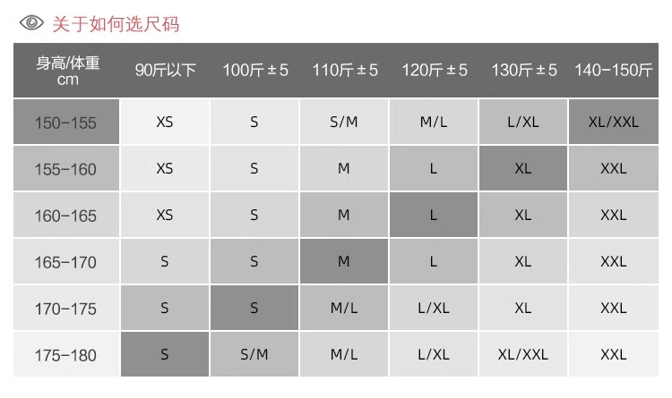 China (cm) 160-165/84-86 165-170 / 88-90 167-172 / 92-96 168-173 / 98-102 170-176 / 106-110