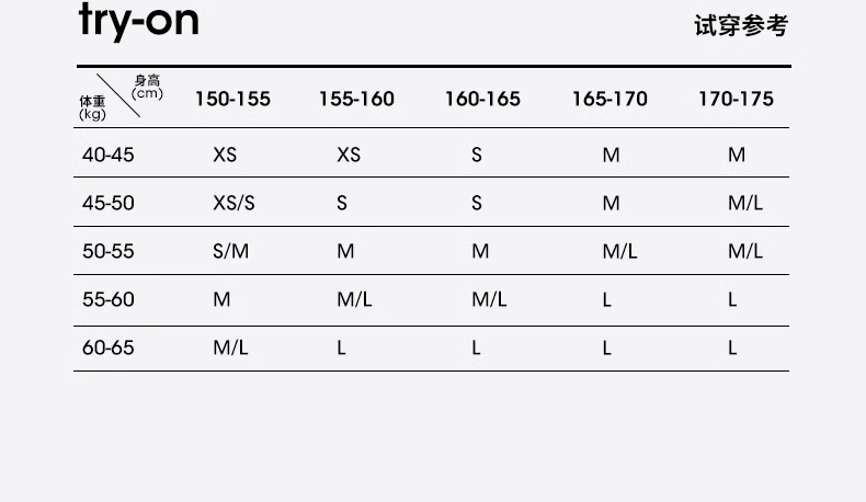 China (cm) 160-165/84-86 165-170 / 88-90 167-172 / 92-96 168-173 / 98-102 170-176 / 106-110