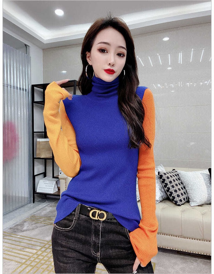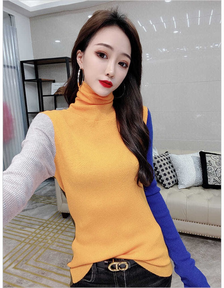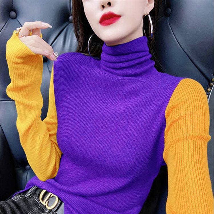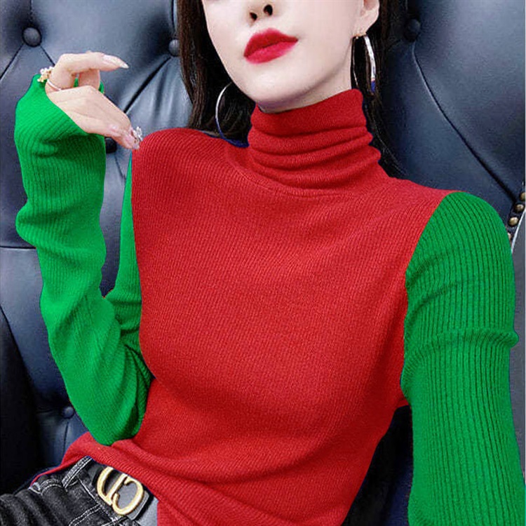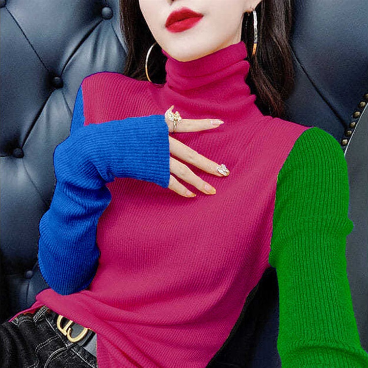 Модный женский свитер в европейском стиле, весна-осень 2025, с цветными блоками, облегающий, с высоким воротом, омолаживающий, с длинными рукавами.
