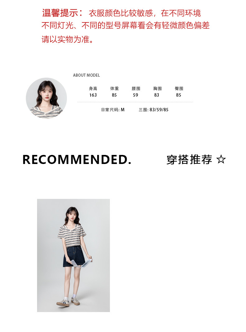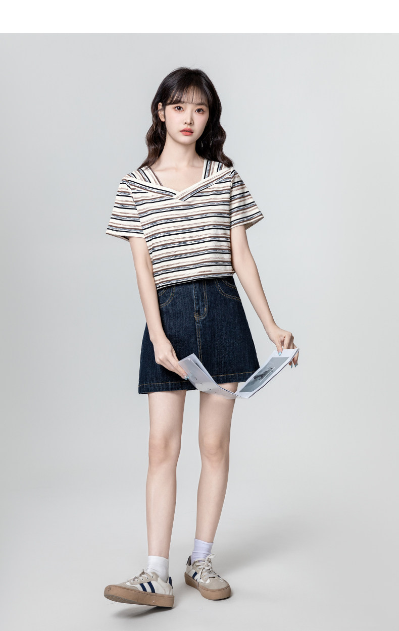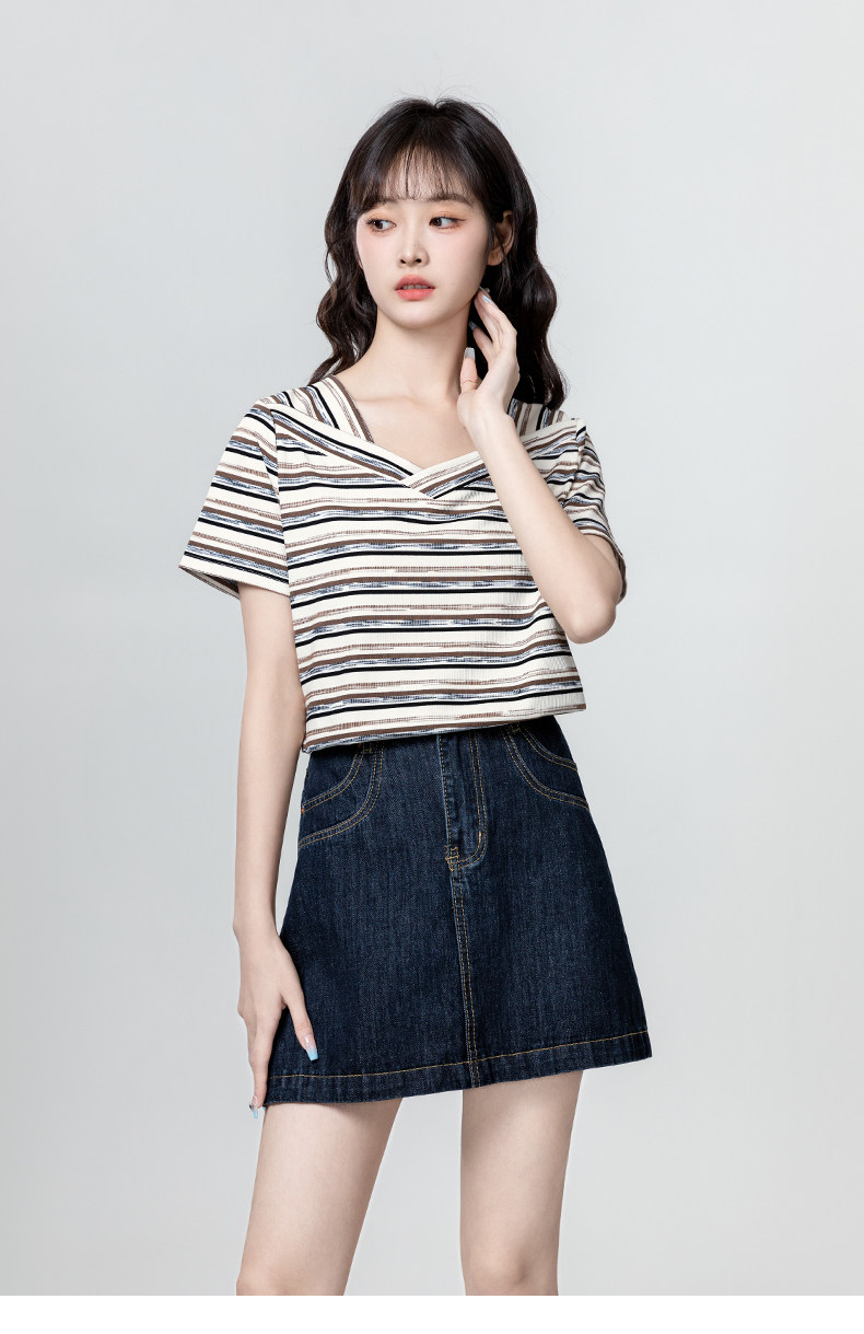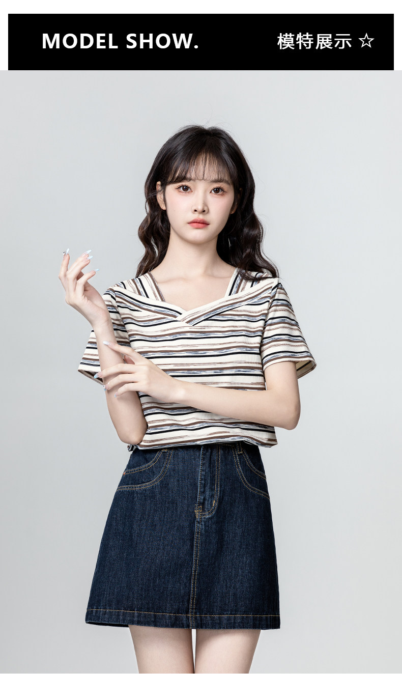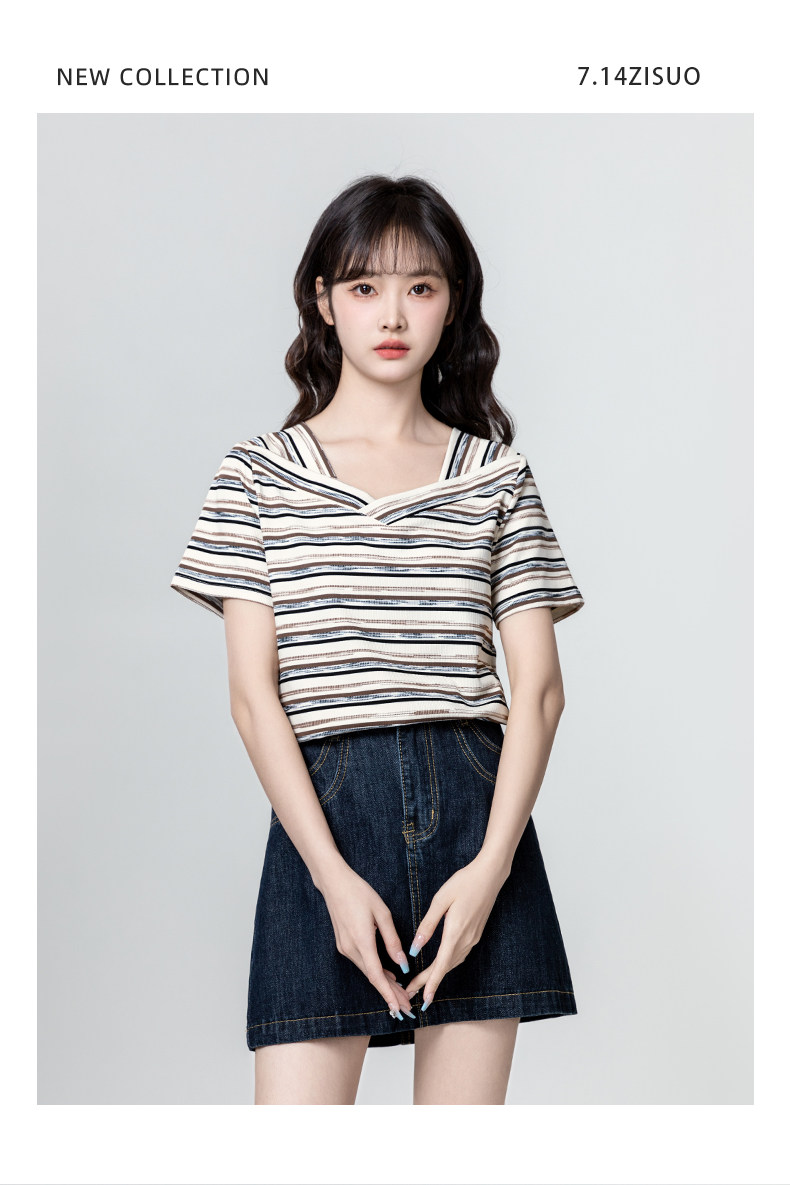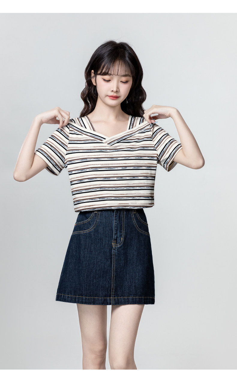 V-neck striped short-sleeved T-shirt for women 2025 summer new loose and irregular design right shoulder T-shirt slimming top