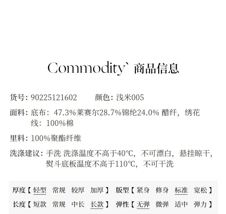 Material Composition Lyocell Fiber (Lyocell) 47.3% Polyamide Fiber (Nylon) 28.7% Acetate Fiber (Acetate Fiber) 24%
