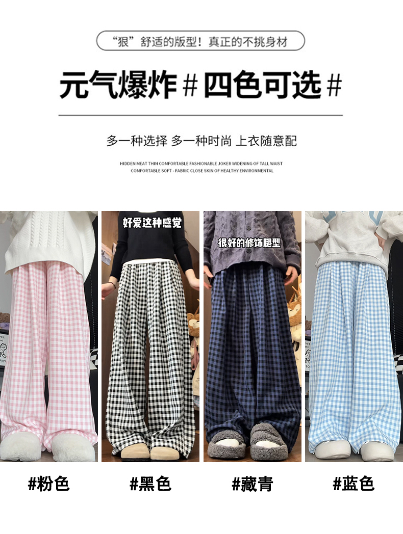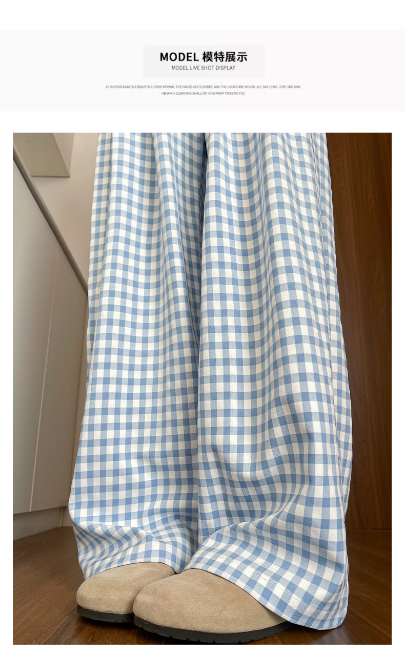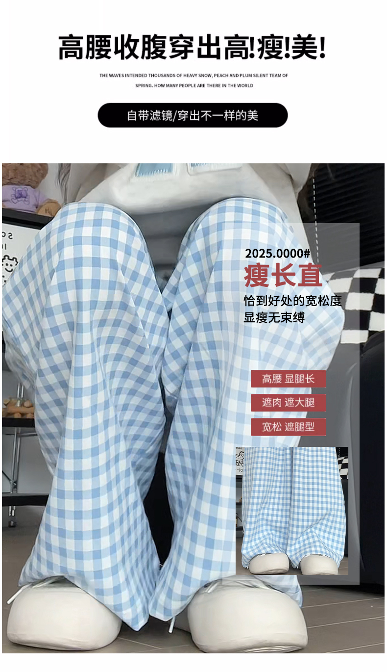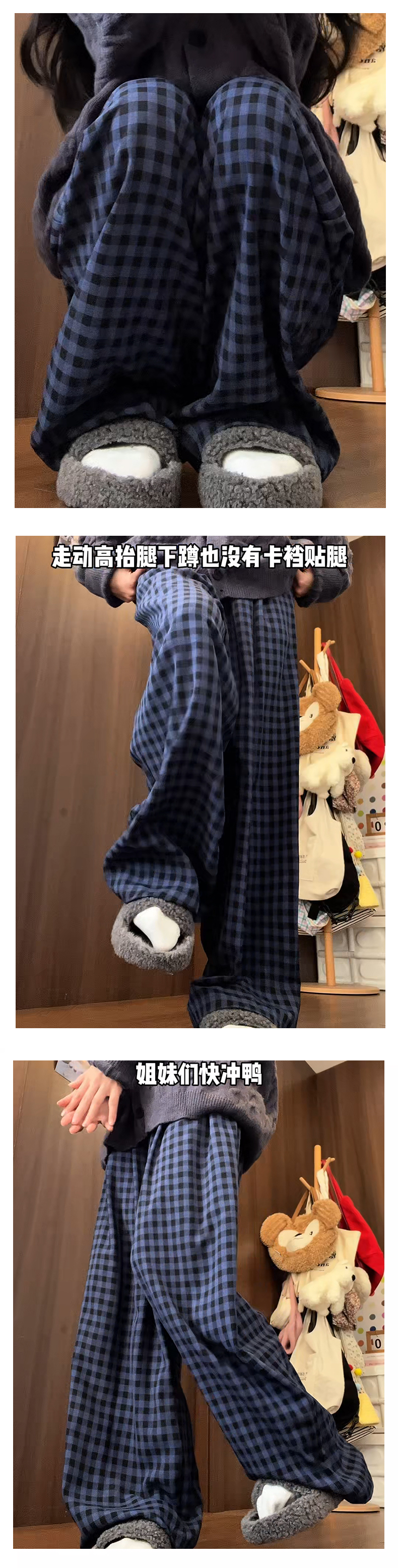 Blue Plaid Pants for Women, Autumn and Winter 2025 New High-Waisted Casual Pants, Slimming, Fleece-Lined, Petite Straight-Leg Wide-Leg Pants