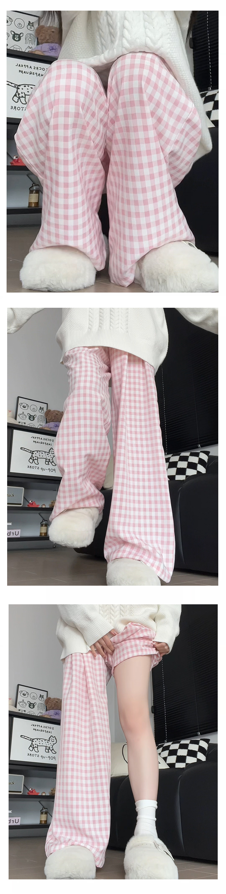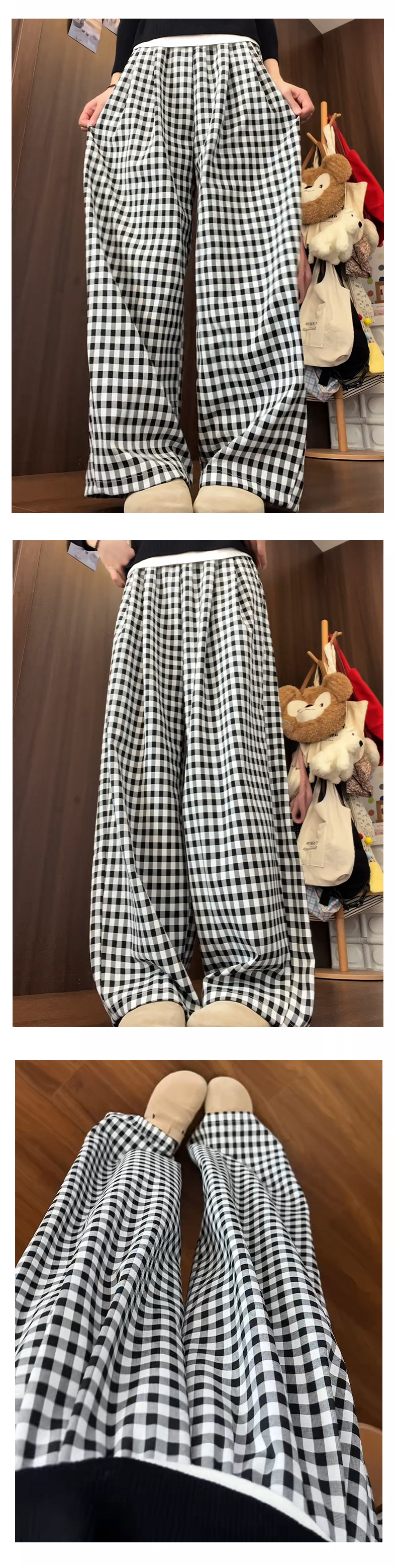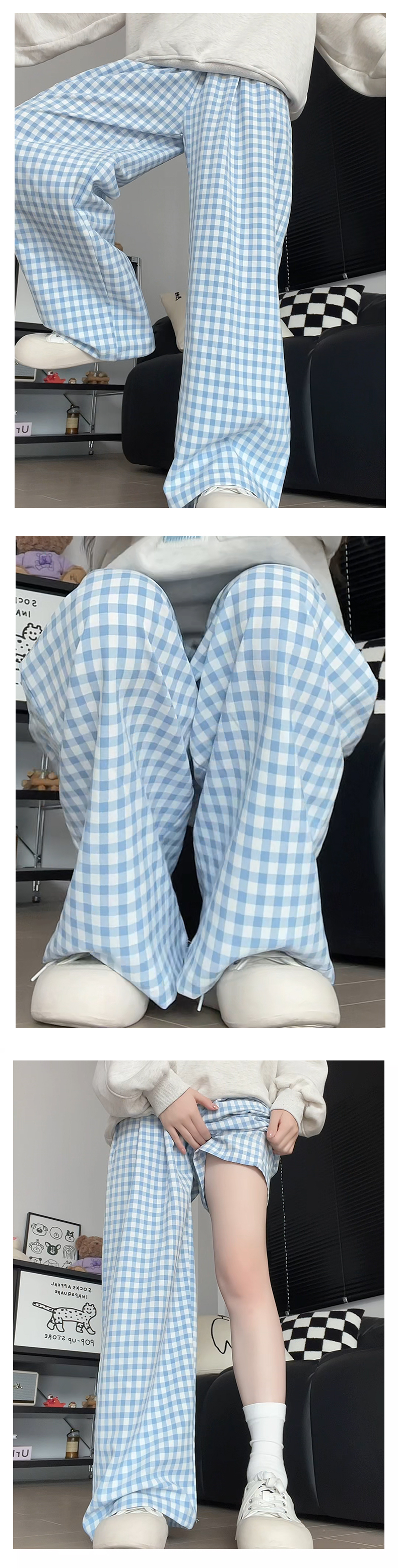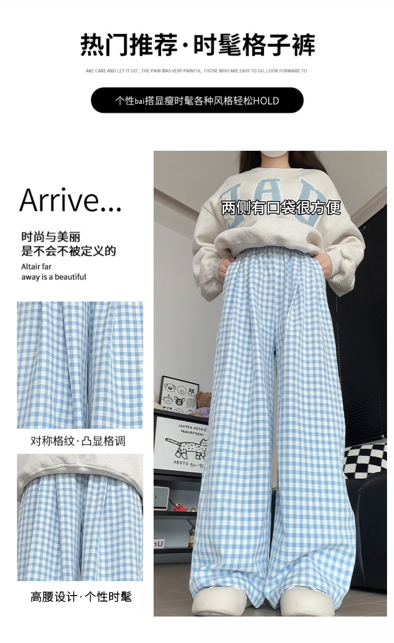 Blue Plaid Pants for Women, Autumn and Winter 2025 New High-Waisted Casual Pants, Slimming, Fleece-Lined, Petite Straight-Leg Wide-Leg Pants