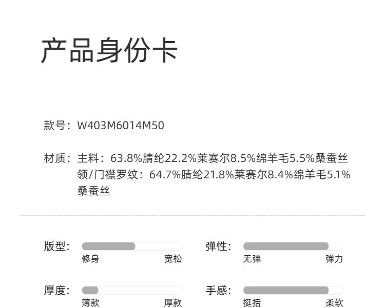 Material Composition Polyacrylonitrile Fiber (Acrylic Fiber) 63.8% Lyocell Fiber (Lyocell) 22.6% Sheep Wool 8.0% Mulberry Silk 5.6%