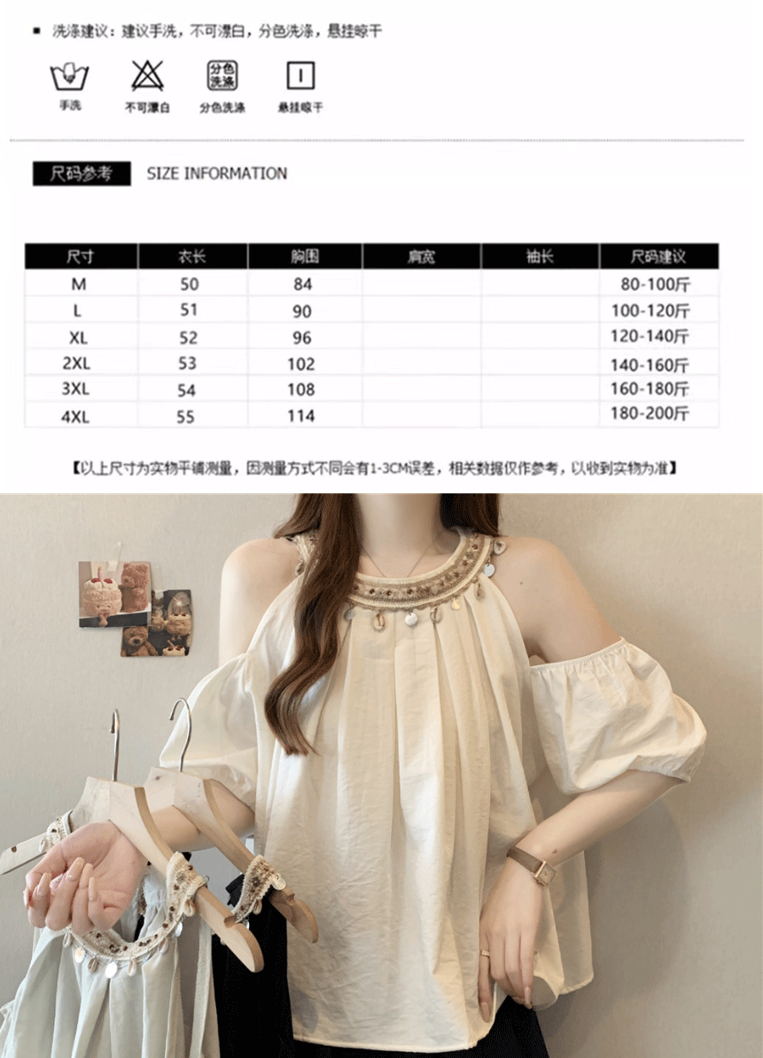Plus Size Women's Clothing with Tummy-Covering Design, Beaded Collar, Off-Shoulder Shirt for Women, Summer Loose and Slimming Chiffon Shirt for Chubby Girls