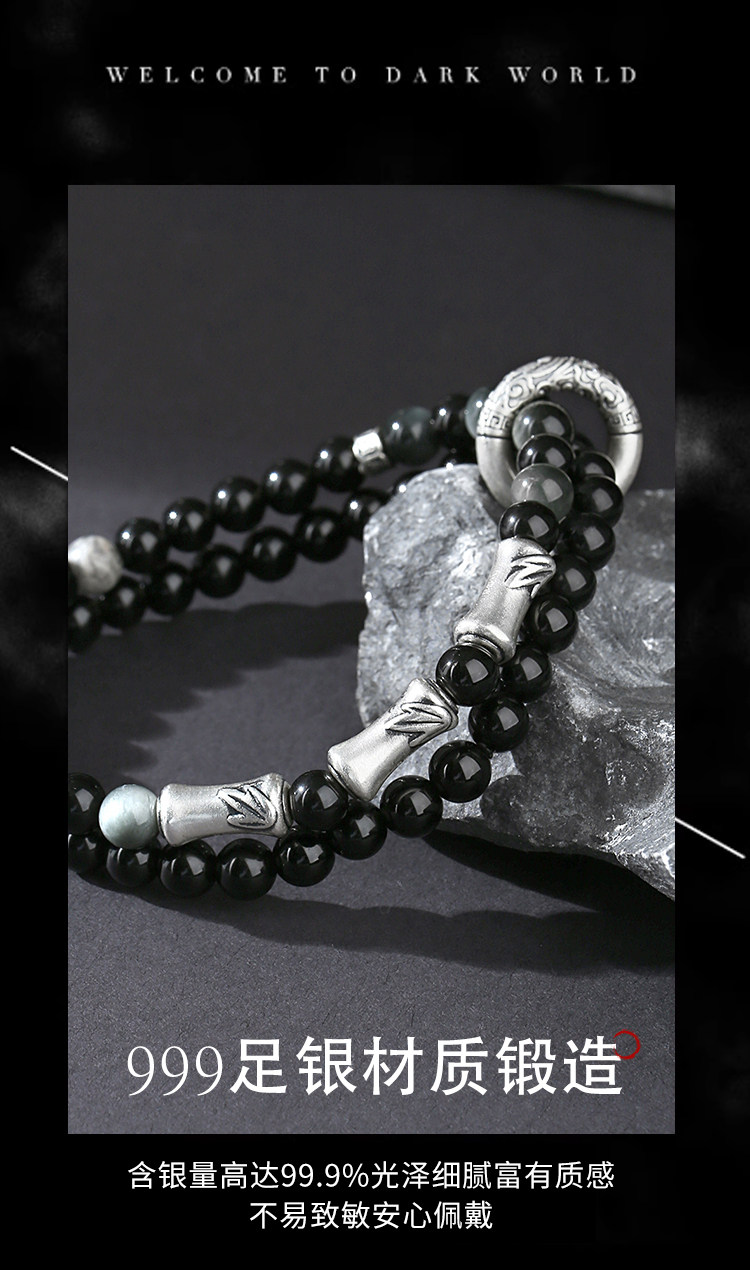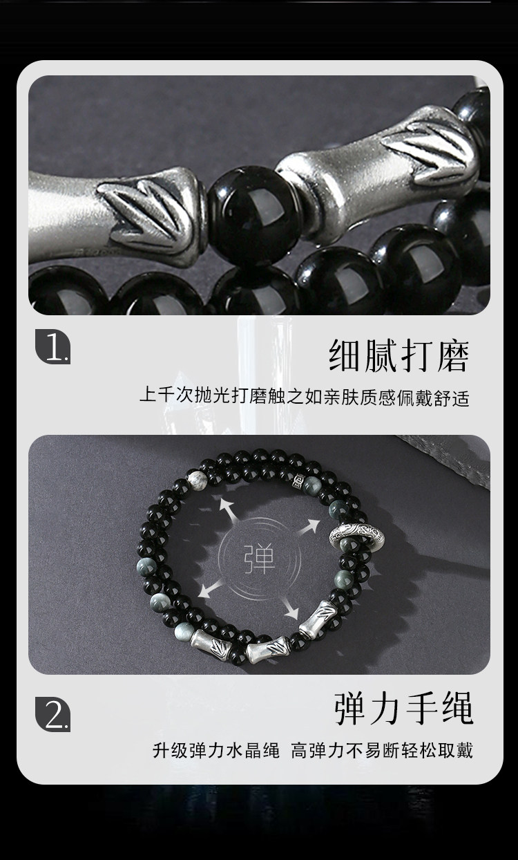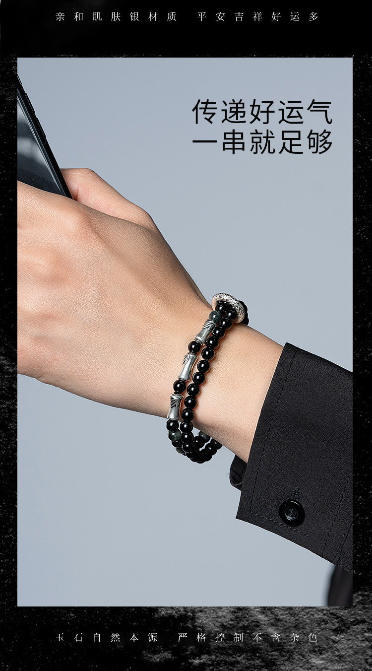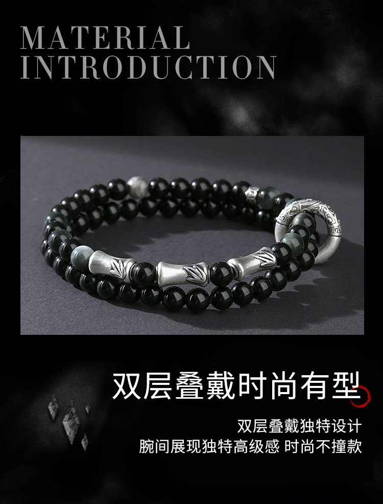 999 Sterling Silber gelandetes Bambus-Obsidian-Armband Herren-Doppelschicht-Armband Herren-Geburtstag Neujahrsgeschenk