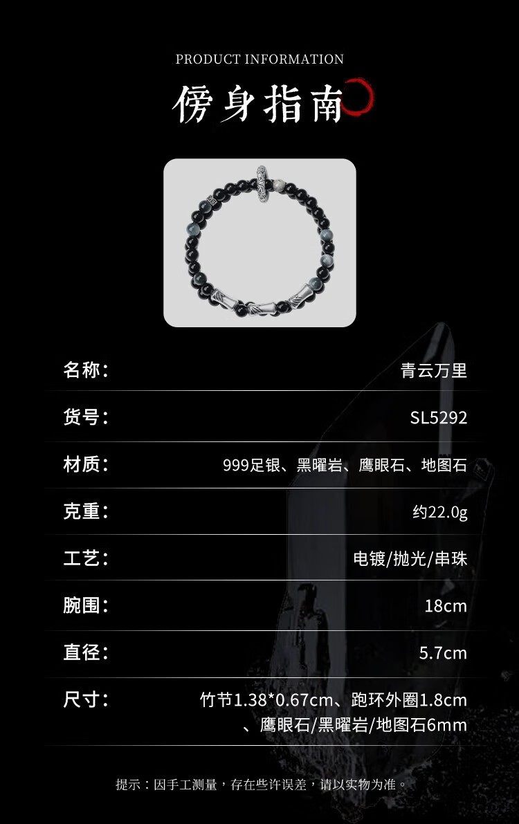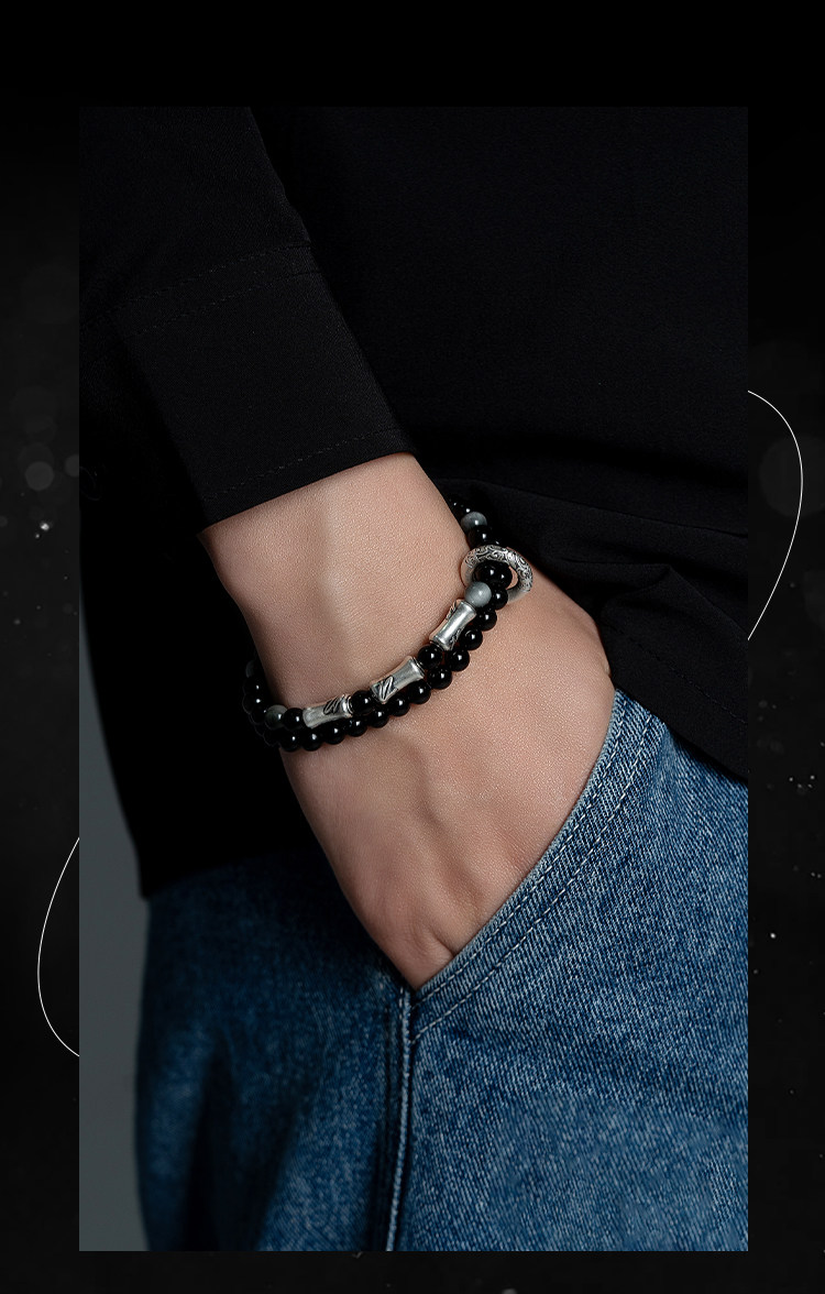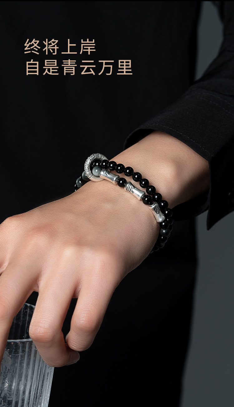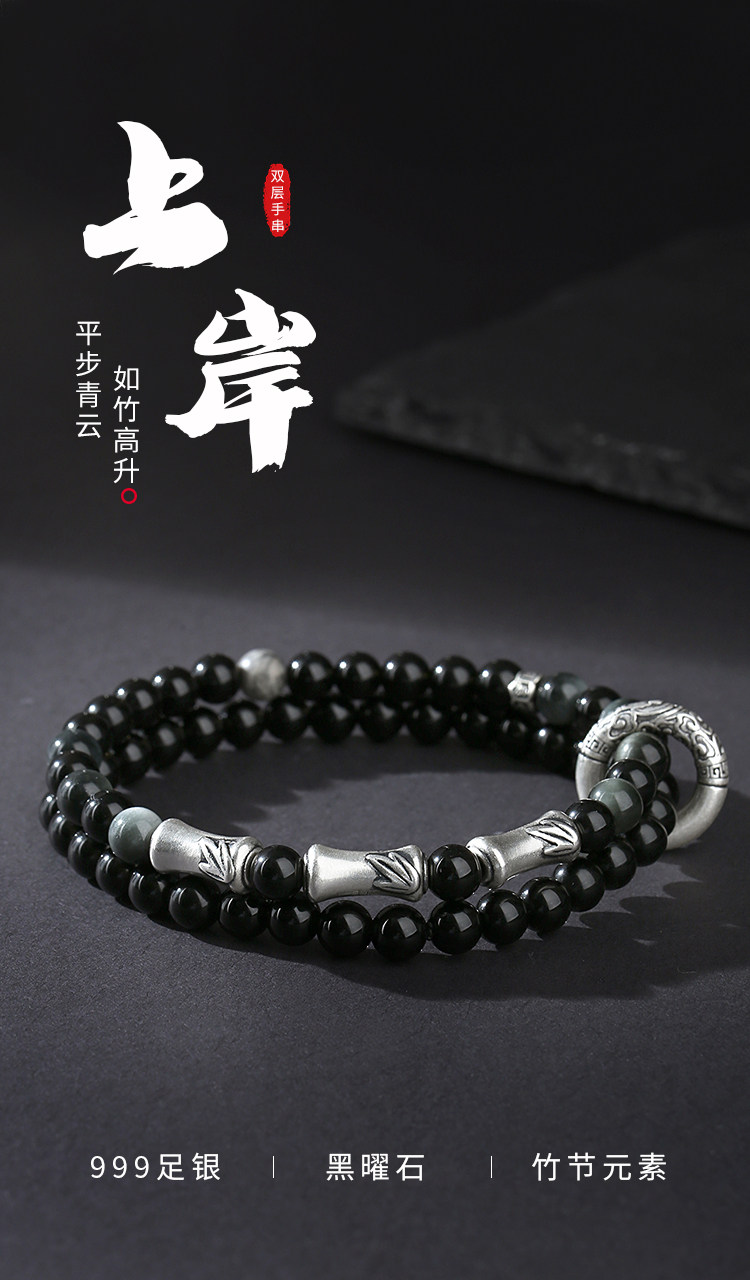 999 Sterling Silber gelandetes Bambus-Obsidian-Armband Herren-Doppelschicht-Armband Herren-Geburtstag Neujahrsgeschenk