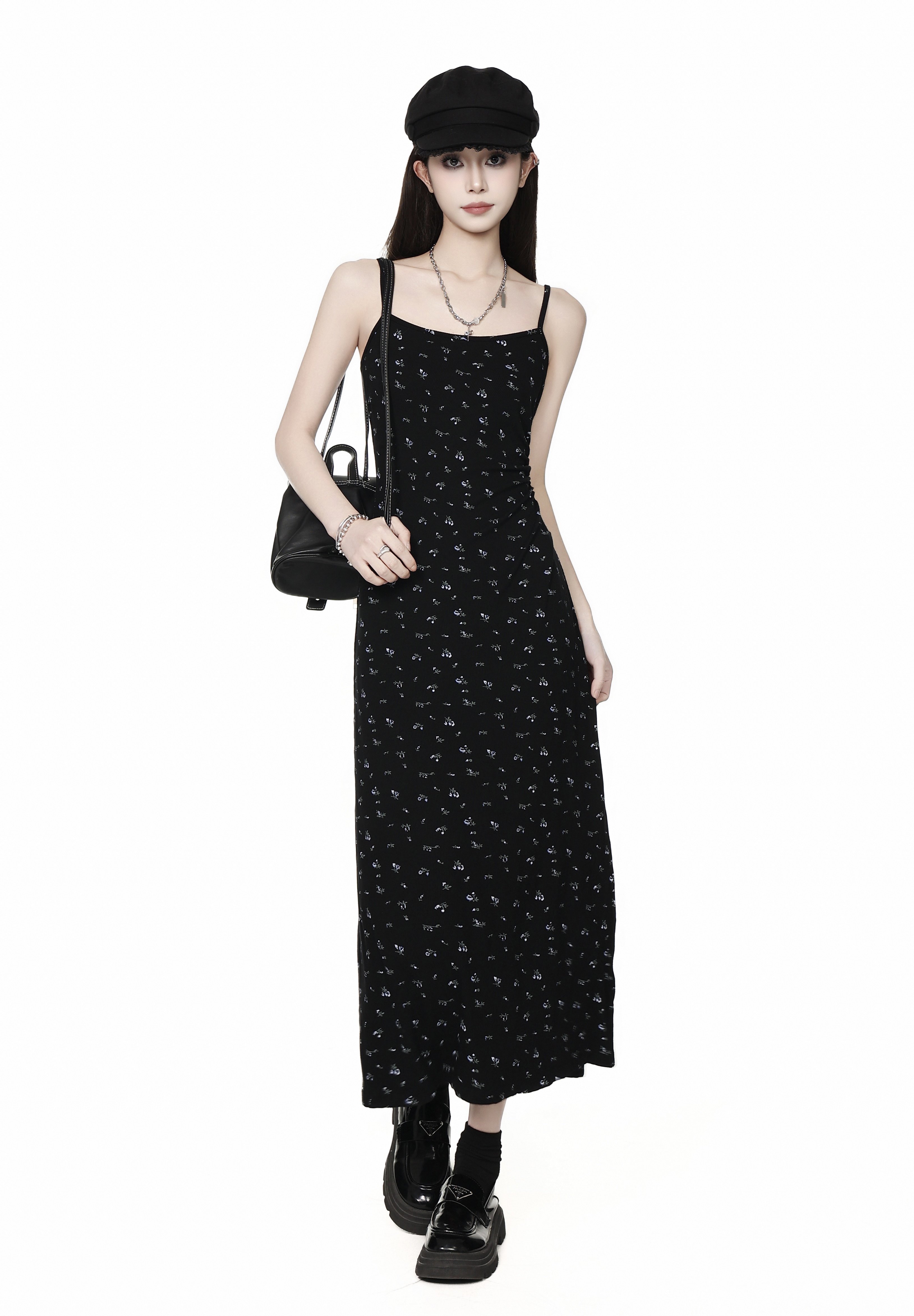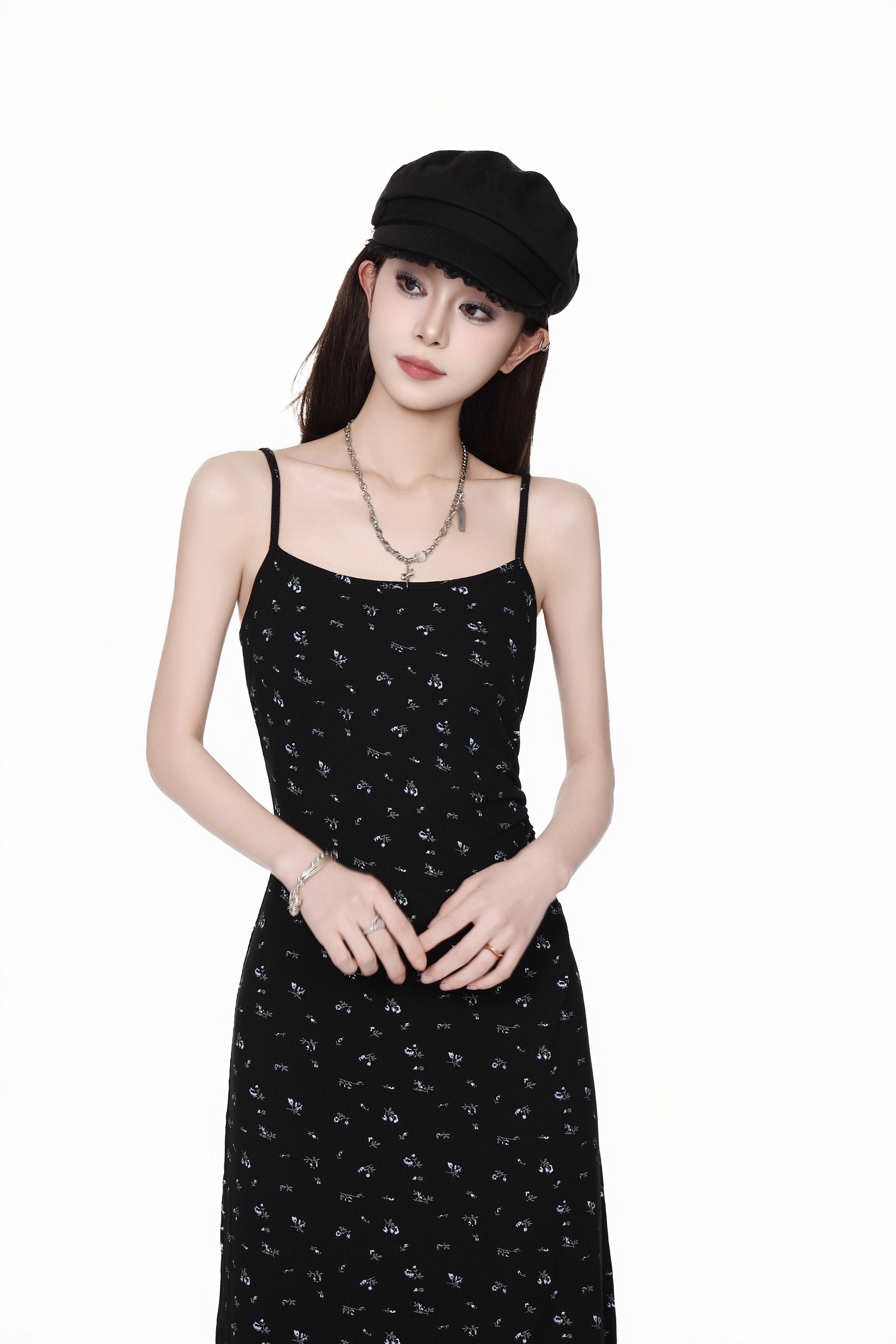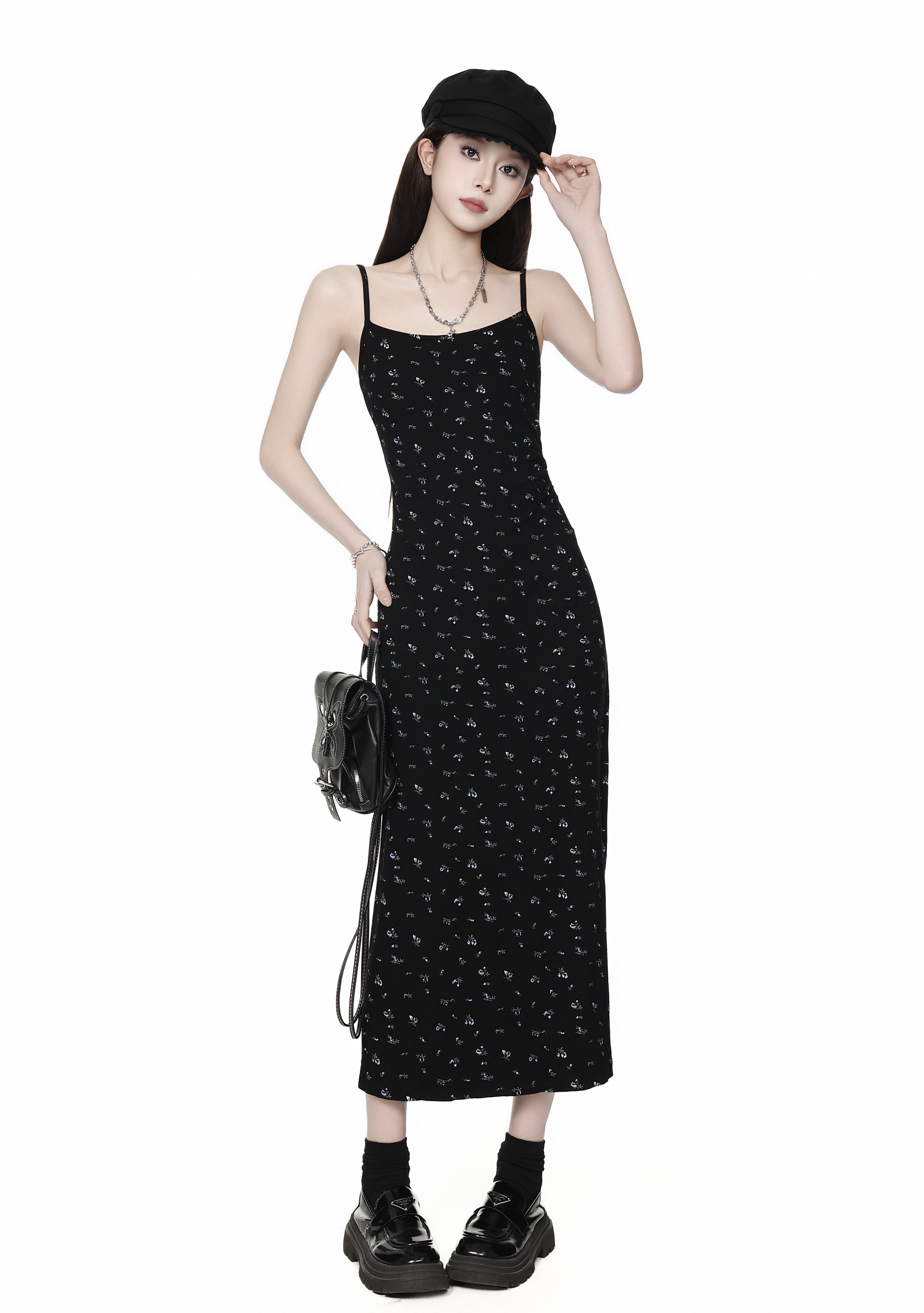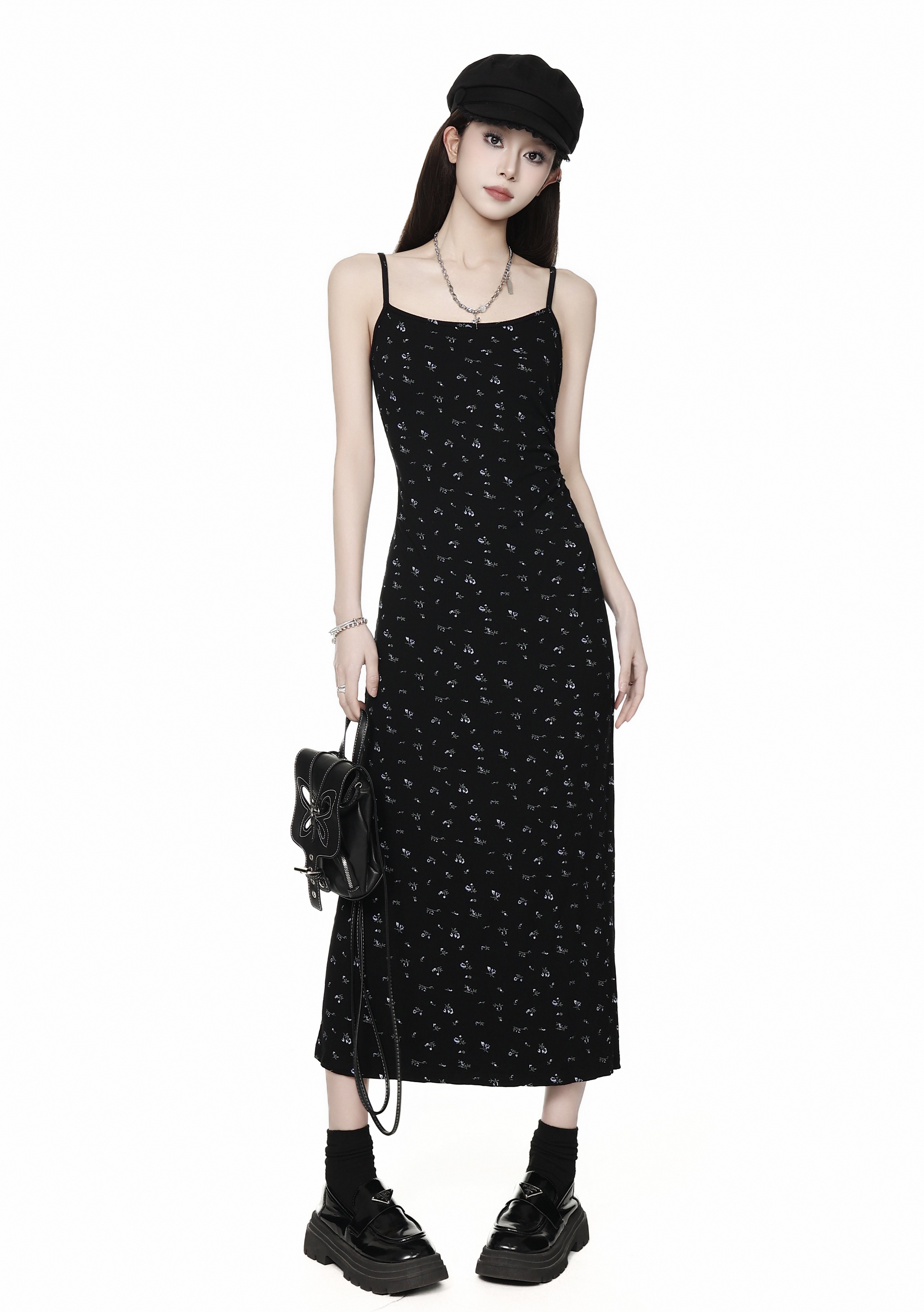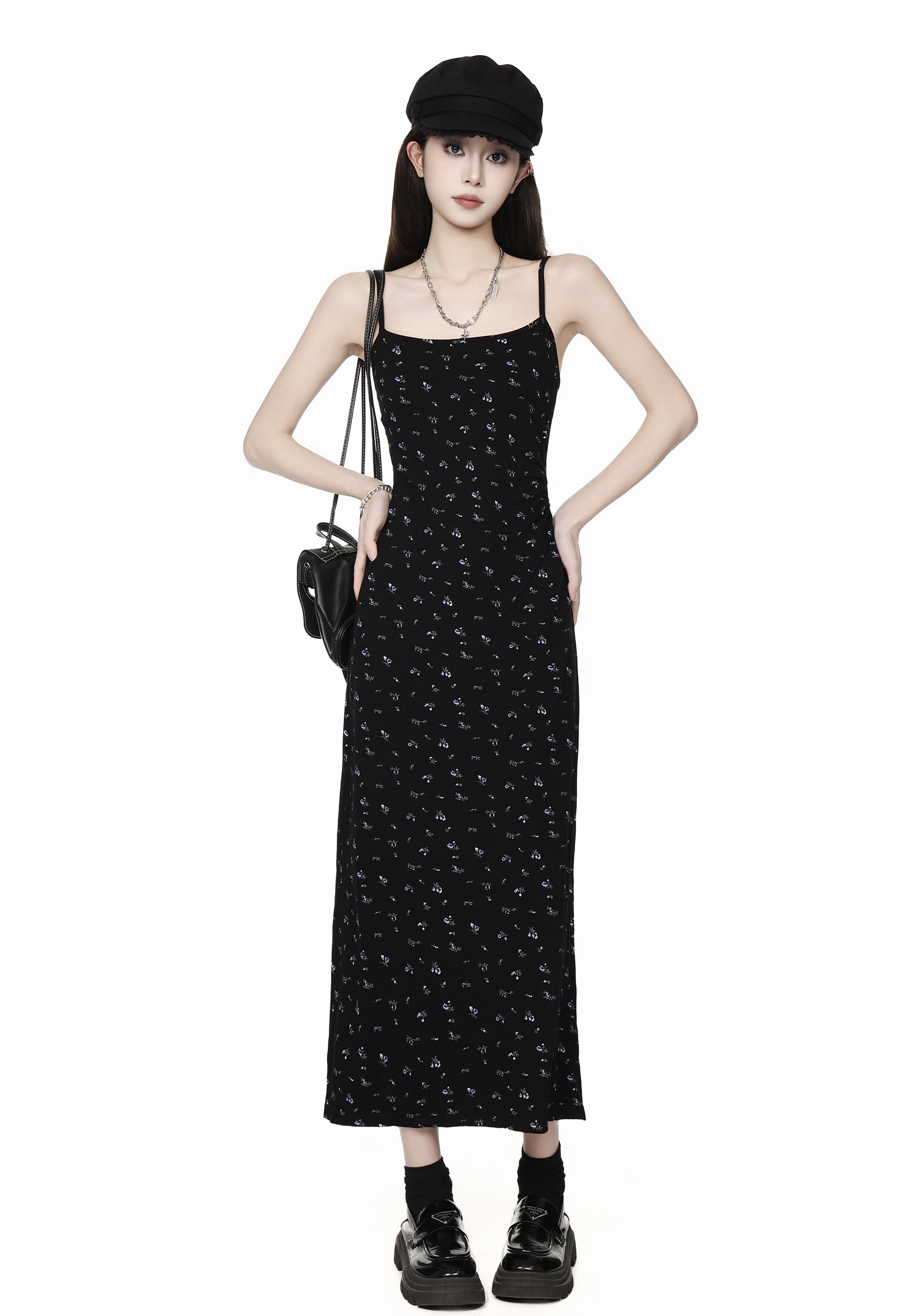 Black floral suspender dress for women 2025 summer new tea skirt sexy slim hip-covered midi skirt