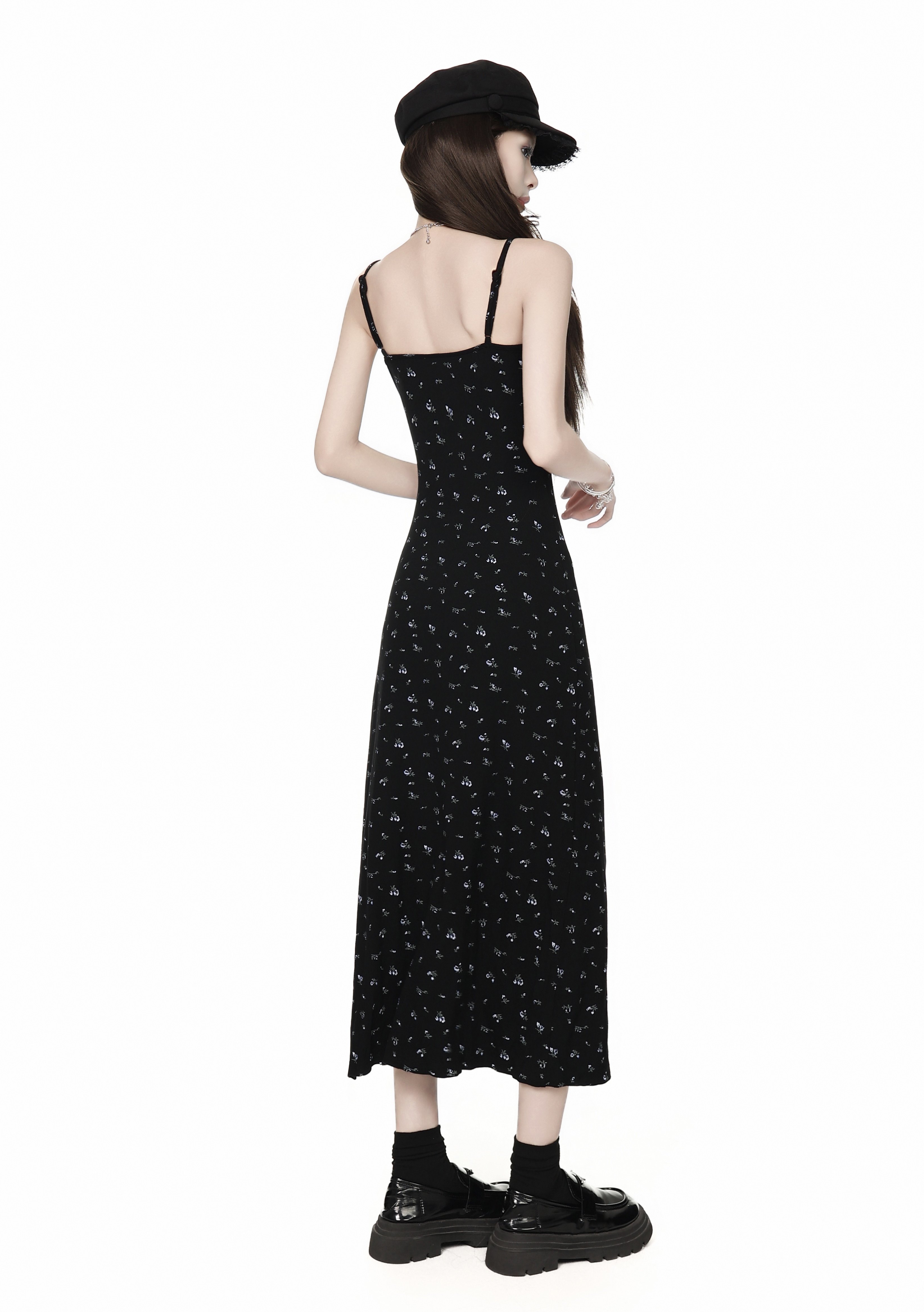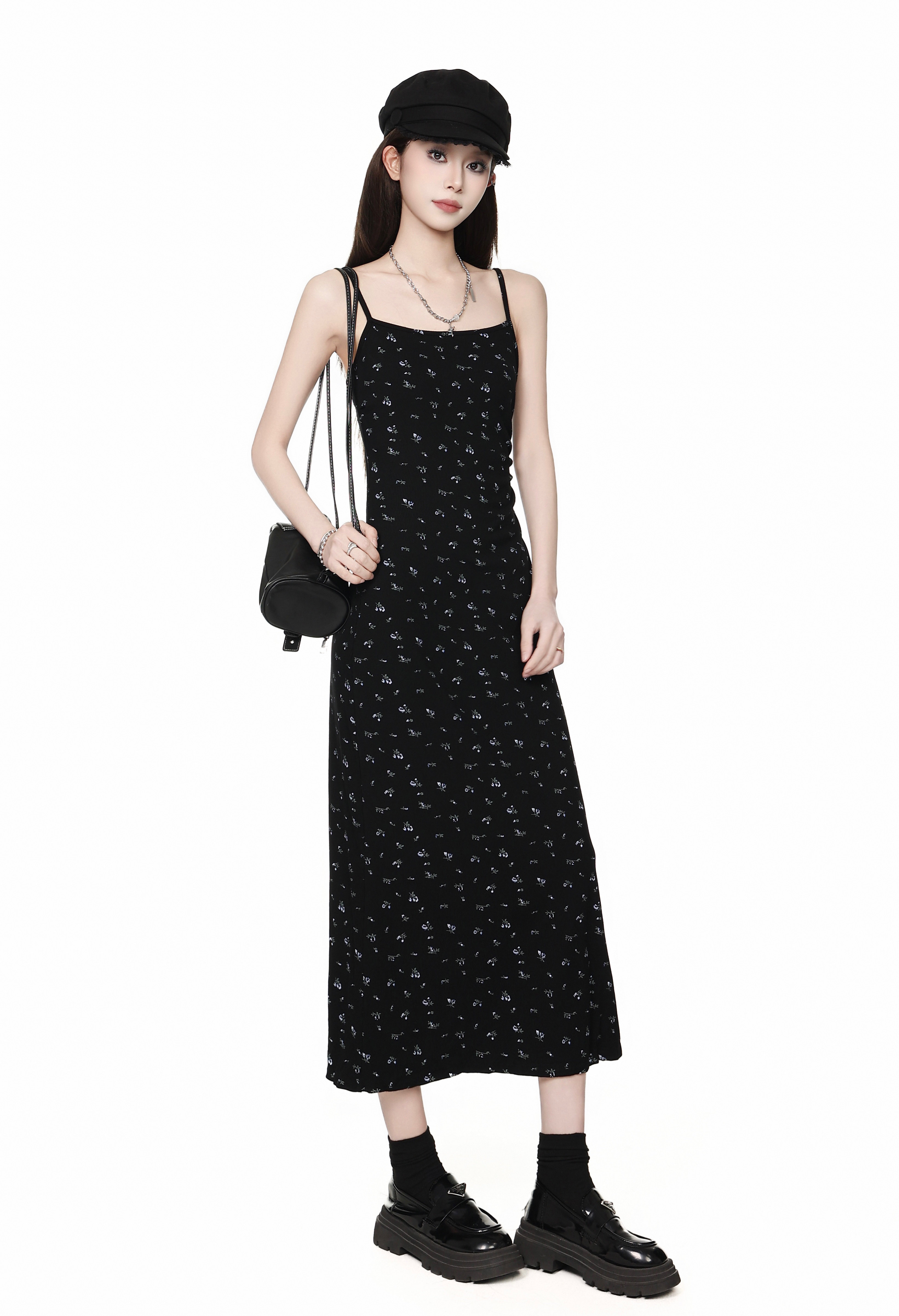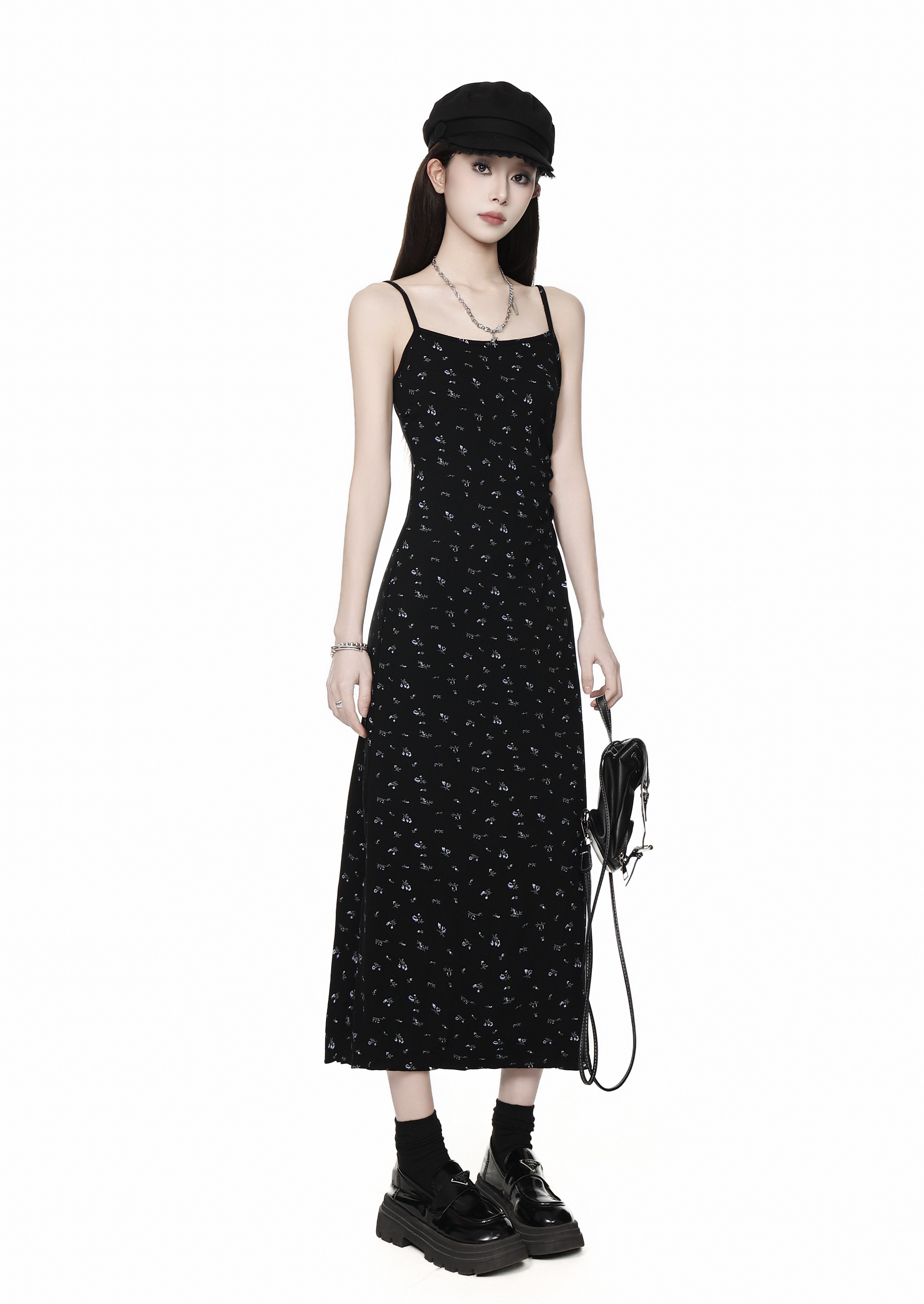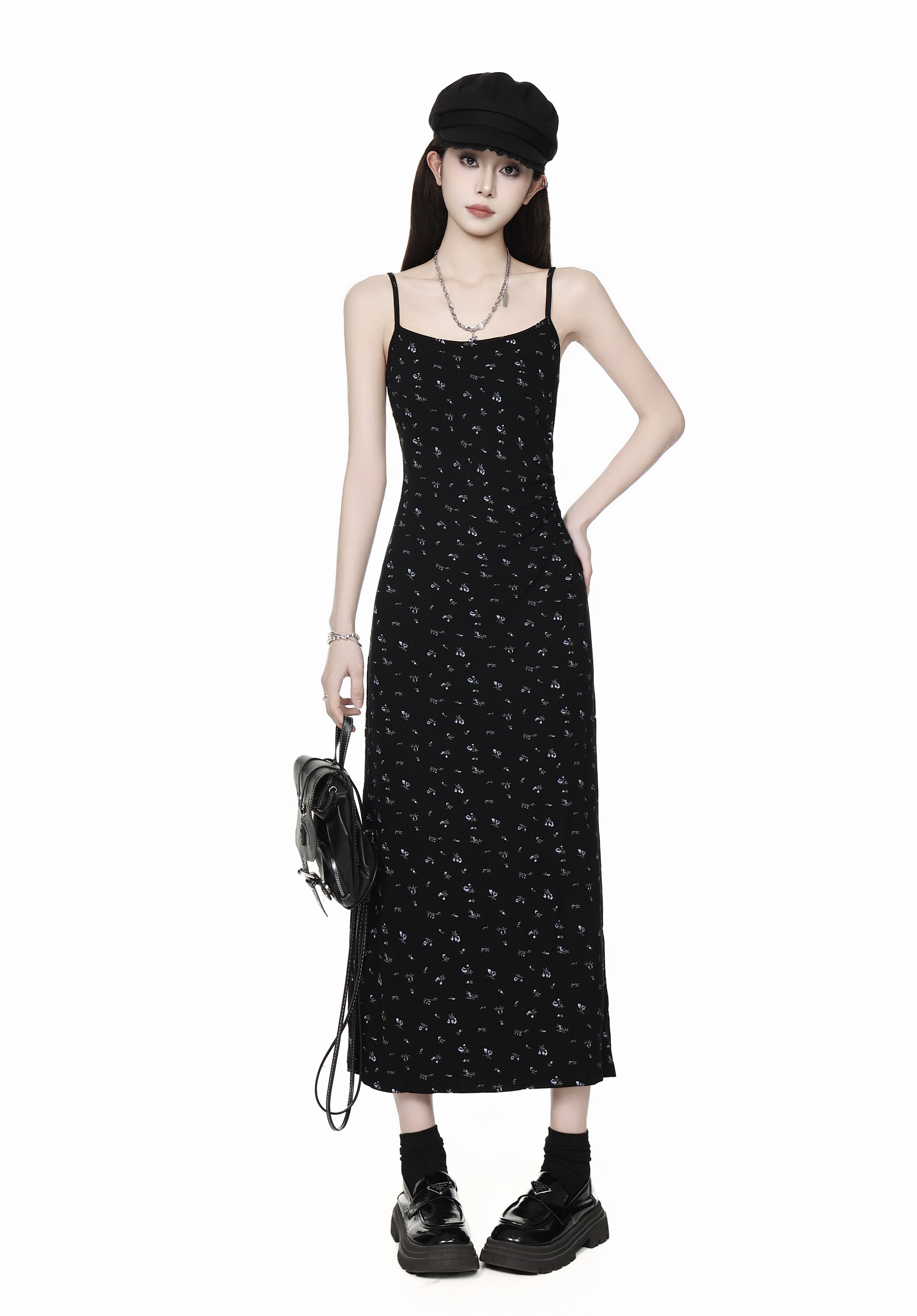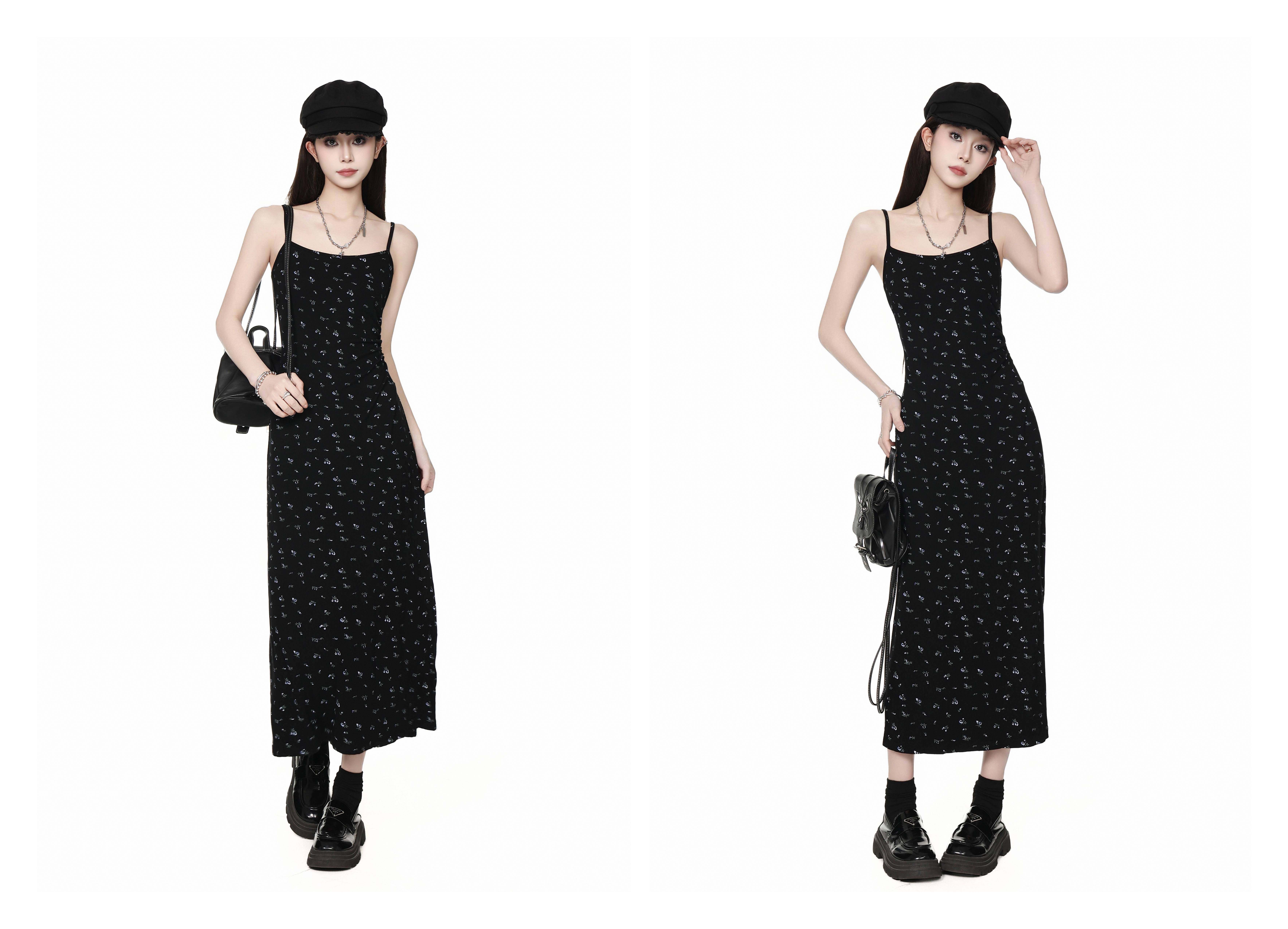 Black floral suspender dress for women 2025 summer new tea skirt sexy slim hip-covered midi skirt