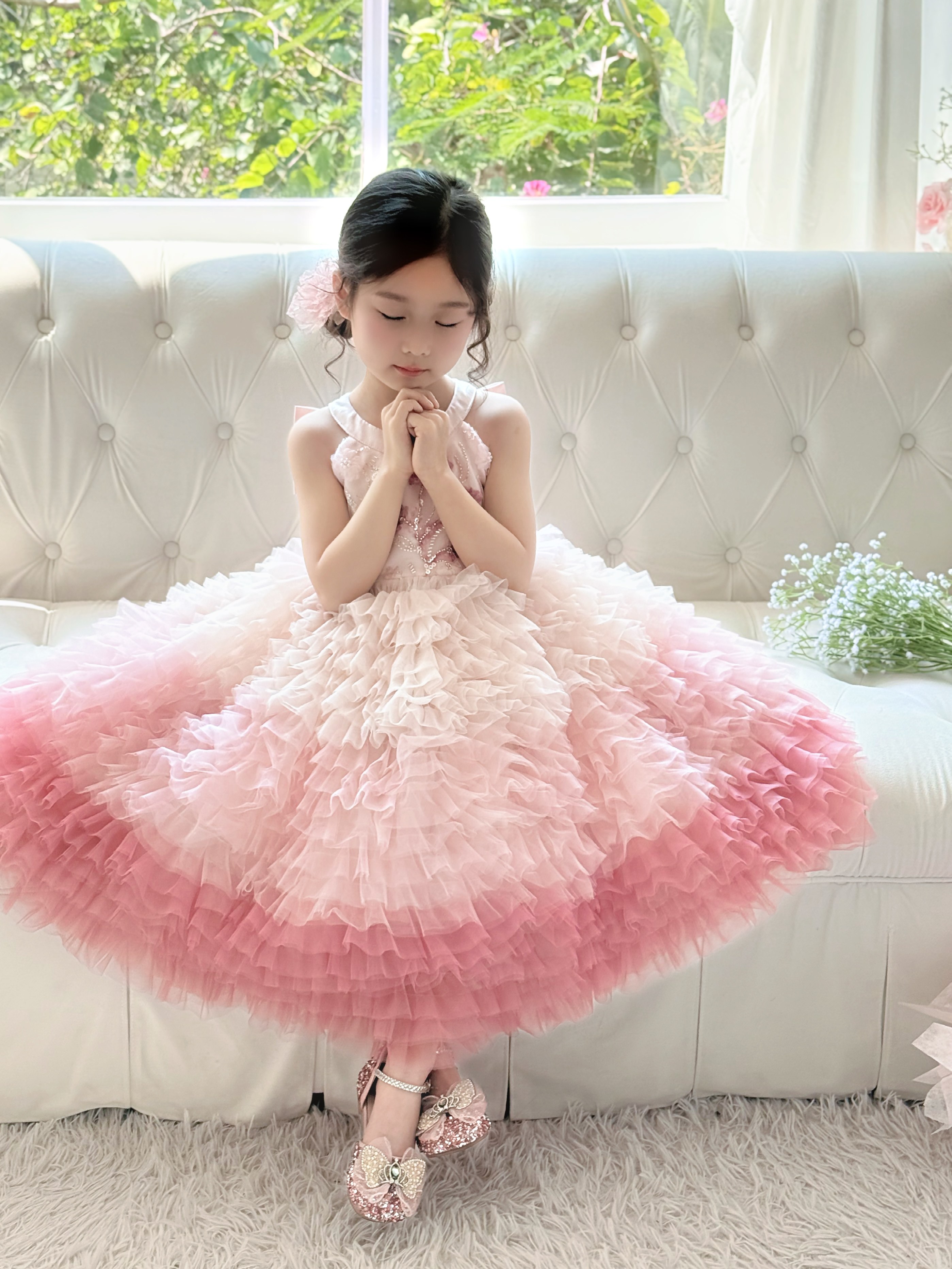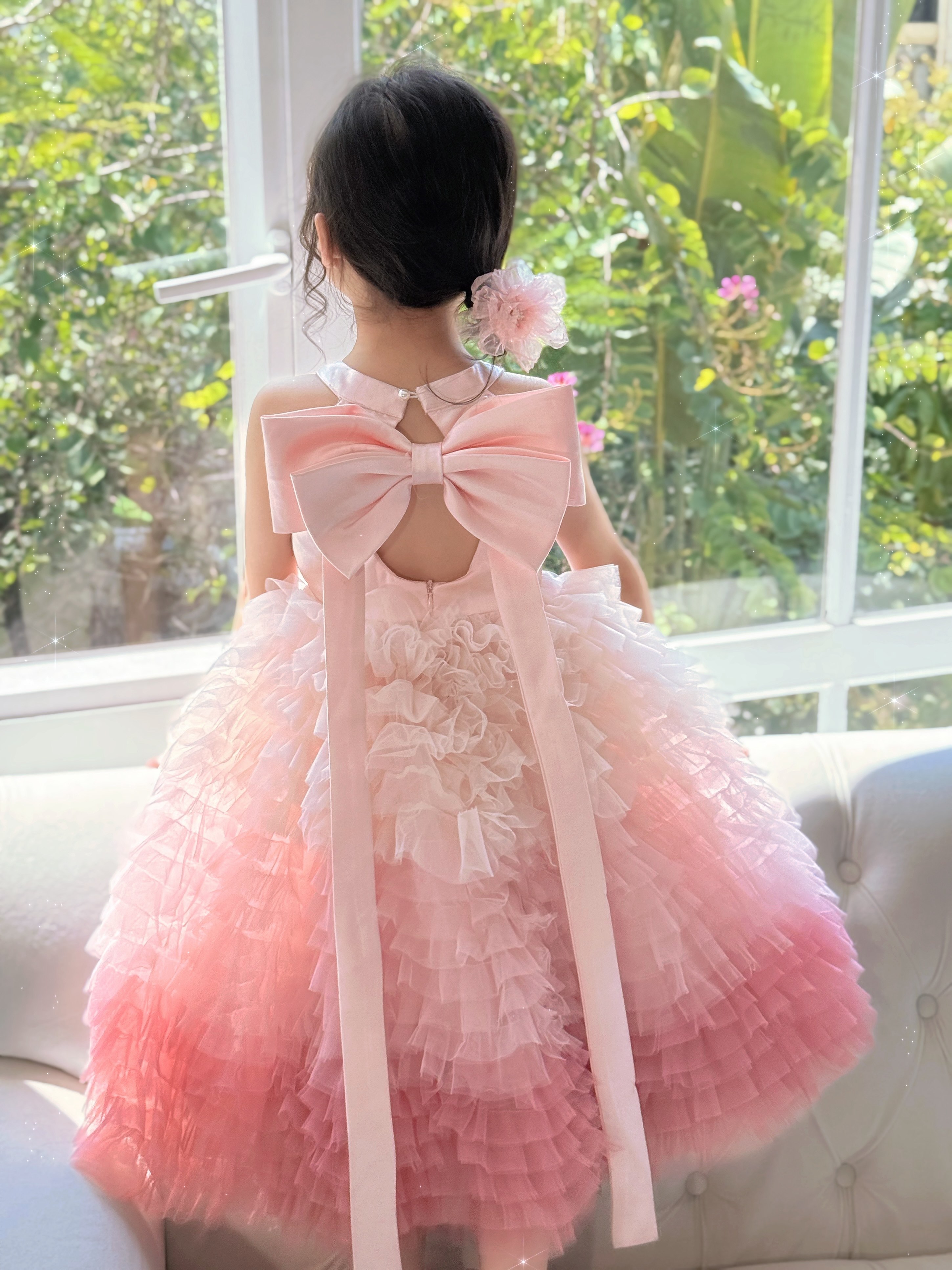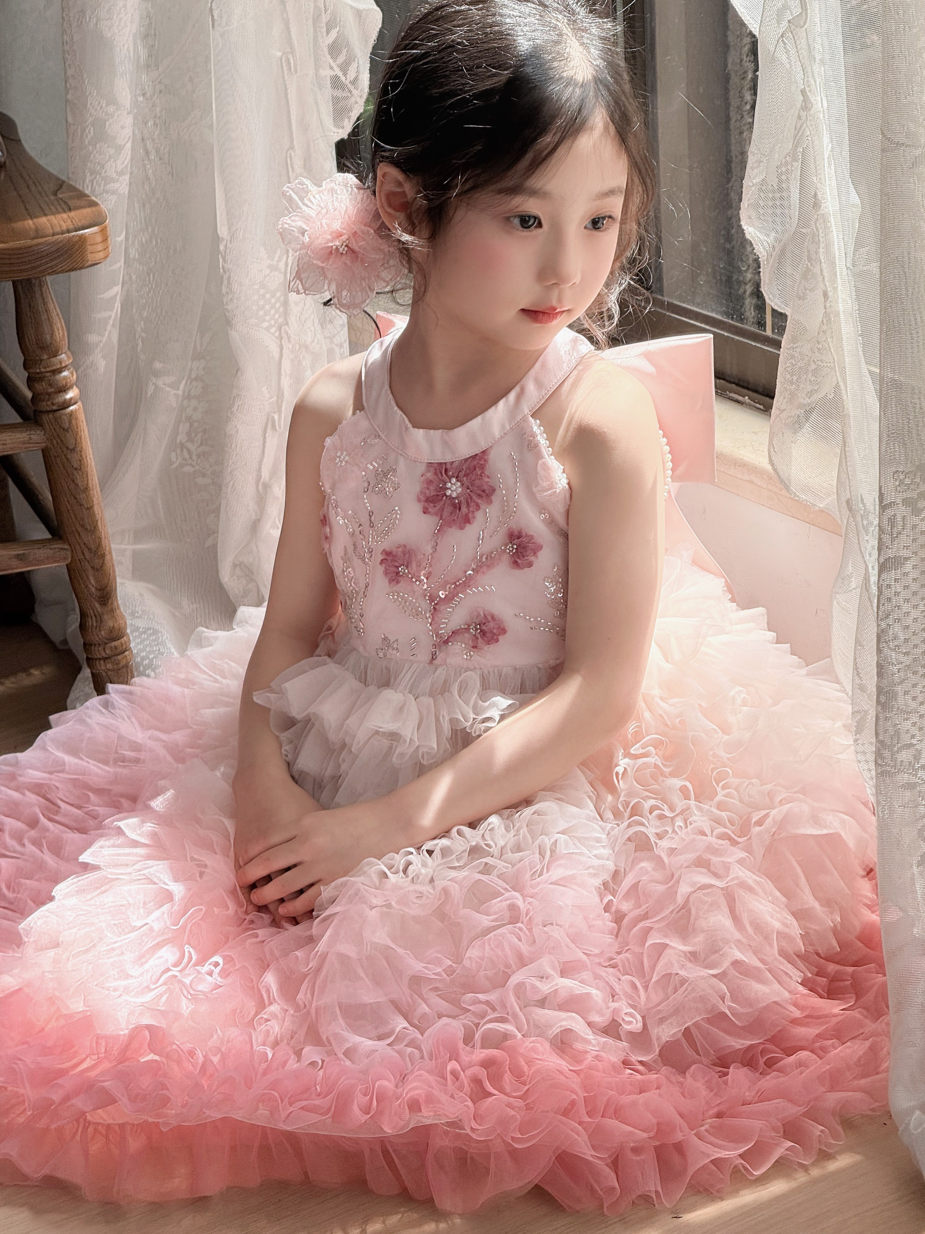 Farbklassifizierung Rosafarbener Gazerock mit Farbverlauf (mit Fliege auf der Rückseite),Farbverlaufsrosa (wird mit einer Schleife auf der Rückseite geliefert) + Blumenhaarnadel,rosafarbenes Gaze-Hemd