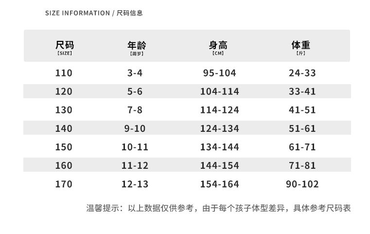 China (cm) 160-165/84-86 165-170 / 88-90 167-172 / 92-96 168-173 / 98-102 170-176 / 106-110