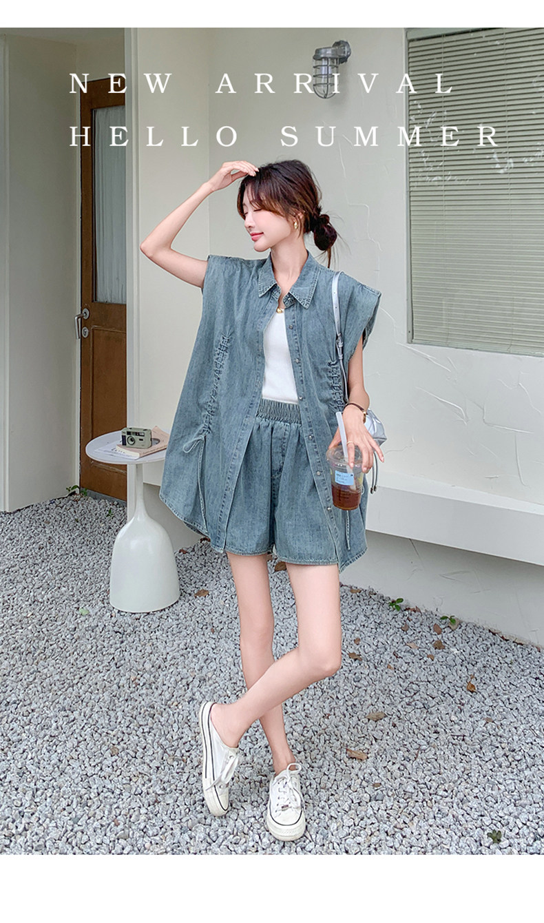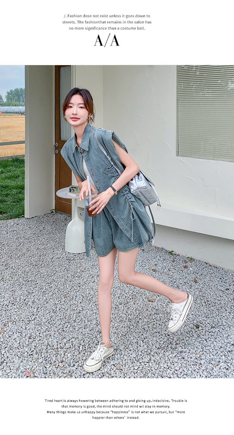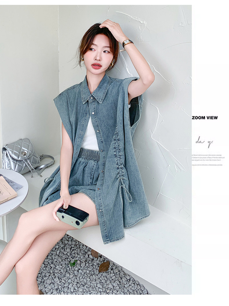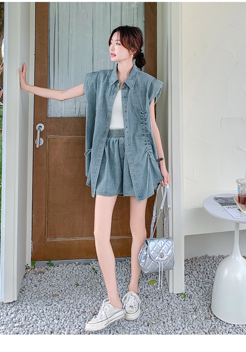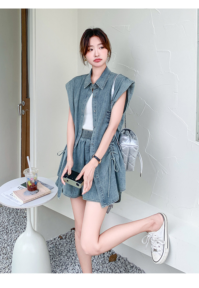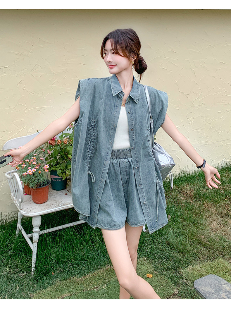 Blue Niche Design Denim Suit for Women, Summer 2025 New Korean Style Wrinkled Shirt Top and Shorts Two-Piece Set