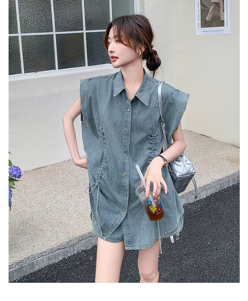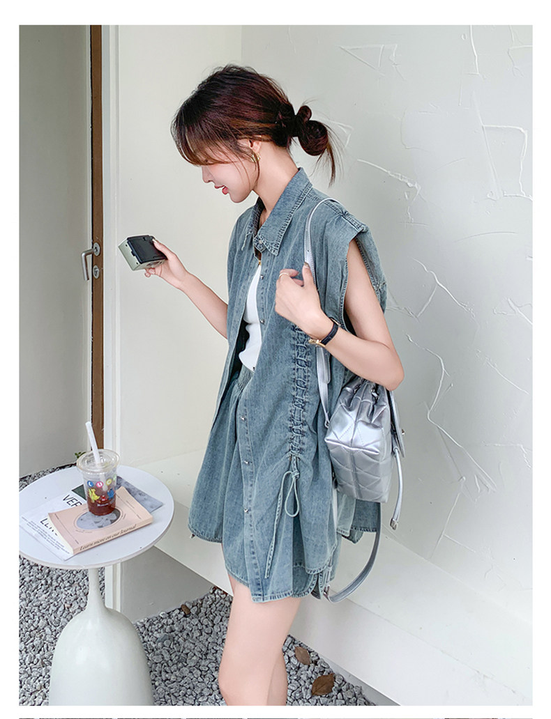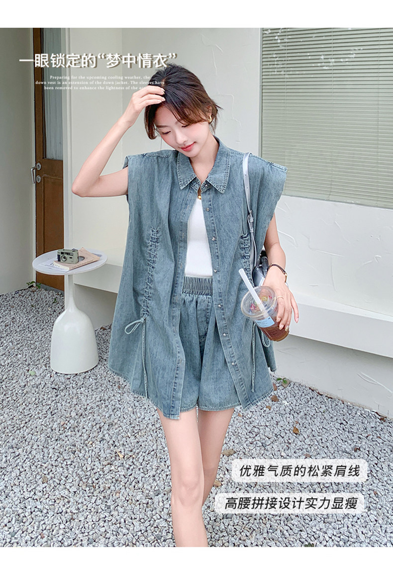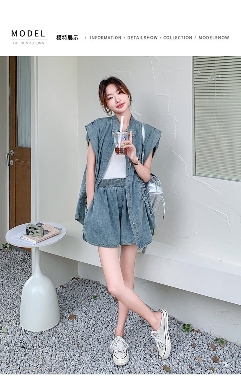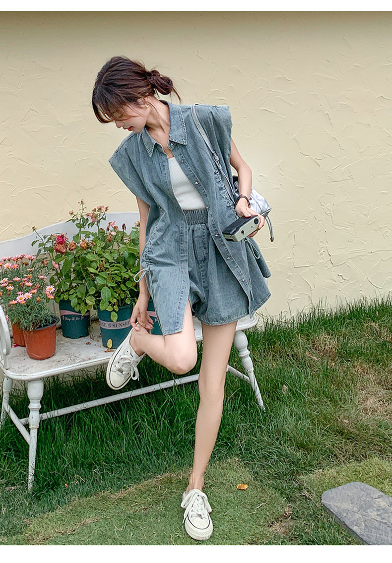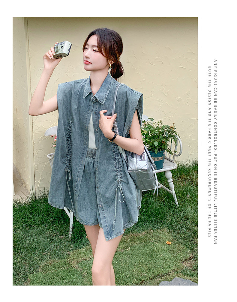 Blue Niche Design Denim Suit for Women, Summer 2025 New Korean Style Wrinkled Shirt Top and Shorts Two-Piece Set