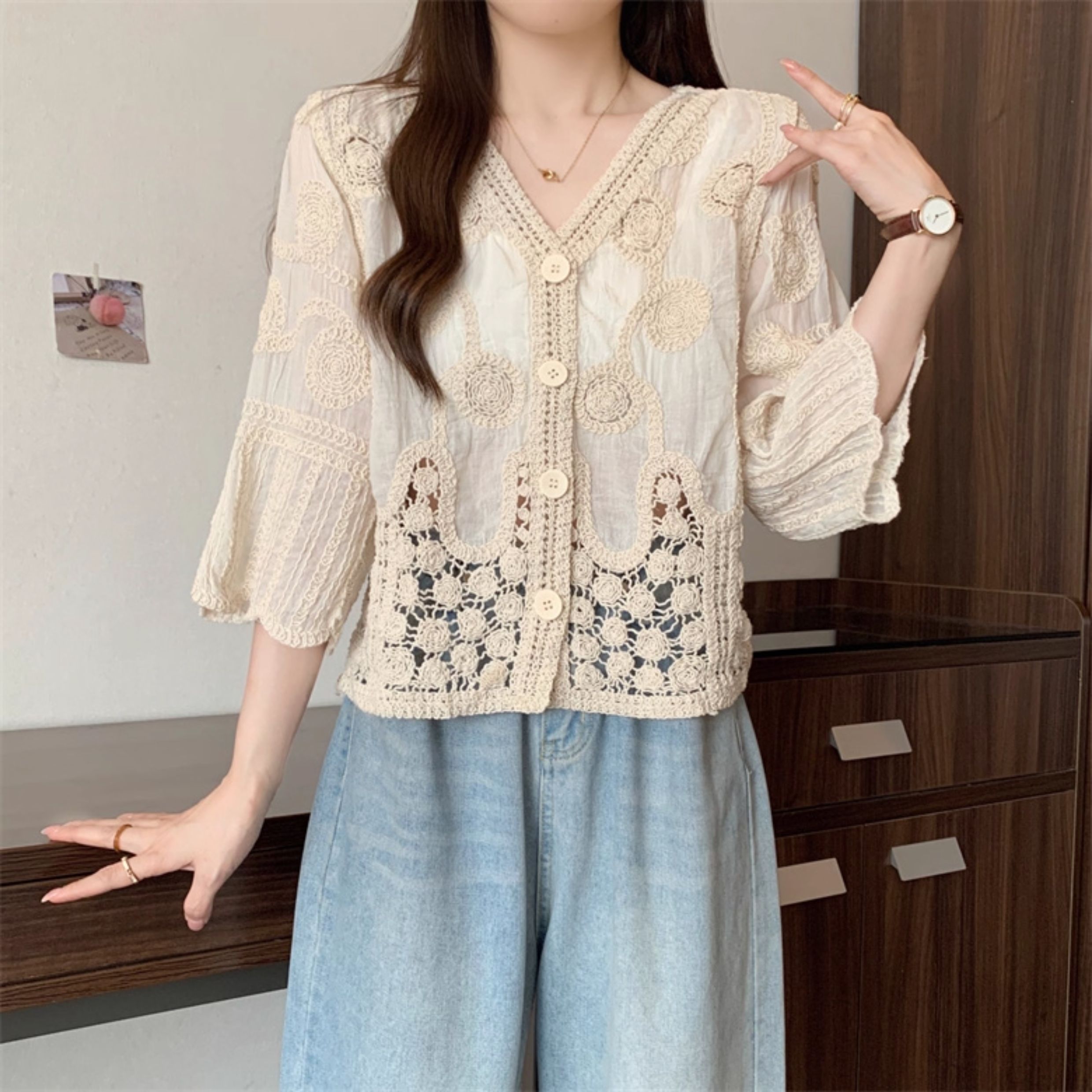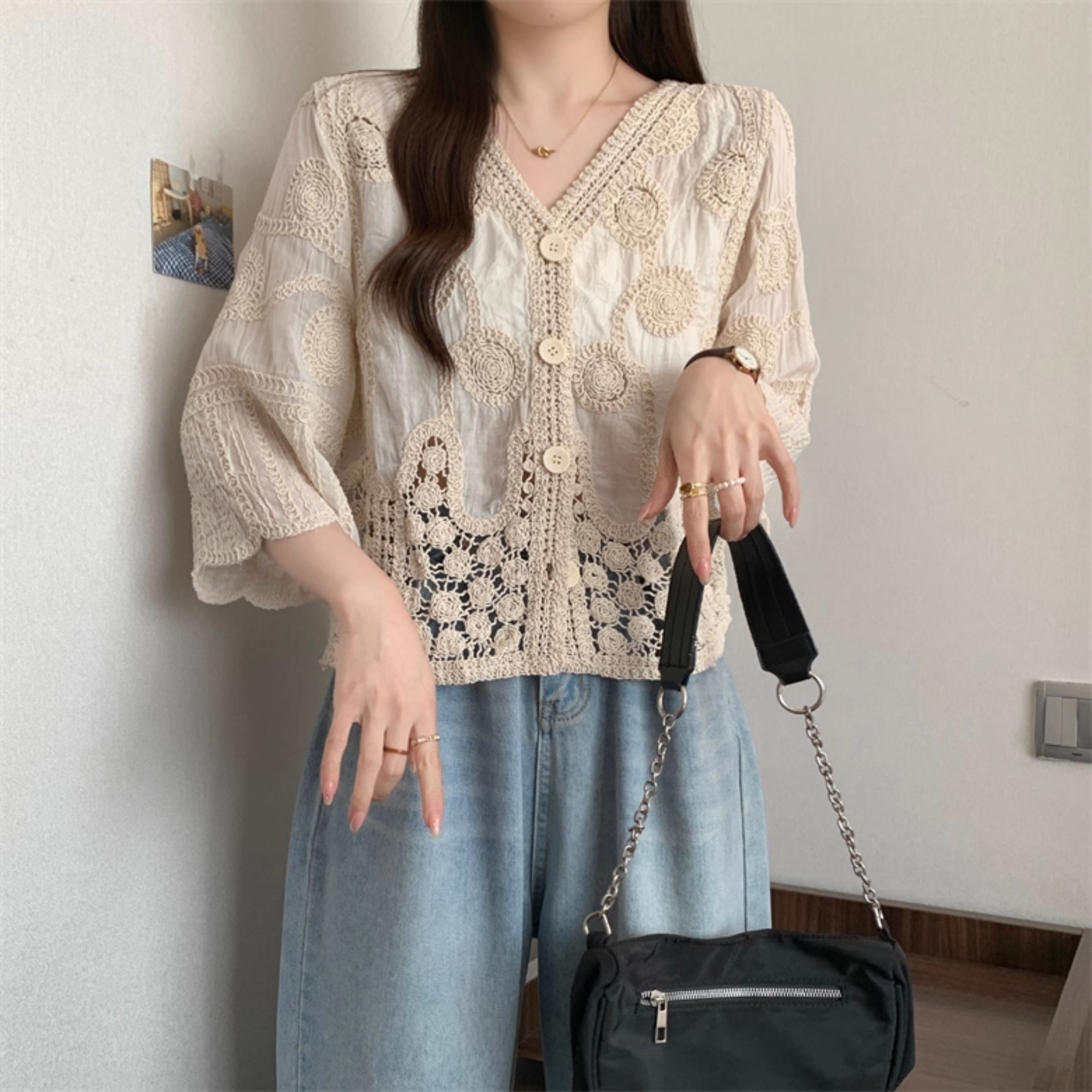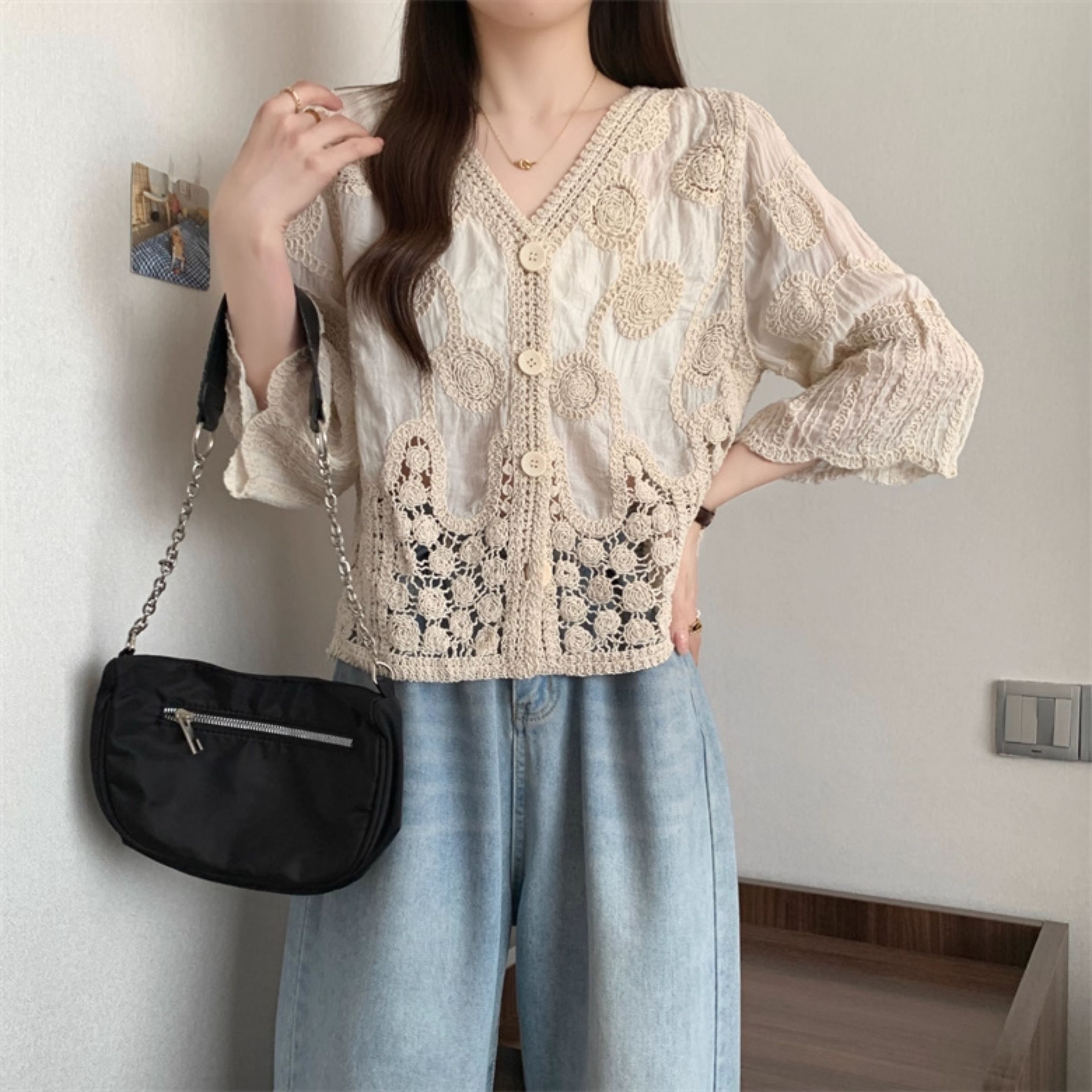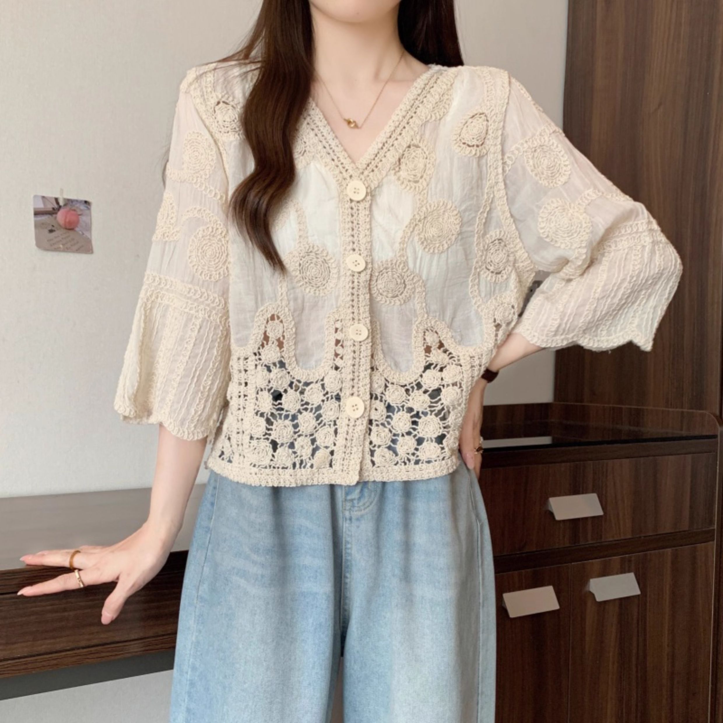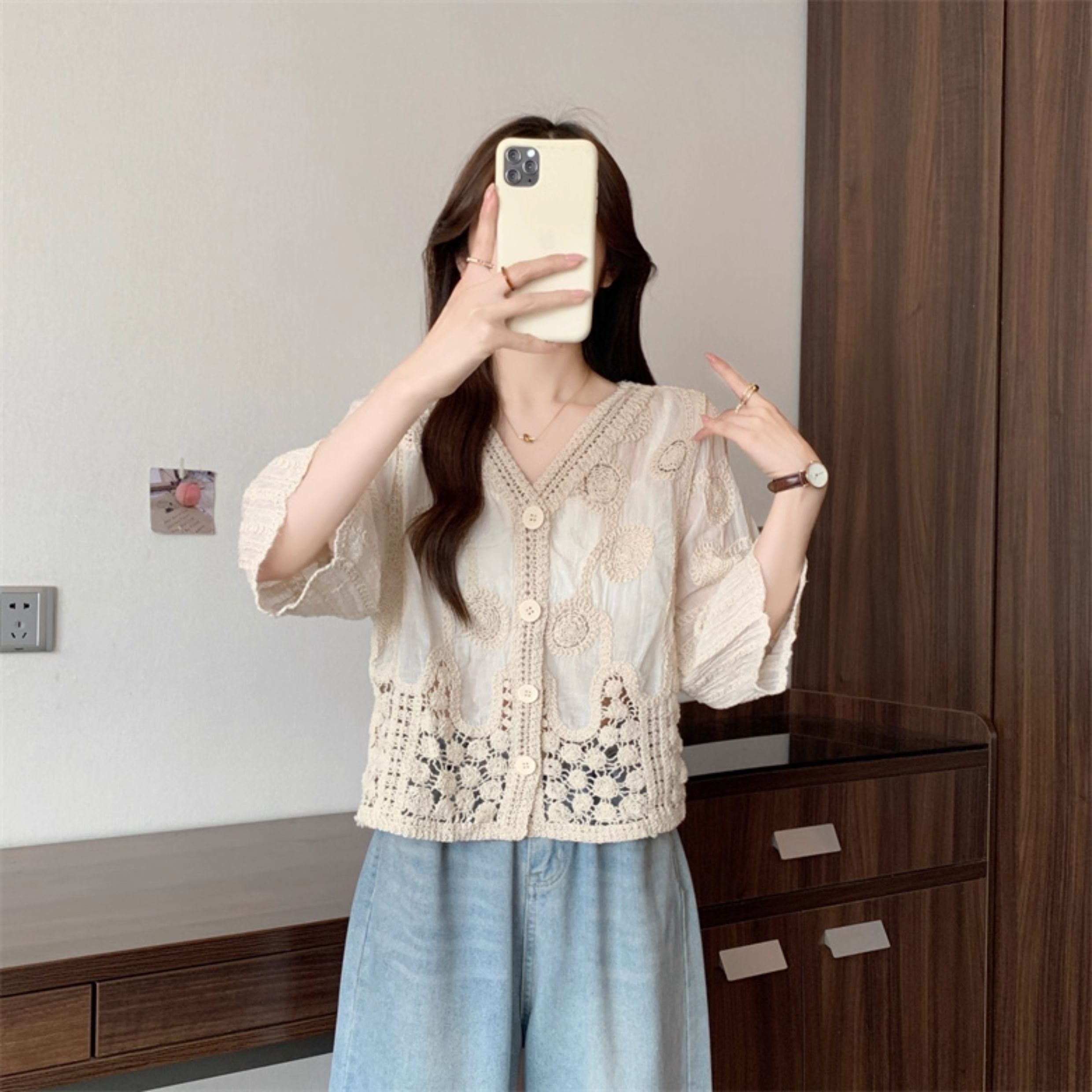 Trendy Crochet Hollow Lace Blouse 2025 Summer New Plus Size Women's Clothing for Curvy Women, Slimming Half-Sleeve Cardigan Top