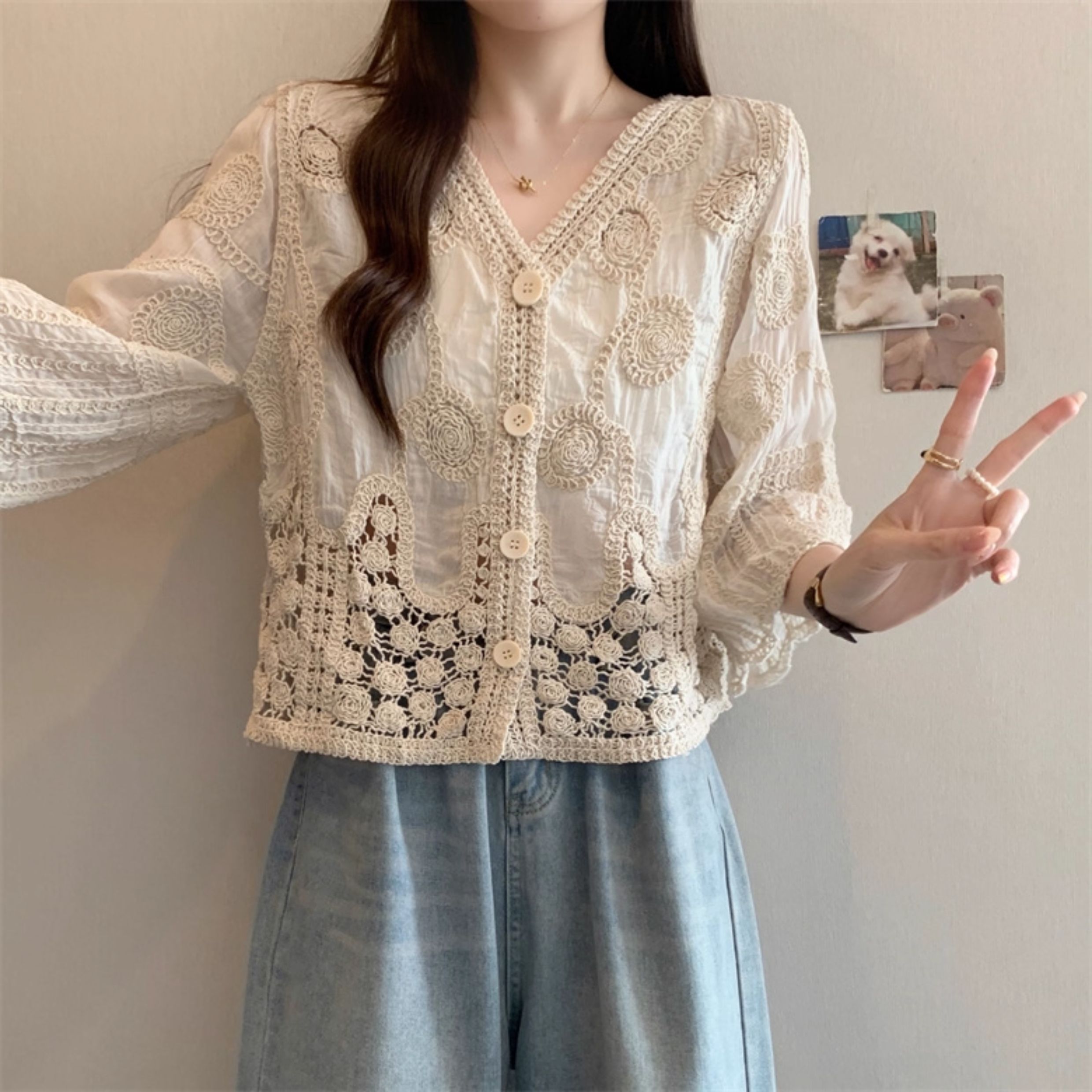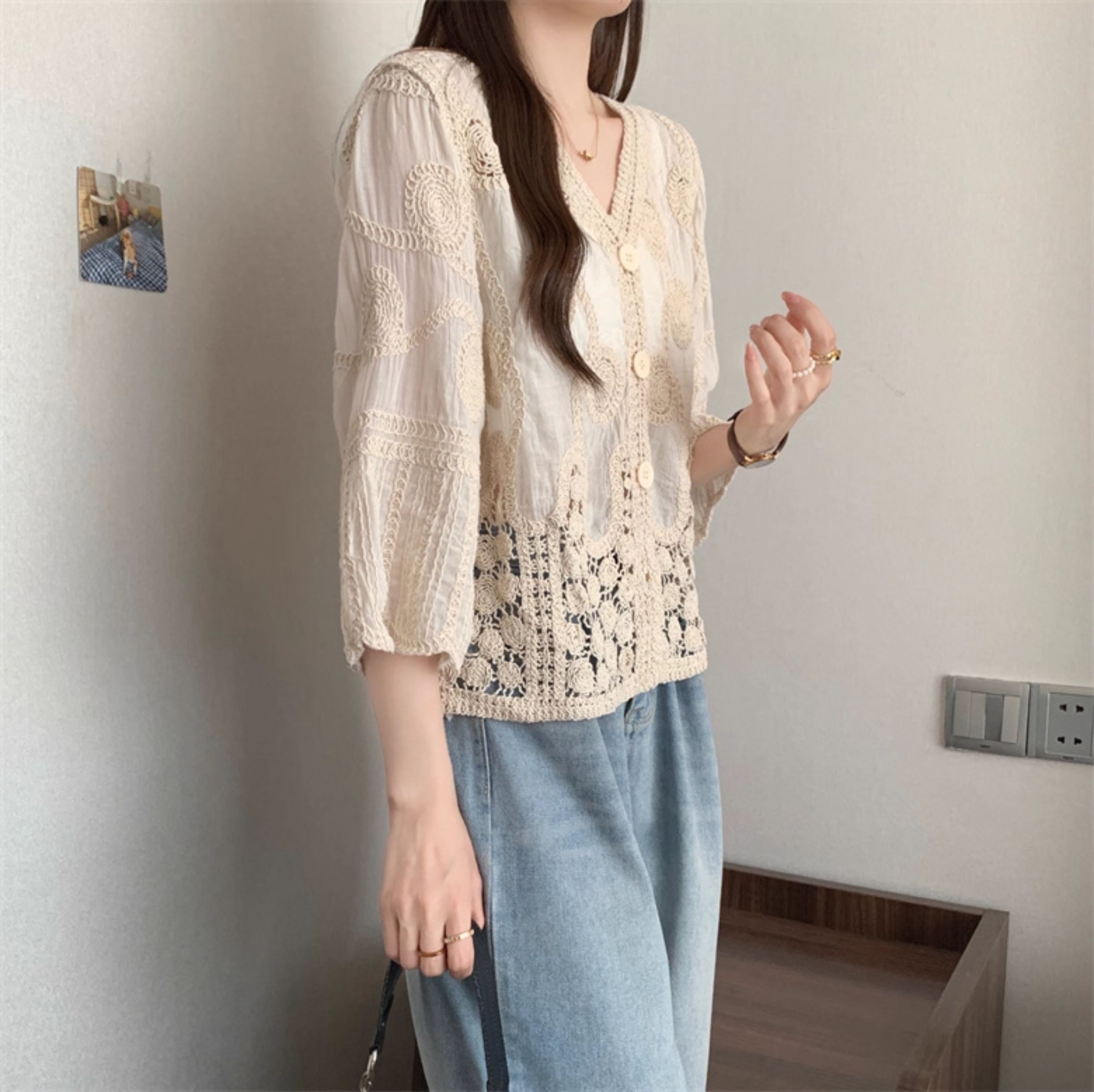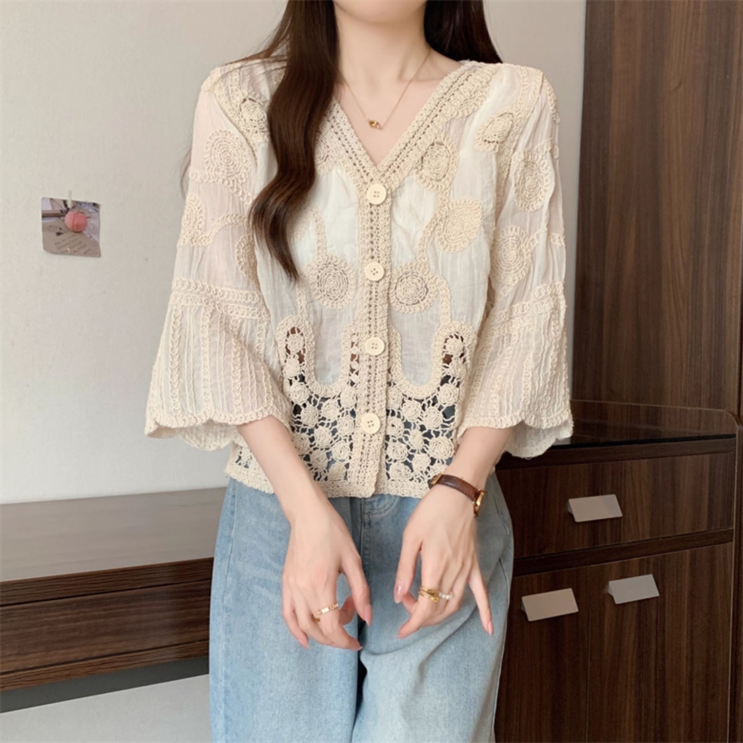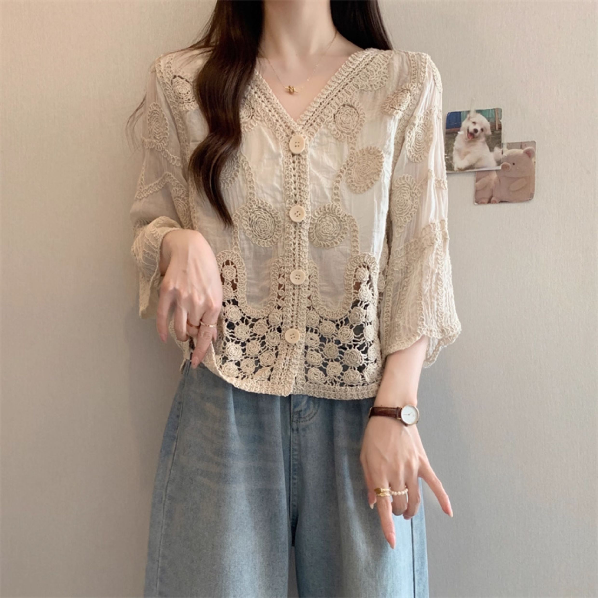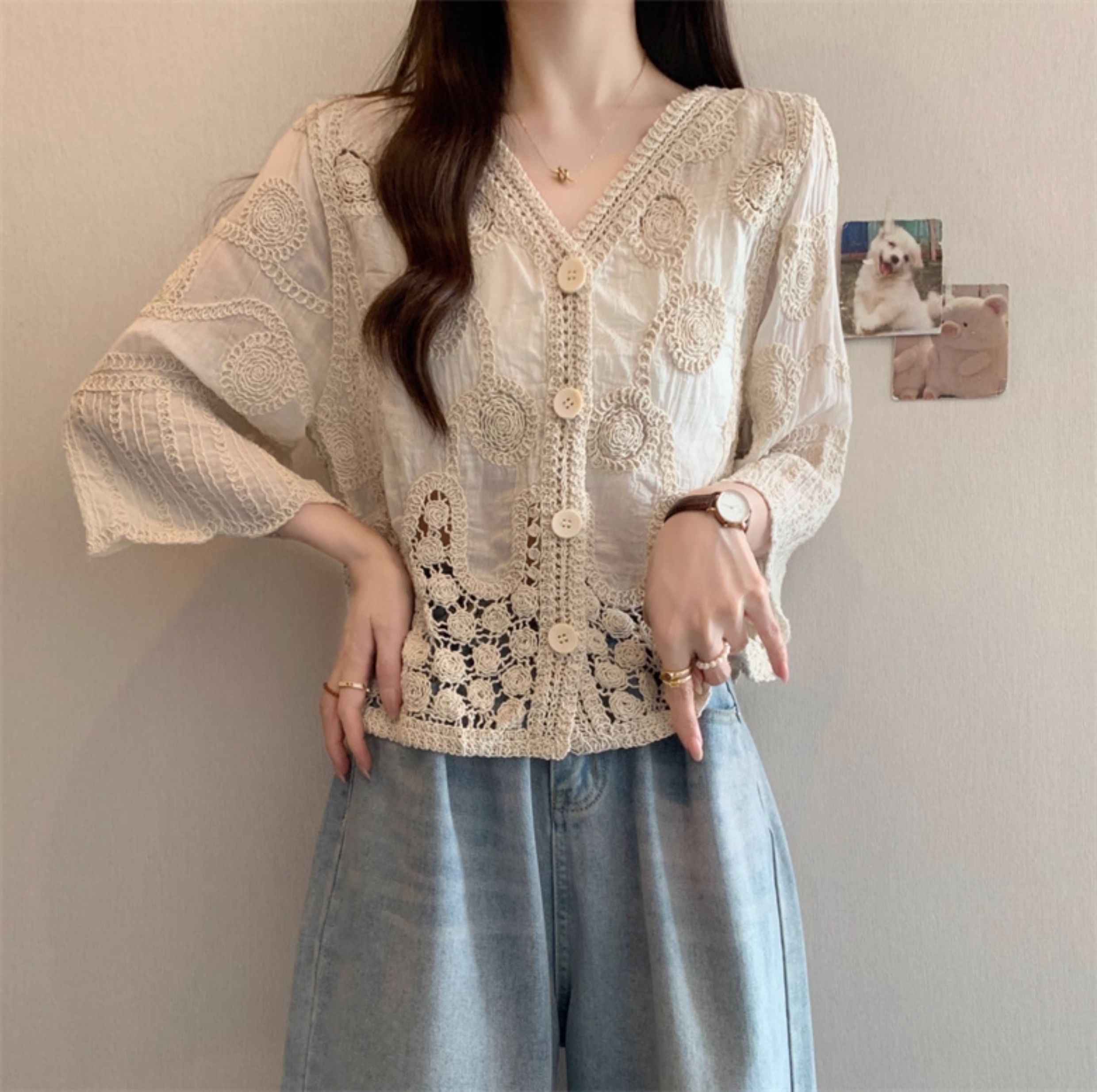 Trendy Crochet Hollow Lace Blouse 2025 Summer New Plus Size Women's Clothing for Curvy Women, Slimming Half-Sleeve Cardigan Top