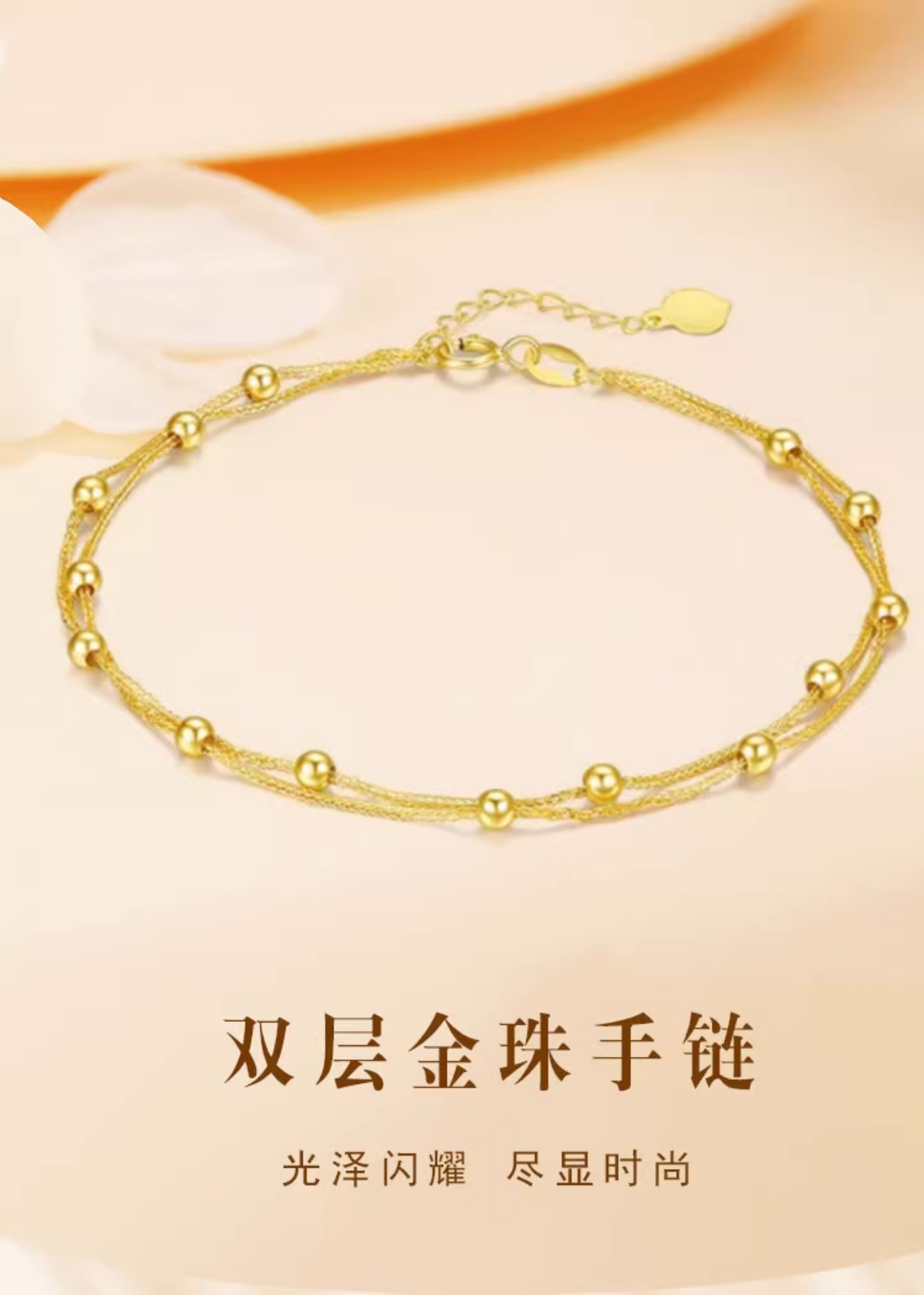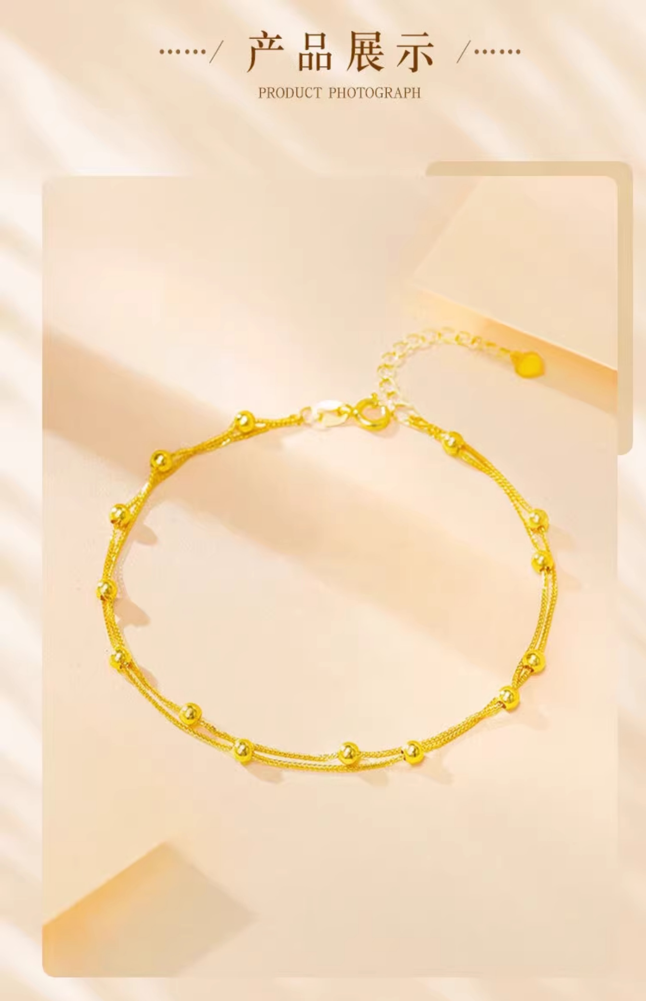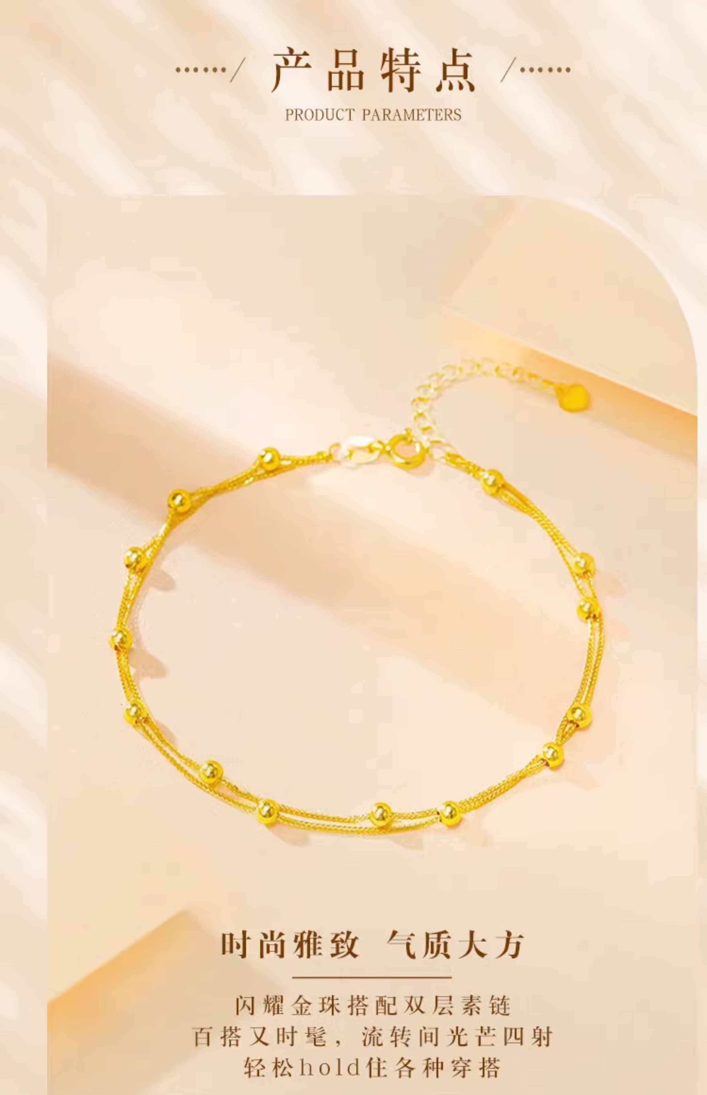 Chinese Gold 18K Double-Layer Gold Bead Bracelet for Women, Fortune Bead Plain Chain Bracelet, Holiday Birthday Gift for Girlfriend
