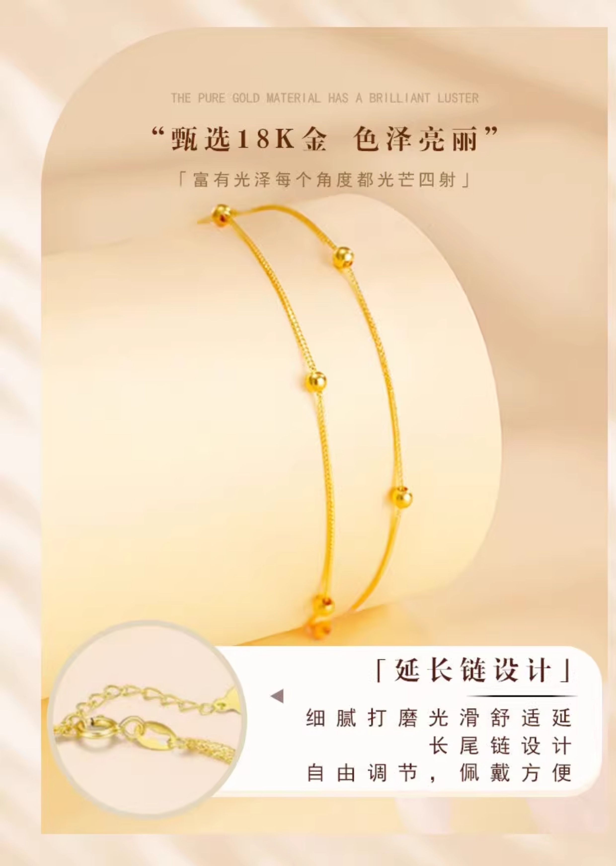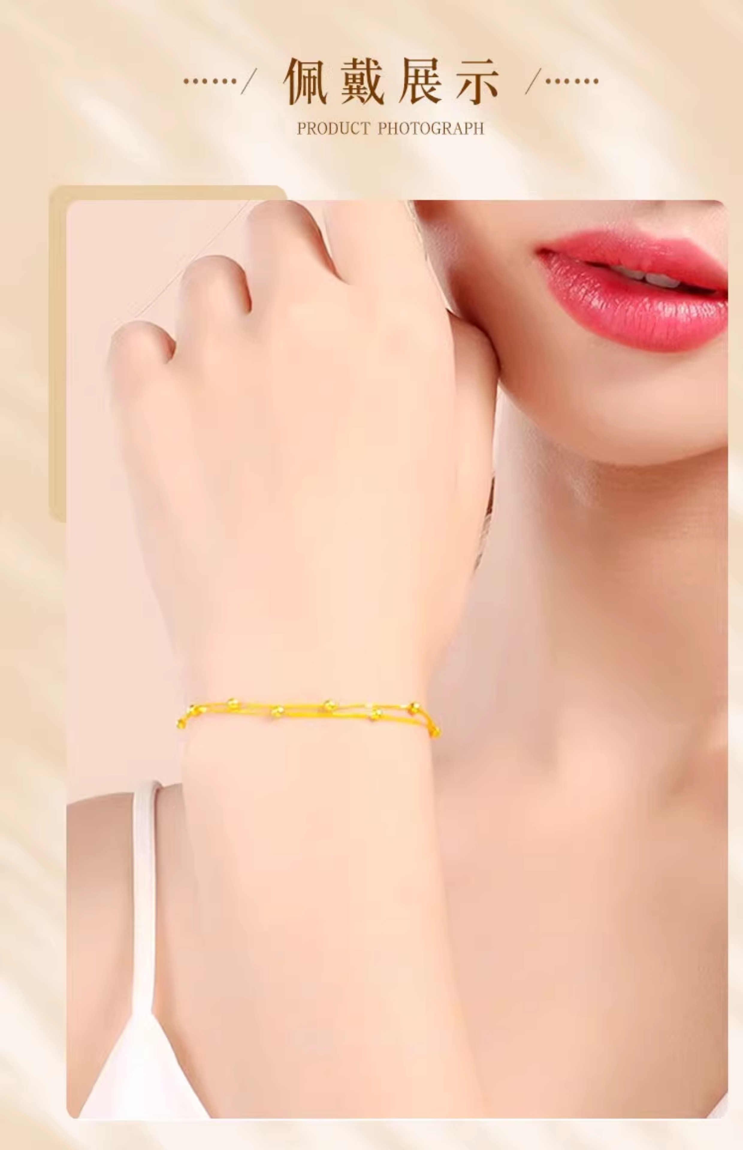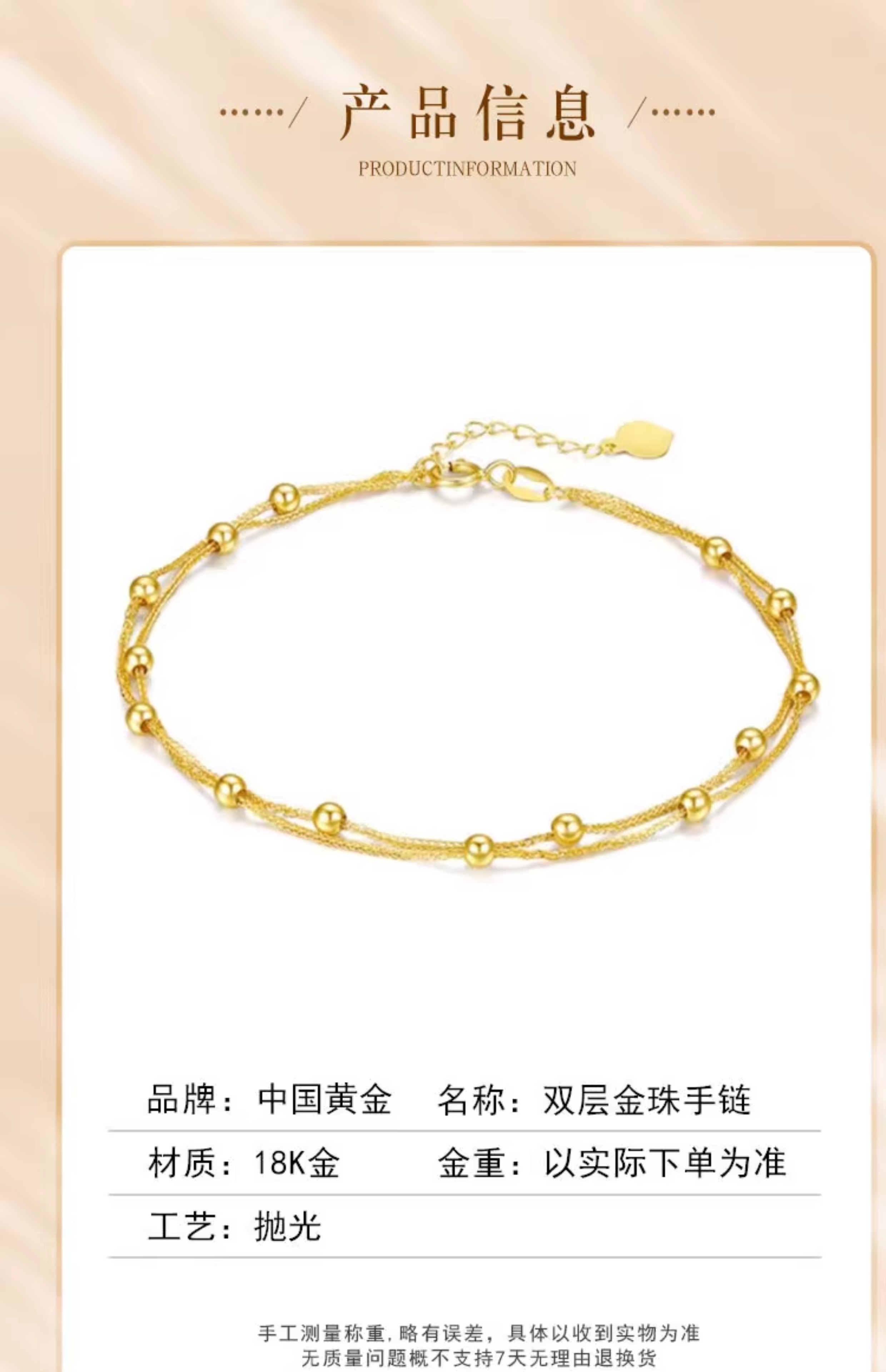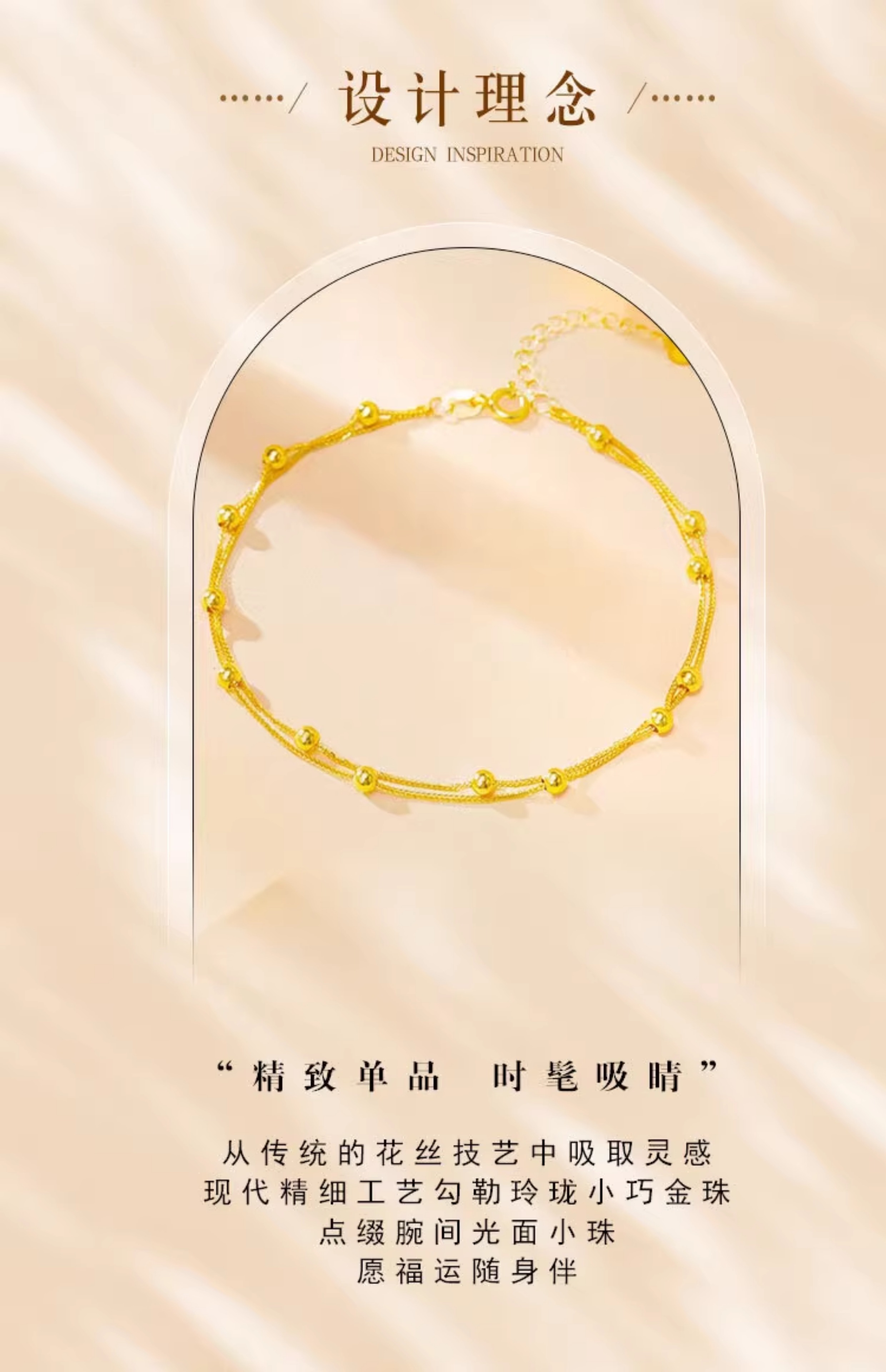 Chinese Gold 18K Double-Layer Gold Bead Bracelet for Women, Fortune Bead Plain Chain Bracelet, Holiday Birthday Gift for Girlfriend