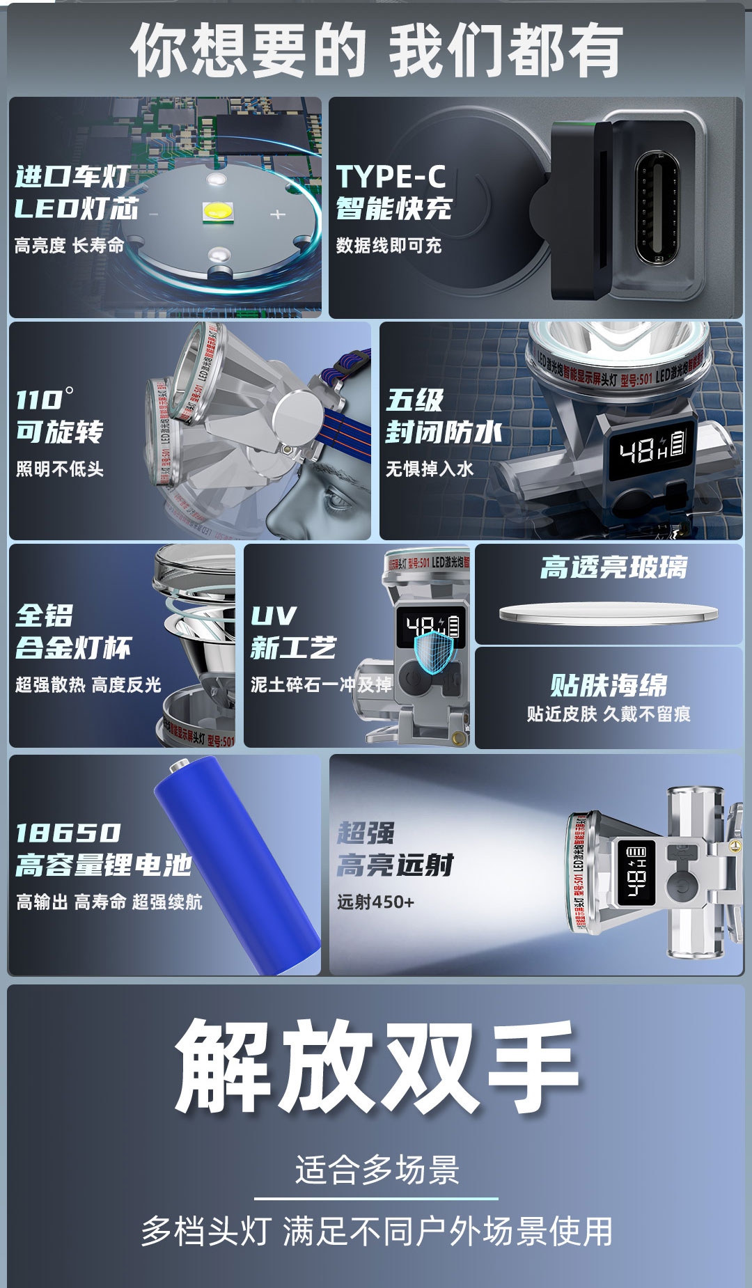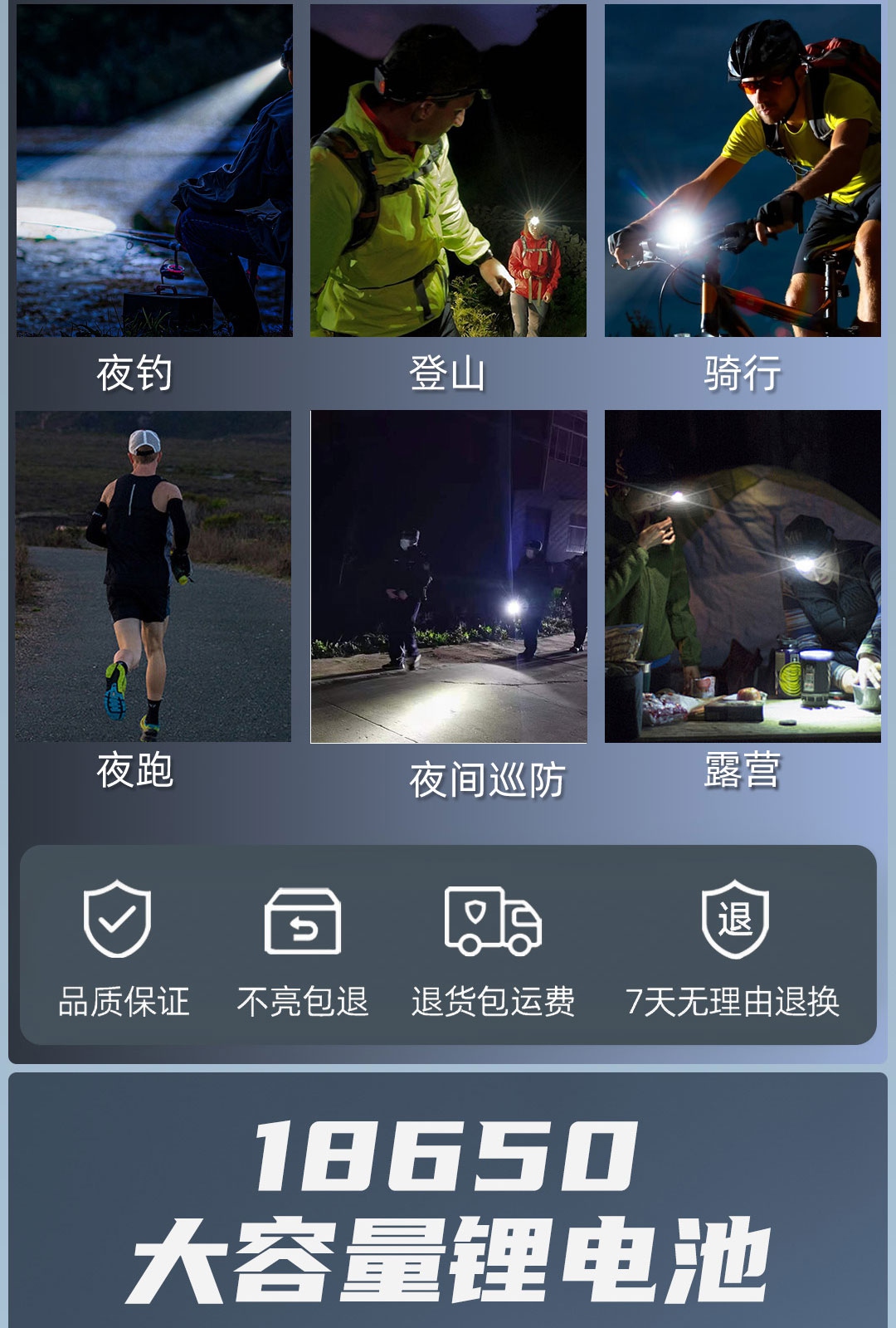 2025新款钓鱼头灯超长续航100小时强光超亮户外头戴式照明灯矿灯