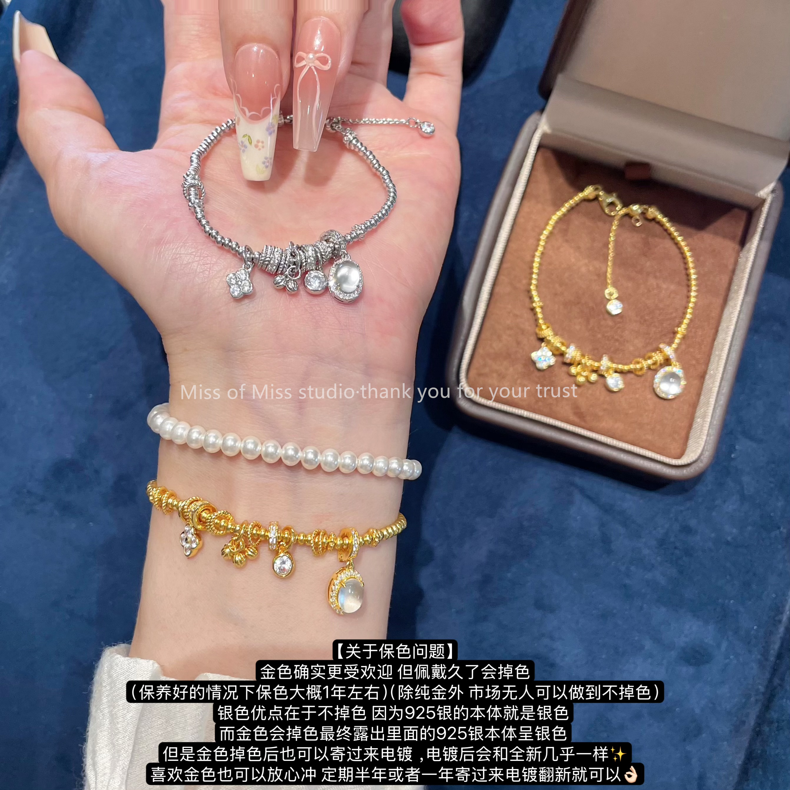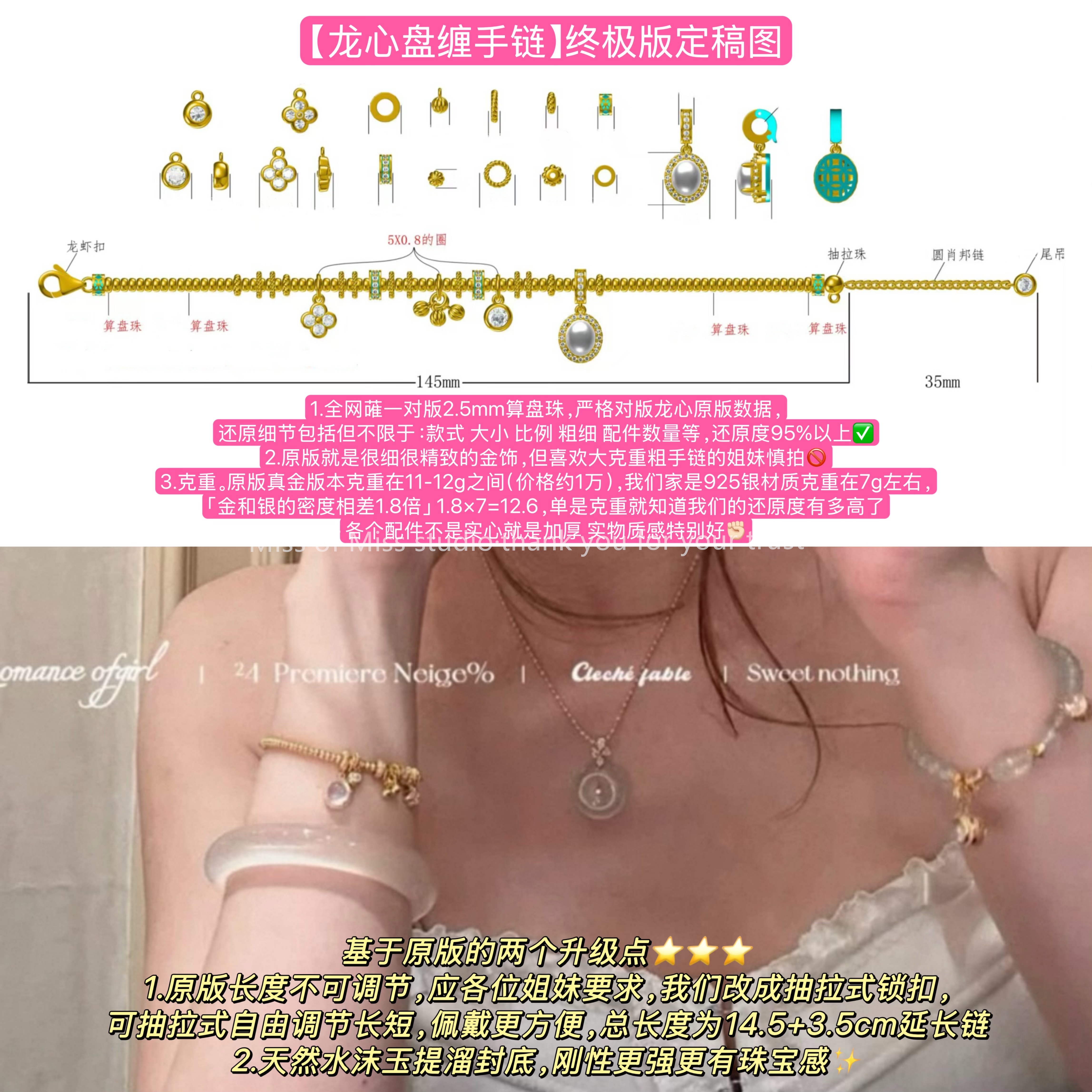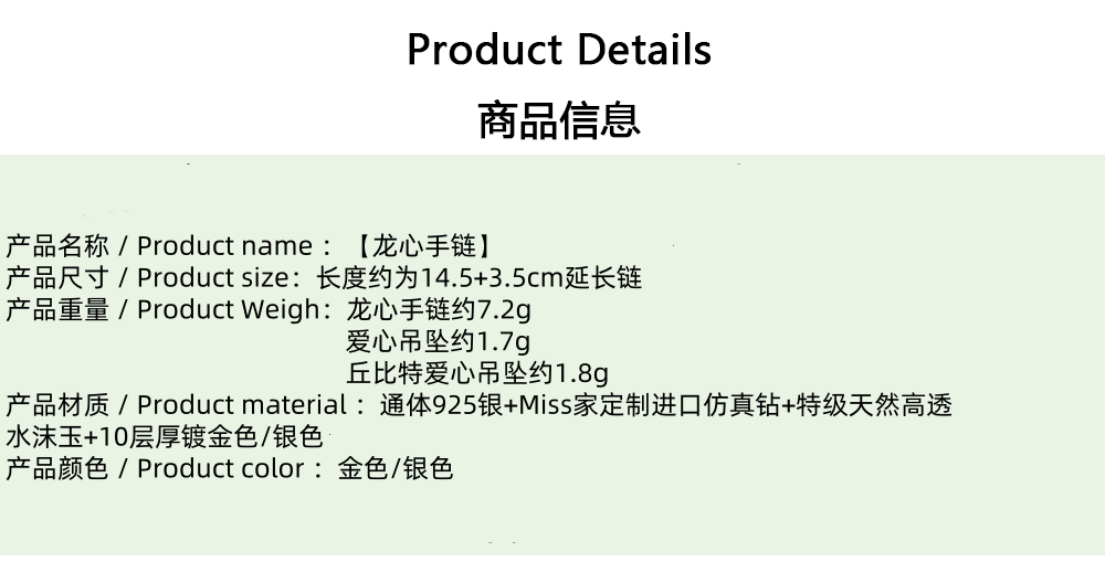 颜色分类 金色 龙心手链(通体925纯银),银色 龙心手链(通体925纯银),施家珍珠手链(通体925银),「龙心+丘比特爱心」金色手链,「龙心+爱心」金色手链,会不会掉色捏?,银饰售后