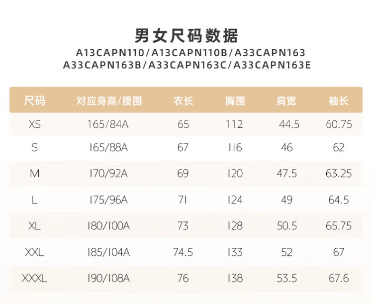 China (cm) 160-165/84-86 165-170 / 88-90 167-172 / 92-96 168-173 / 98-102 170-176 / 106-110