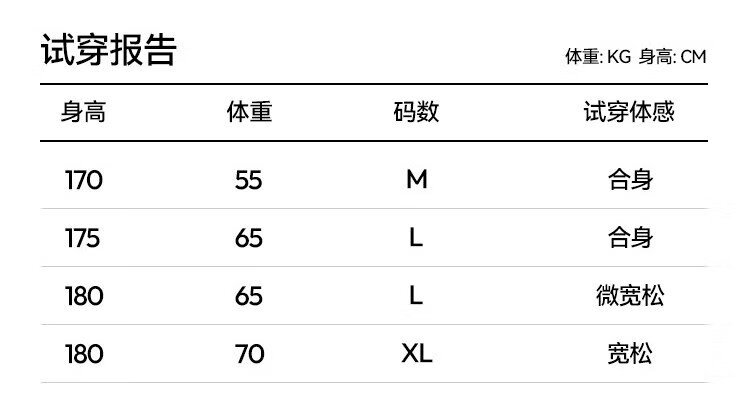 China (cm) 165 / 88-90 170 / 96-98 175 / 108-110 180 / 118-122 185 / 126-130