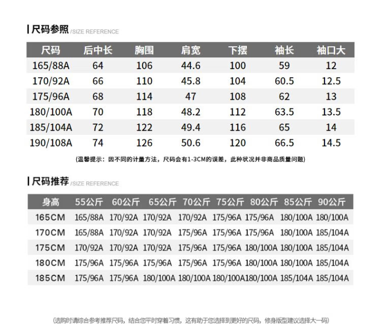 China (cm) 165 / 88-90 170 / 96-98 175 / 108-110 180 / 118-122 185 / 126-130