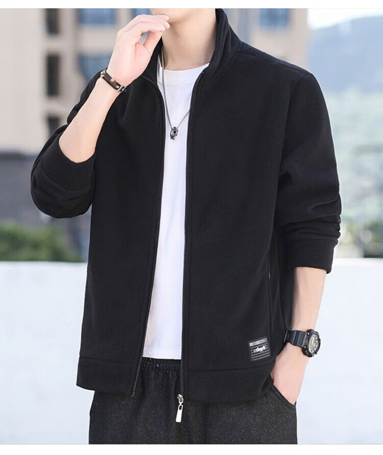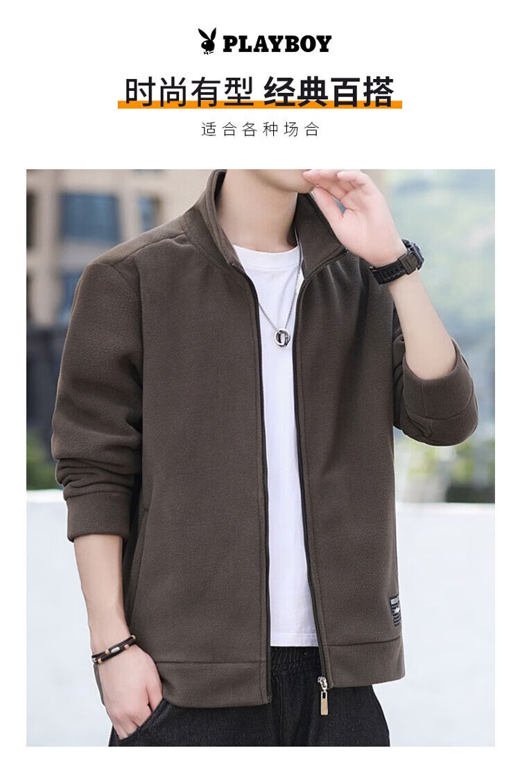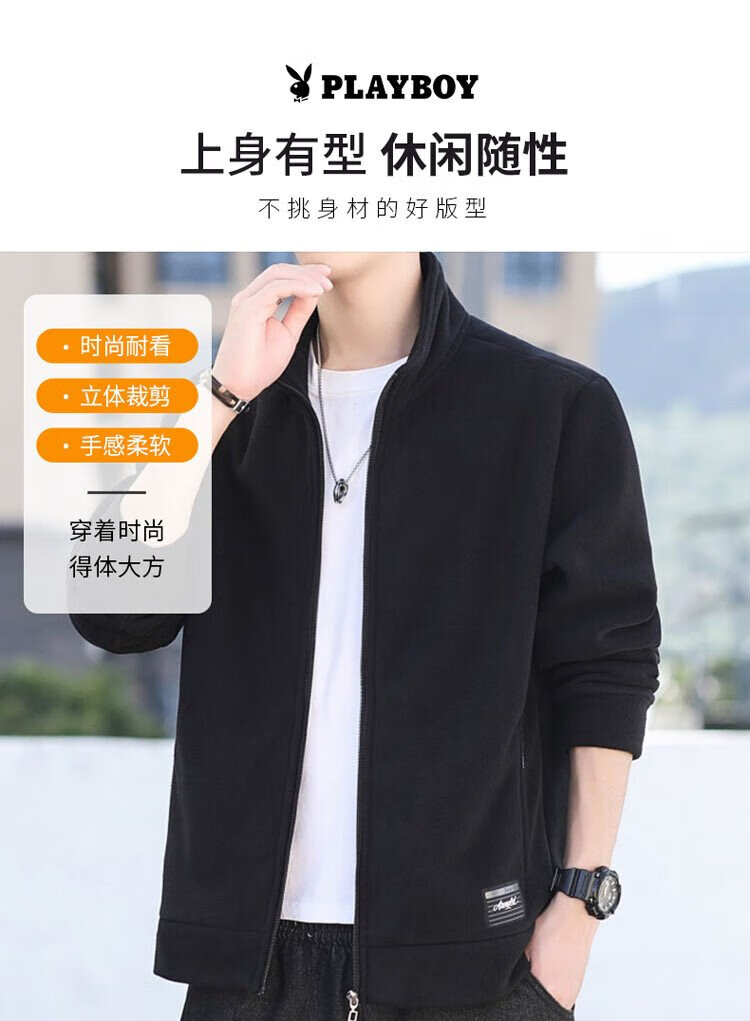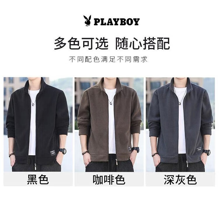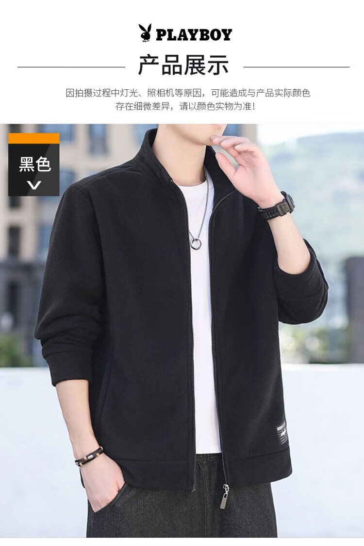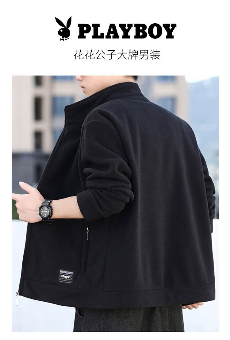 PLAYBOY Jacket Men's Jacket Men's Autumn and Winter Stand Collar Polar Fleece Loose Casual Top Black XL