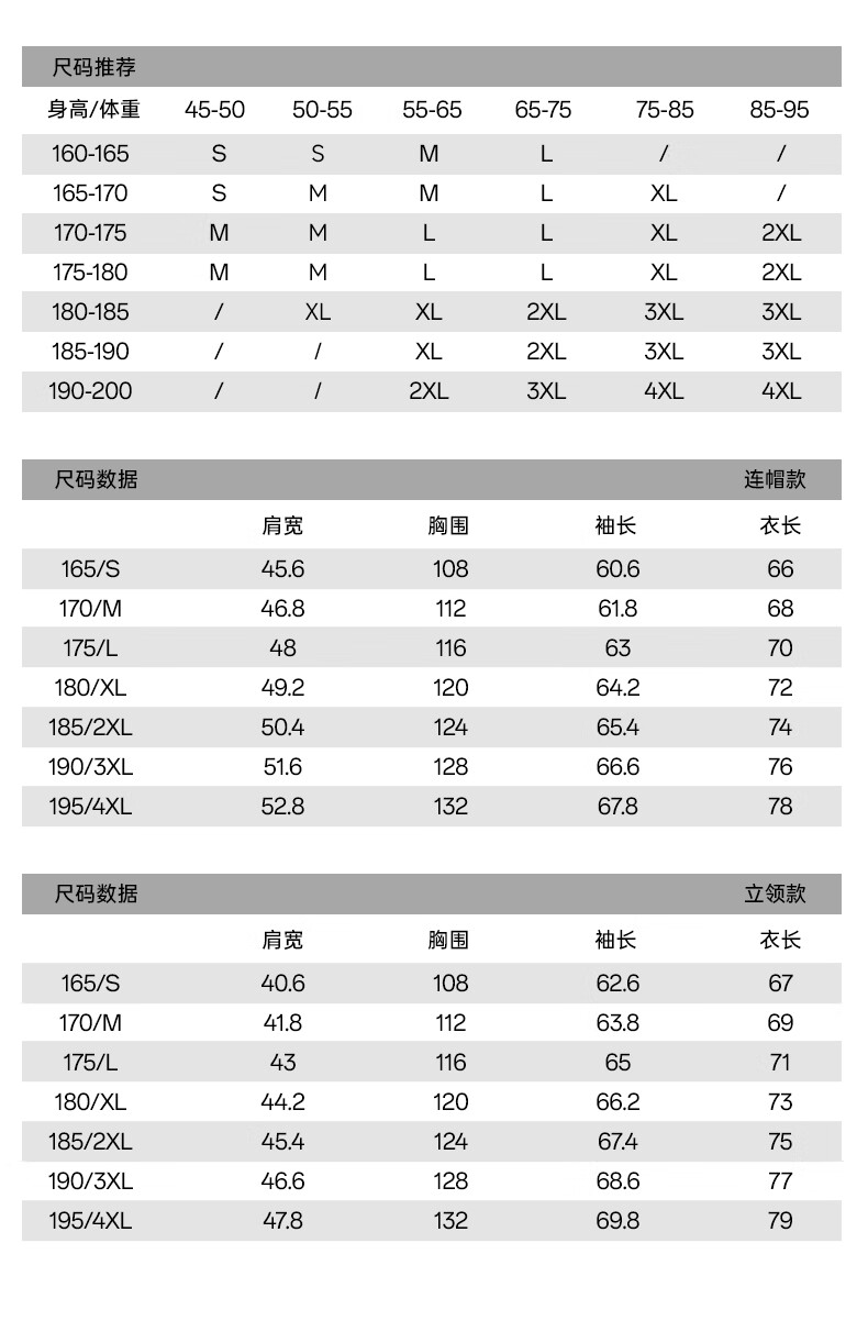 China (cm) 165 / 88-90 170 / 96-98 175 / 108-110 180 / 118-122 185 / 126-130