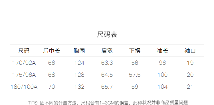 China (cm) 165 / 88-90 170 / 96-98 175 / 108-110 180 / 118-122 185 / 126-130
