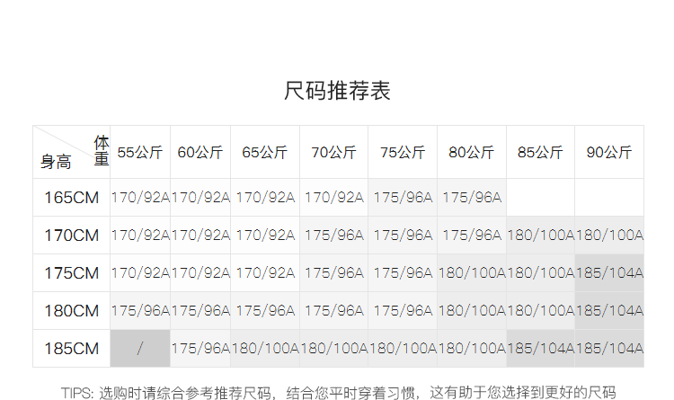 China (cm) 160-165/84-86 165-170 / 88-90 167-172 / 92-96 168-173 / 98-102 170-176 / 106-110