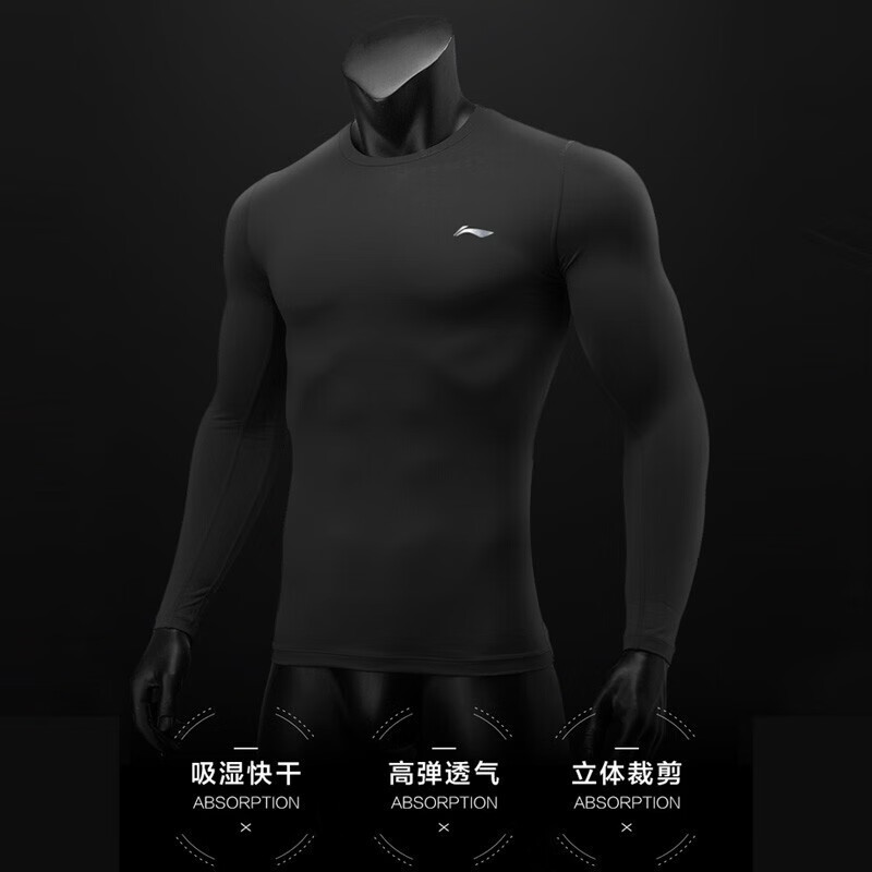 Li Ning tights men's long-sleeved fitness clothes warm basketball training running suit plus velvet quick-drying high elastic compression top black L