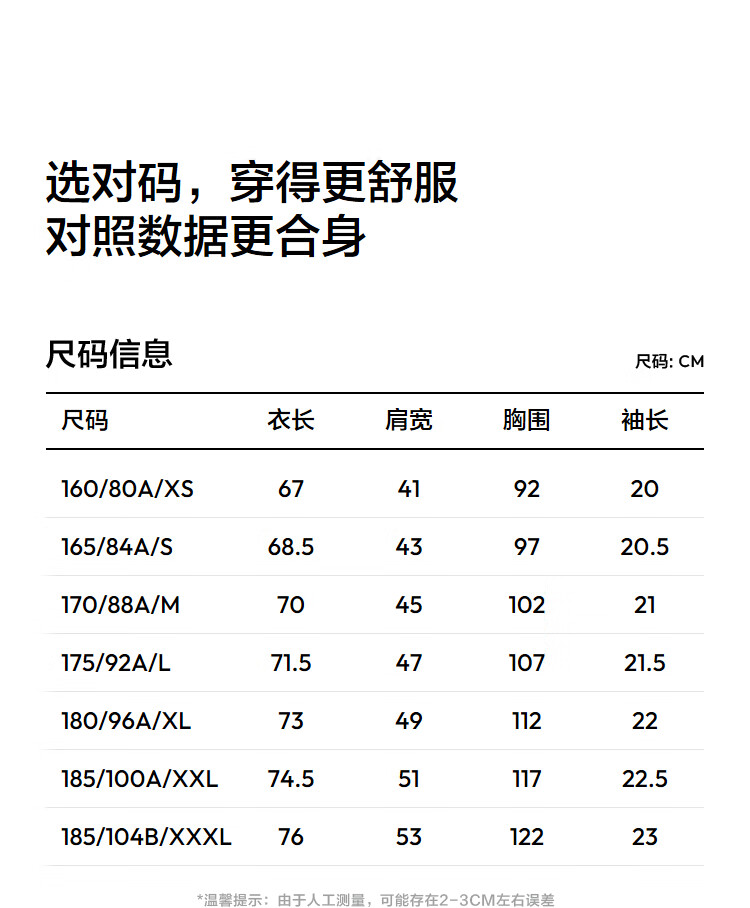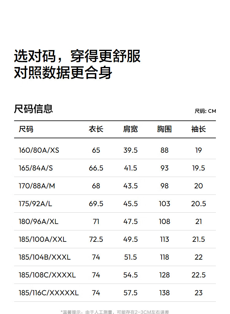 China (cm) 160-165/84-86 165-170 / 88-90 167-172 / 92-96 168-173 / 98-102 170-176 / 106-110