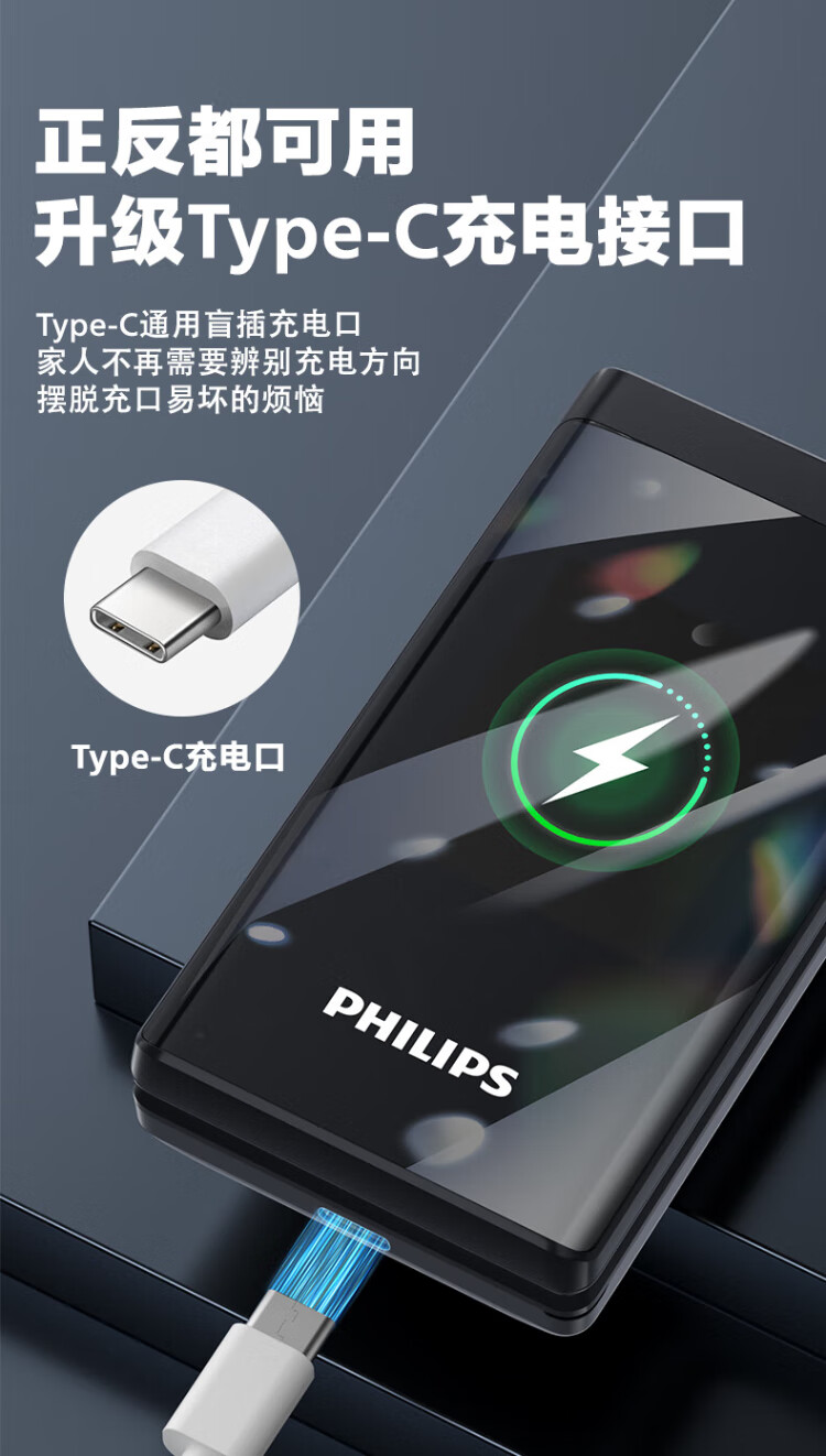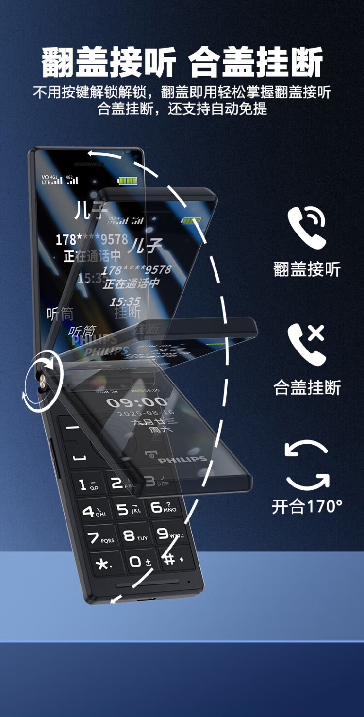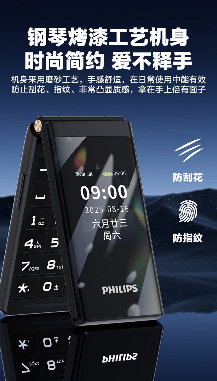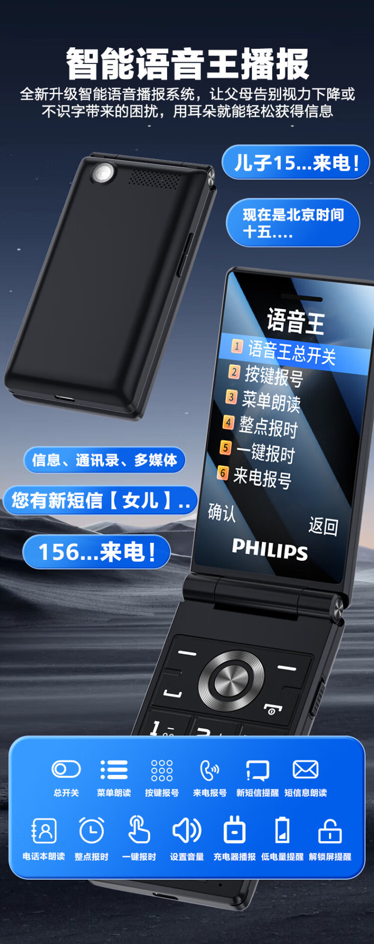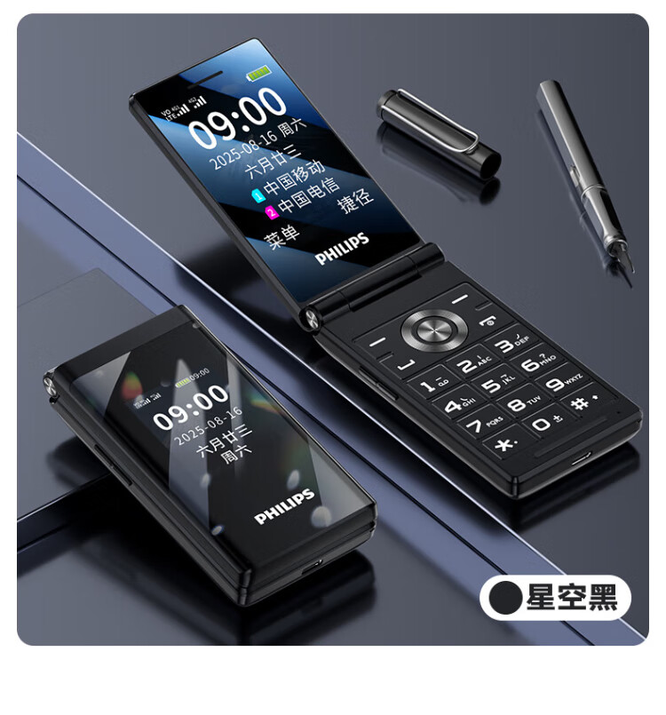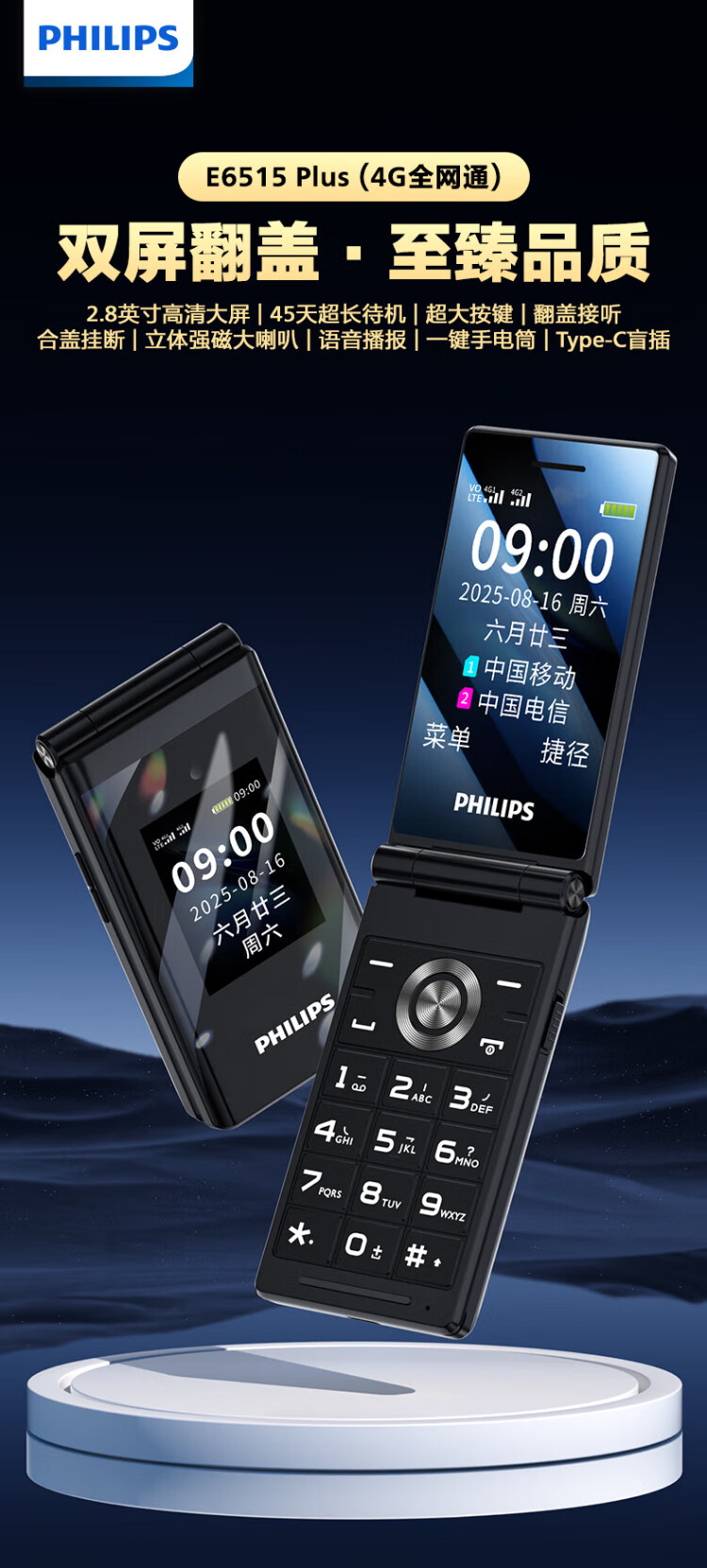 Philips (PHILIPS) E6515Plus mobile phone for the elderly, super long standby, flip phone for the elderly, 4G full network communication, big characters, big sound, big buttons, student dual-screen functional phone for the elderly, Starry Sky Black