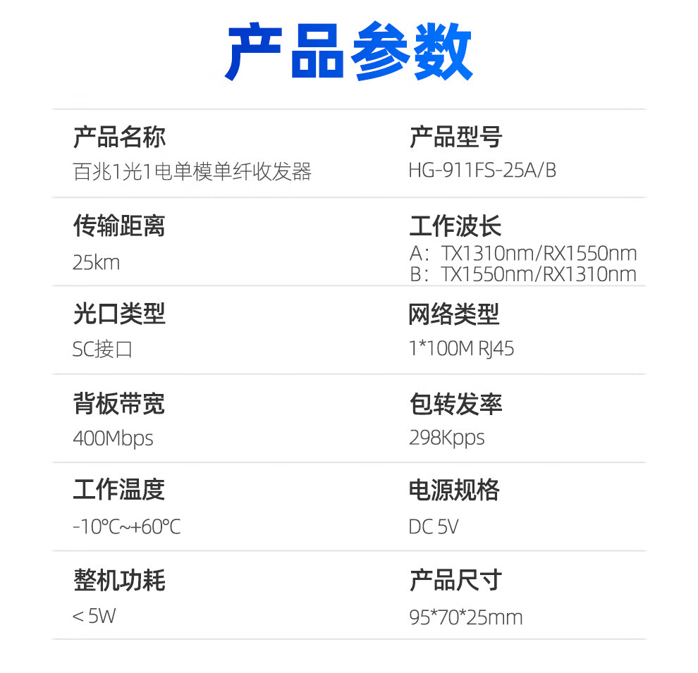 Huigu 100M fiber optic transceiver single-mode single-fiber photoelectric converter SC interface 25km commercial grade 1 price HG-911FS-25A/B
