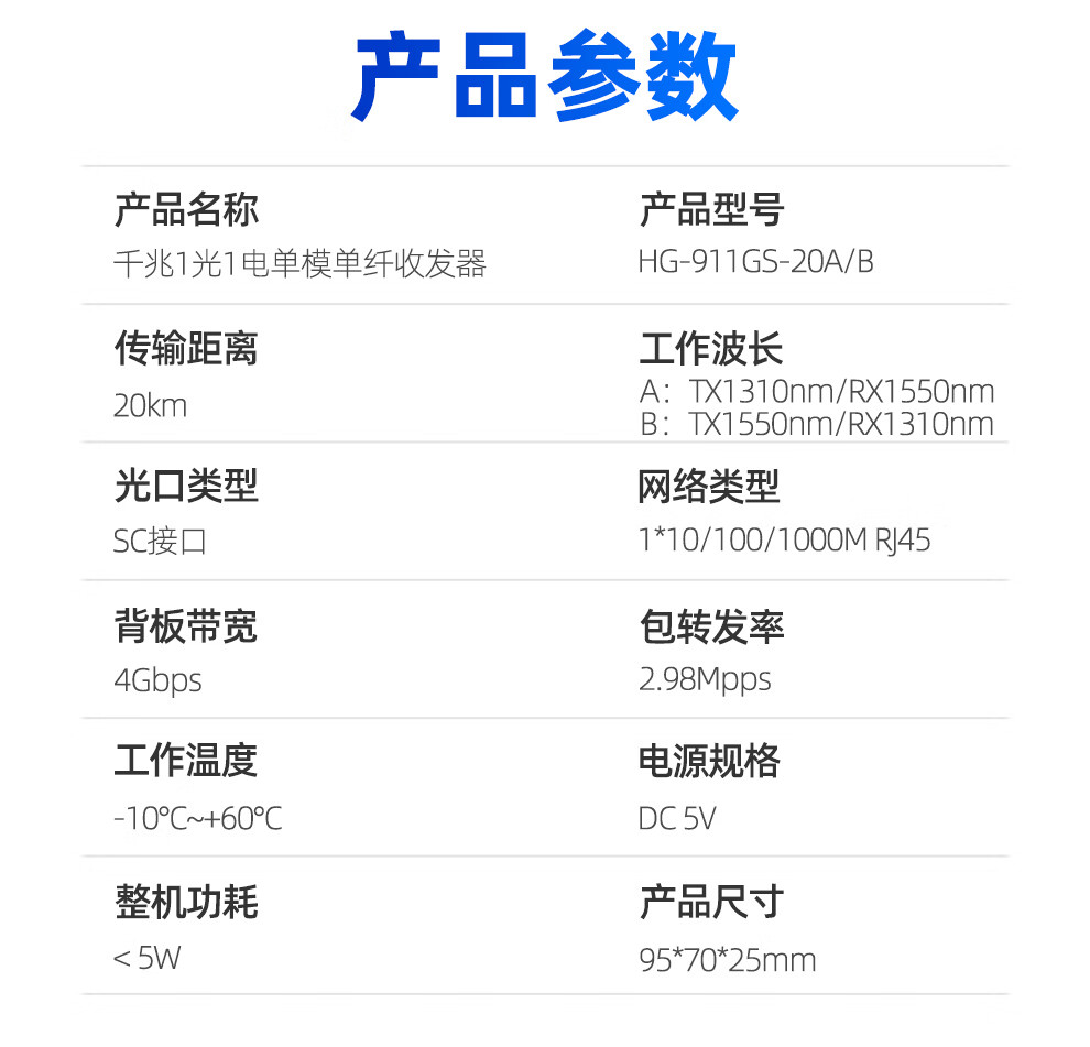 Huigu Gigabit fiber optic transceiver single-mode single-fiber photoelectric converter SC interface 20km commercial grade 1 price HG-911GS-20A/B